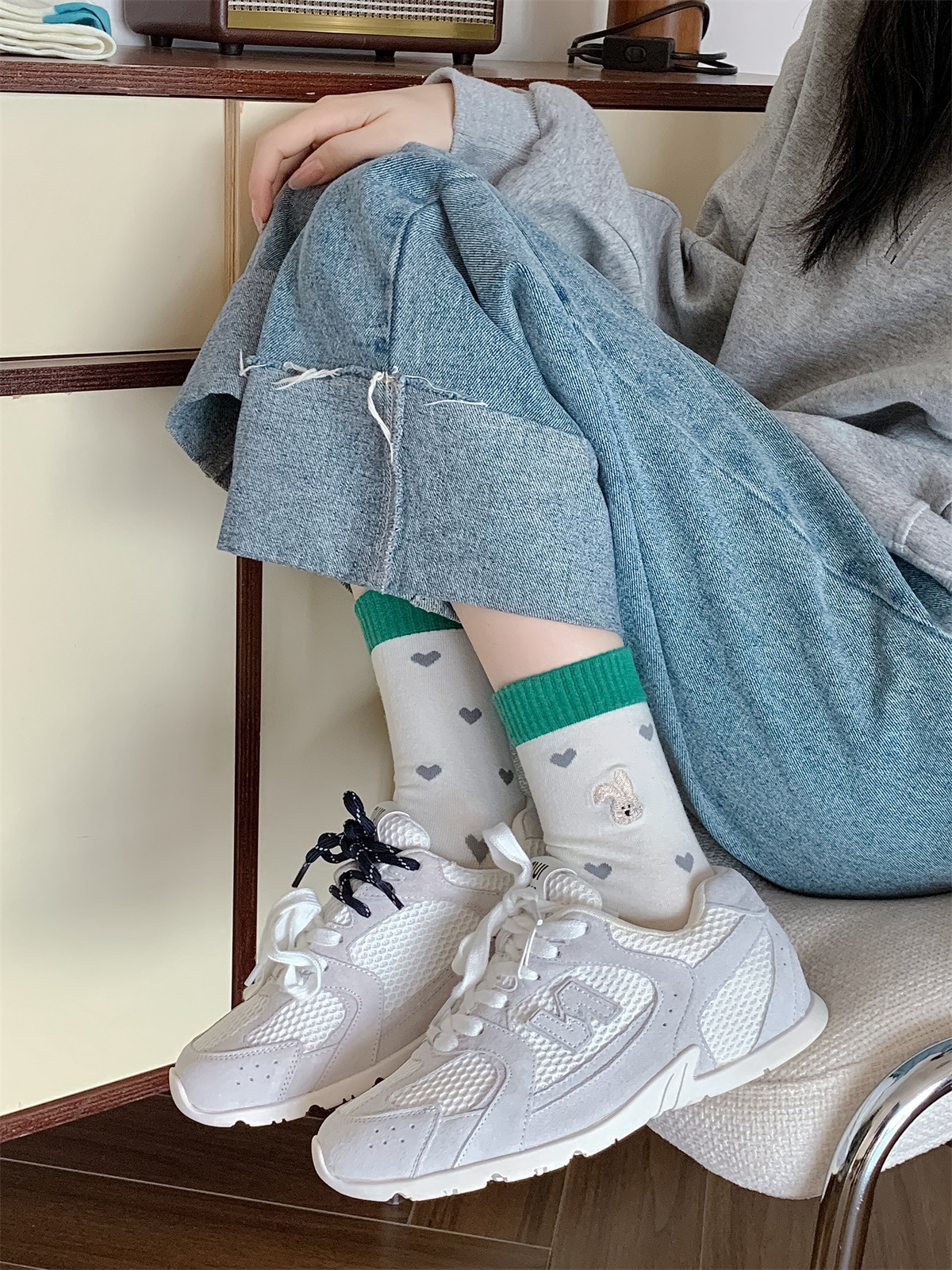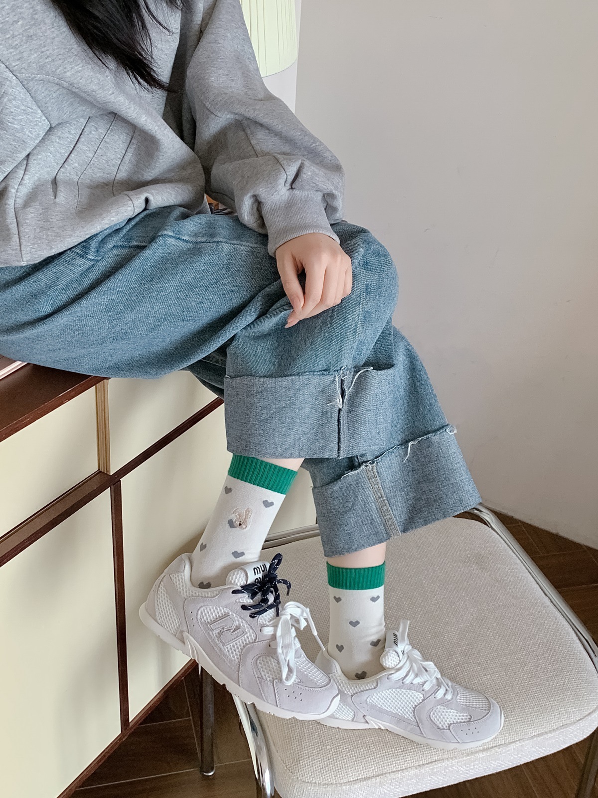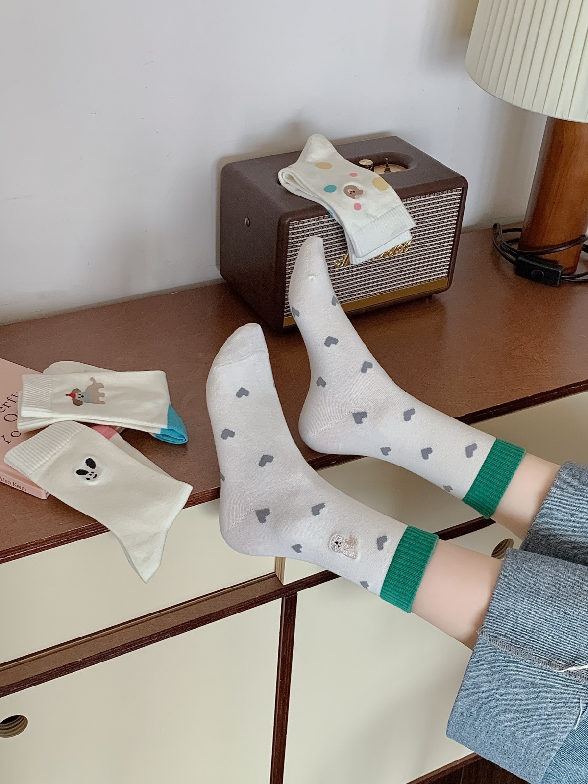 25 봄 새로운 만화 수놓은 동물 머리 중간 양말 여성용 Ins 유행 일본 귀여운 강아지 폴카 도트 면 양말