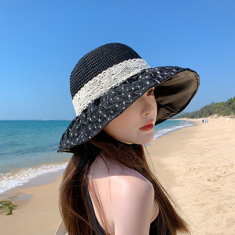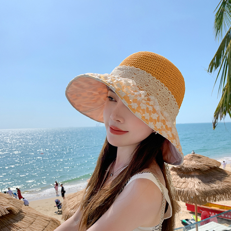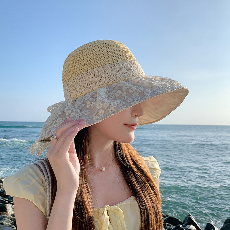 여름 새로운 레이스 리본 어부 모자 간단한 활 바느질 선 스크린 모자 여성의 큰 림 통기성 햇빛 모자
