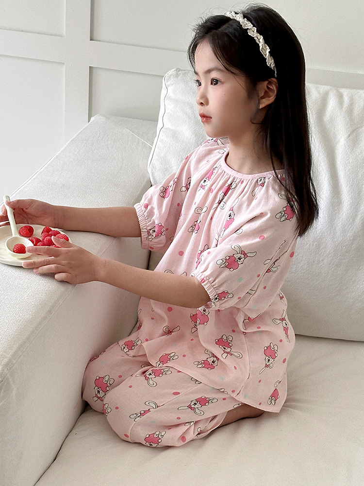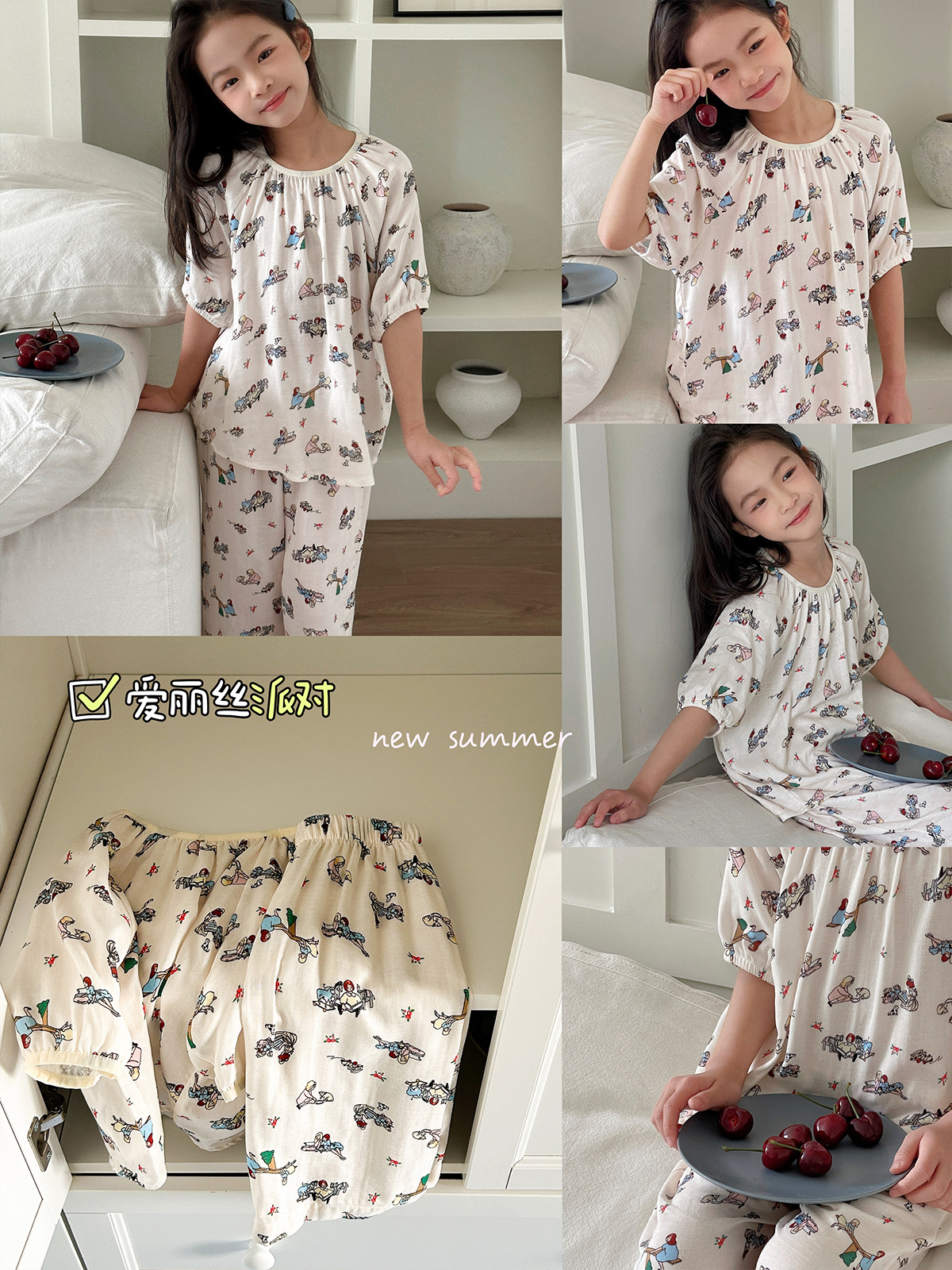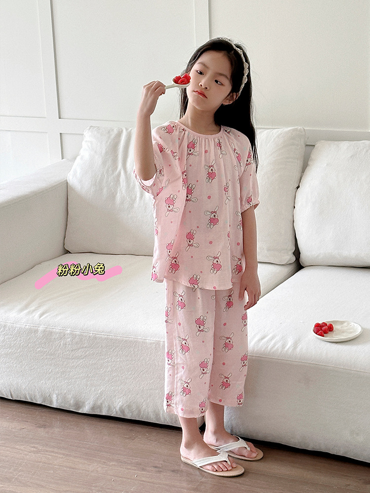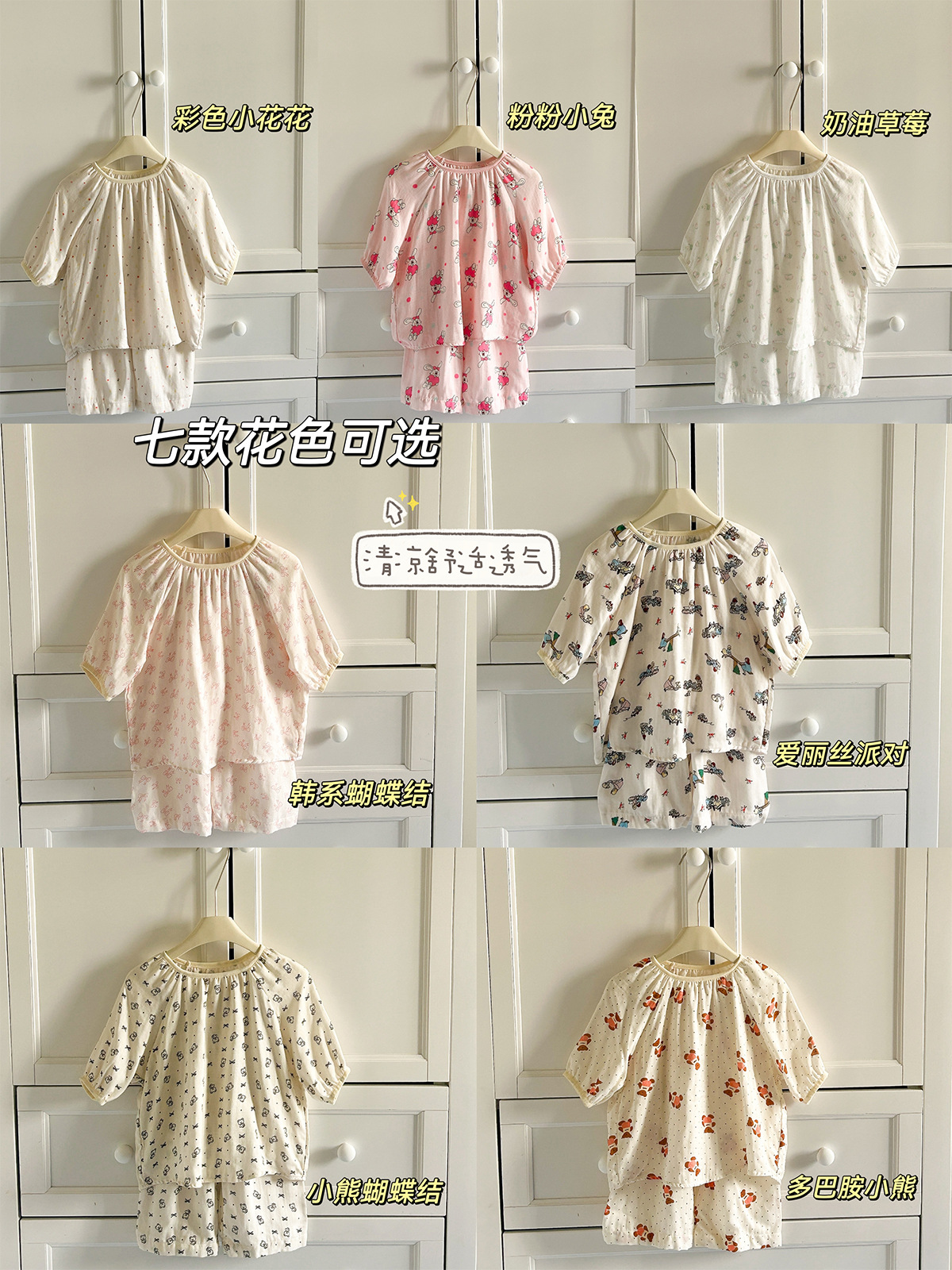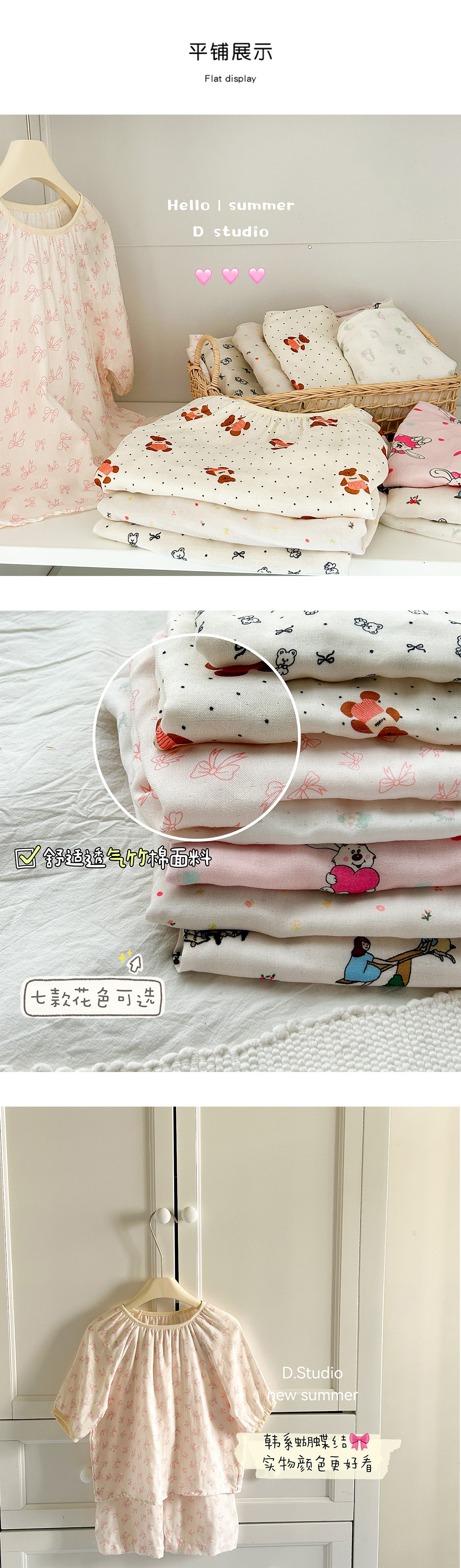 2025 어린이용 대나무 면 홈웨어 세트 여름 얇은 통기성 여자 아이 에어컨 옷 아기 한국 스타일 잠옷 반팔스토어 가기