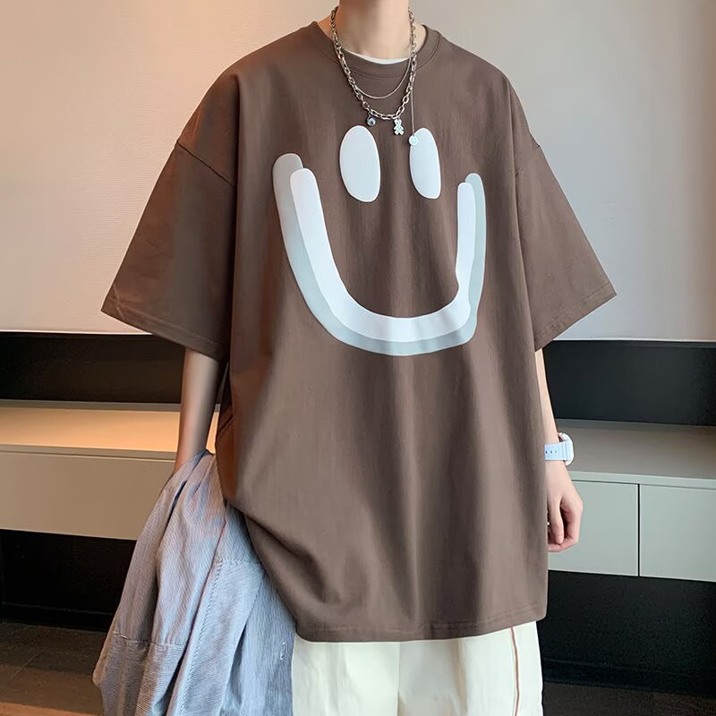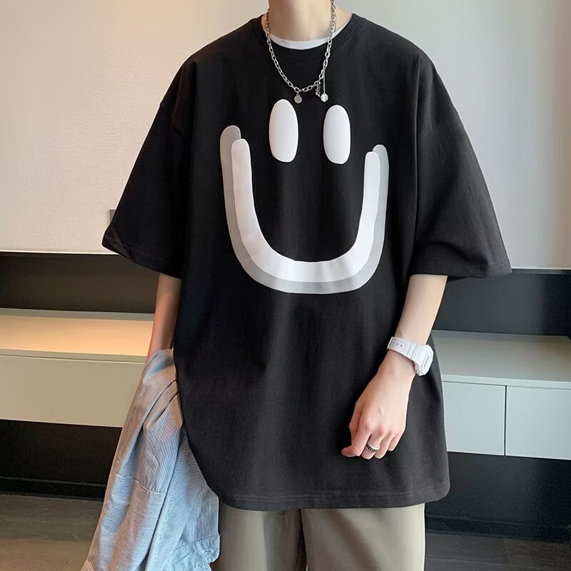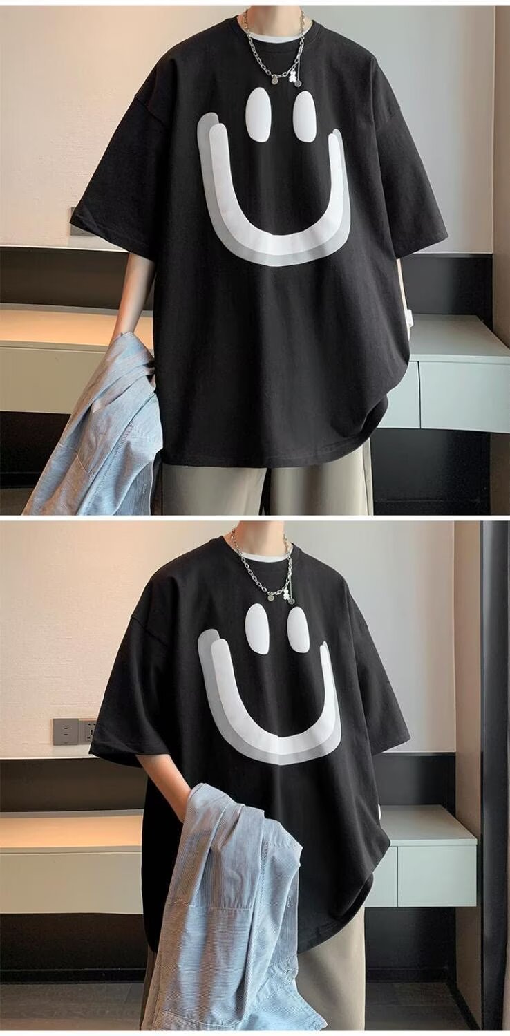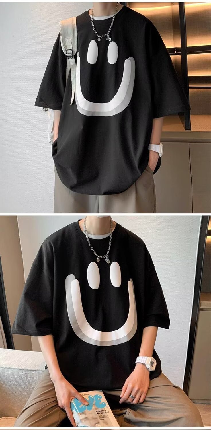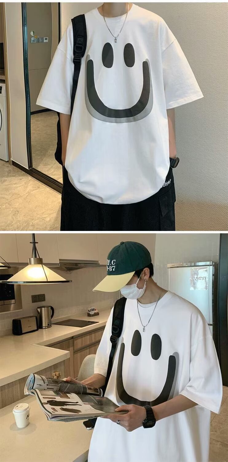 간단한 스마일리 프린트 반팔 티셔츠 남자 여름 트렌디 브랜드 오버 사이즈 루즈 올매치 라운드 넥 반소매 탑