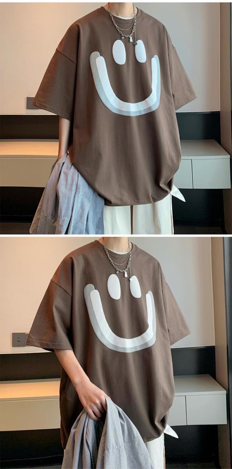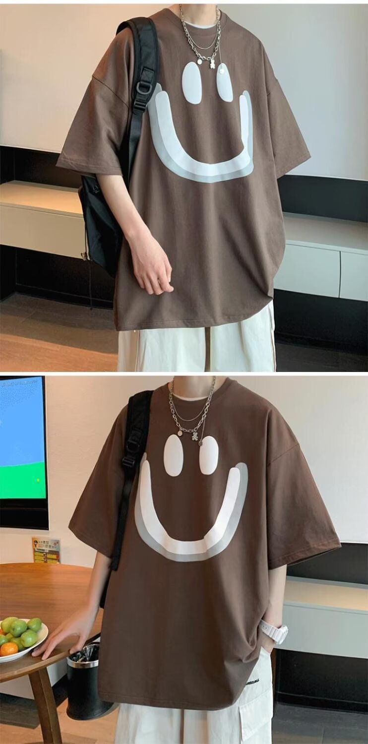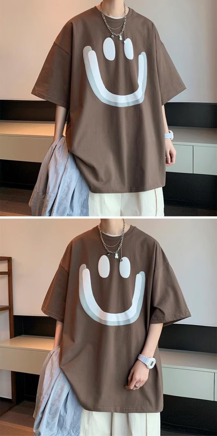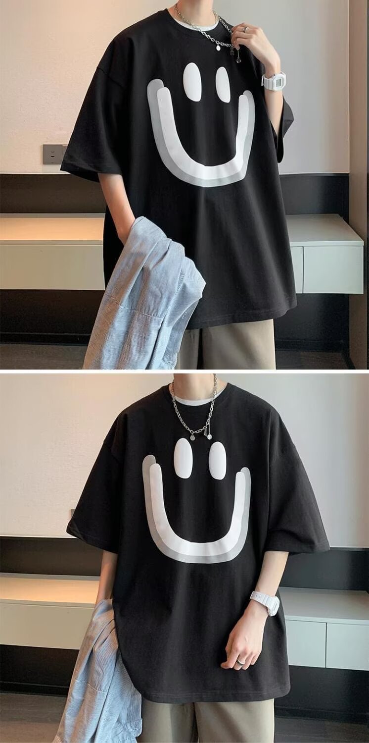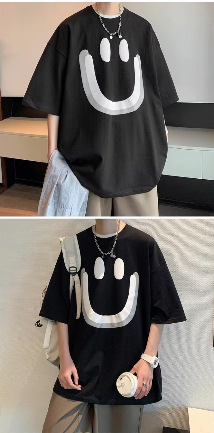 간단한 스마일리 프린트 반팔 티셔츠 남자 여름 트렌디 브랜드 오버 사이즈 루즈 올매치 라운드 넥 반소매 탑