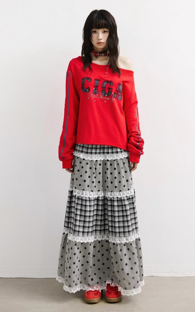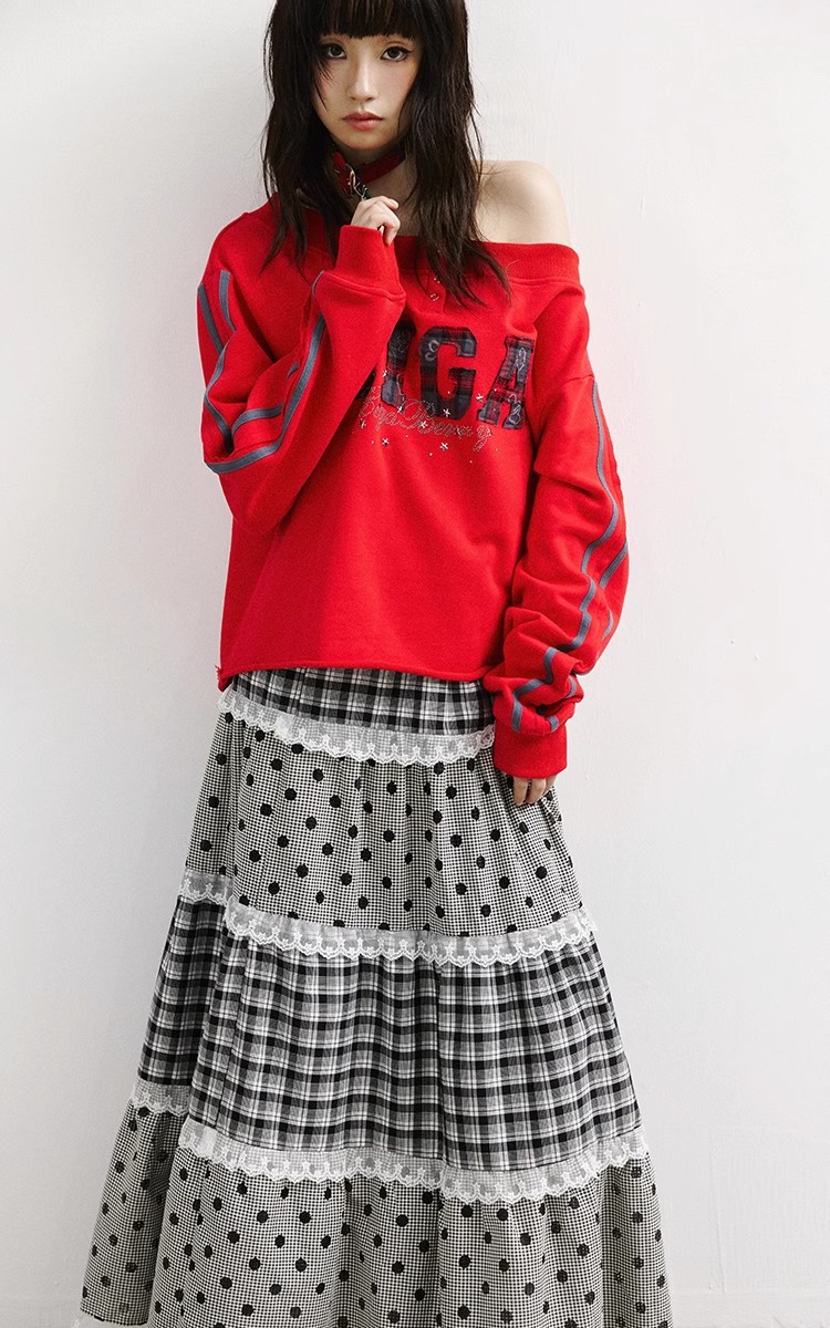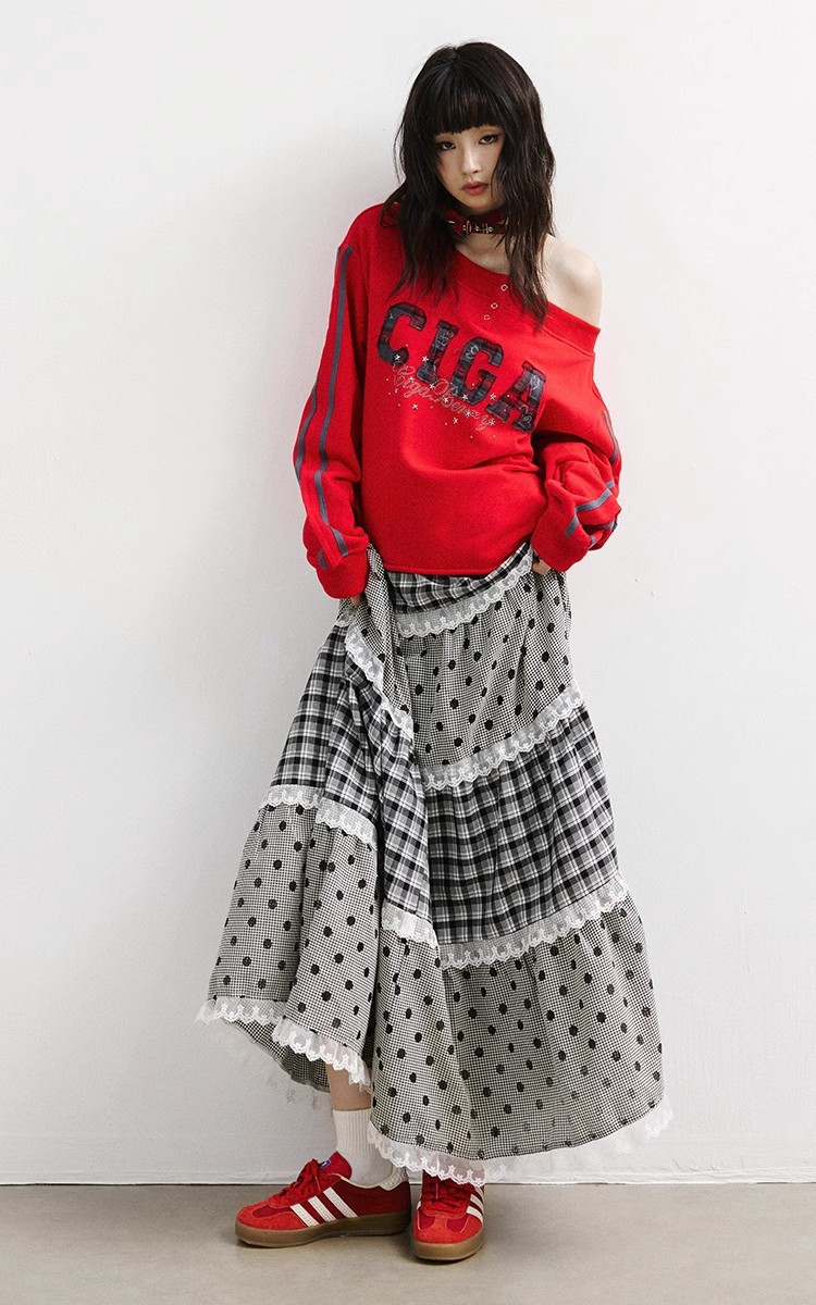 멀티 레이어 레이스 격자 무늬 웨이브 도트 바느질 대형 스윙 A 라인 롱 하프 스커트 올 매치 일본 포시즌 치마 착용