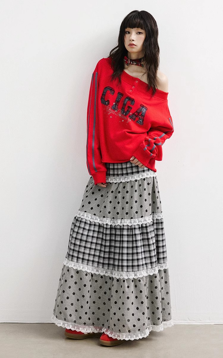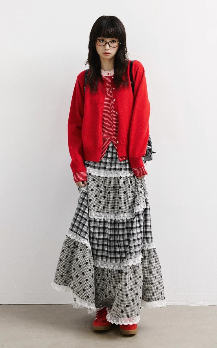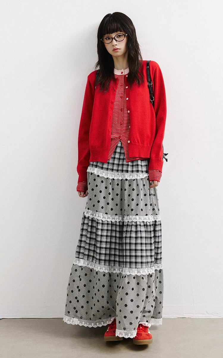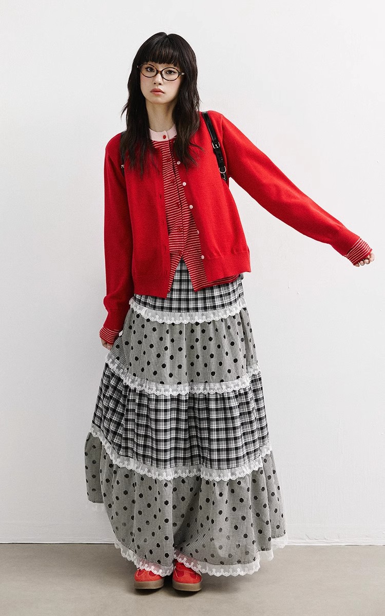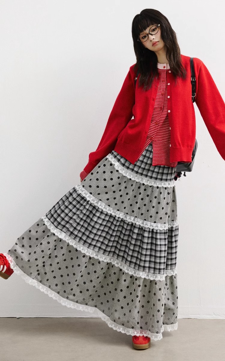 멀티 레이어 레이스 격자 무늬 웨이브 도트 바느질 대형 스윙 A 라인 롱 하프 스커트 올 매치 일본 포시즌 치마 착용스토어 가기
