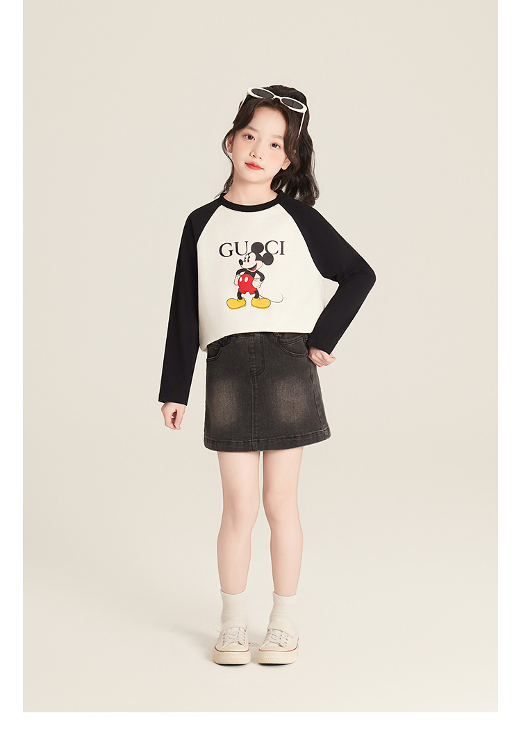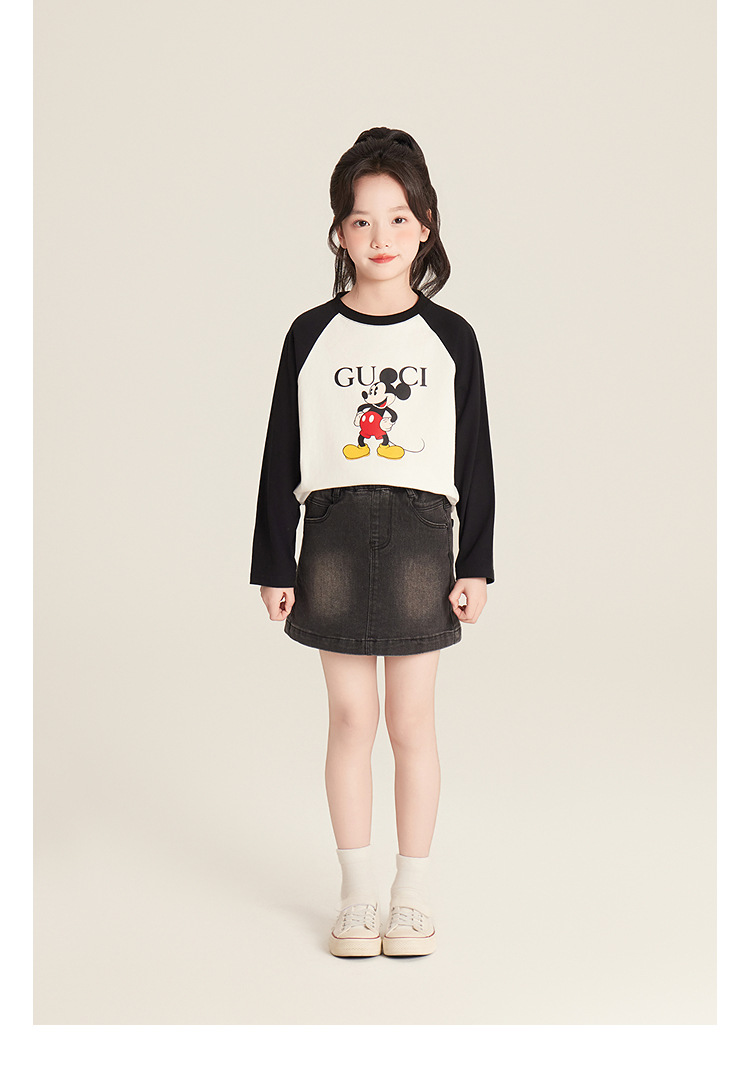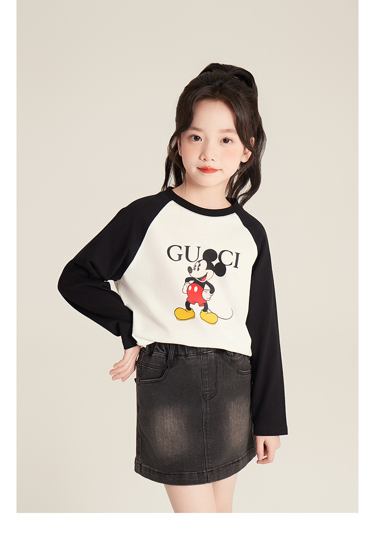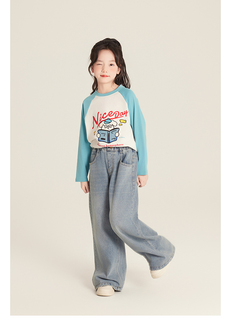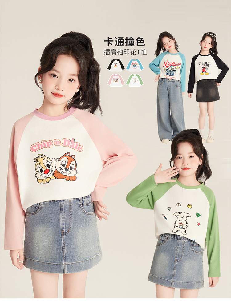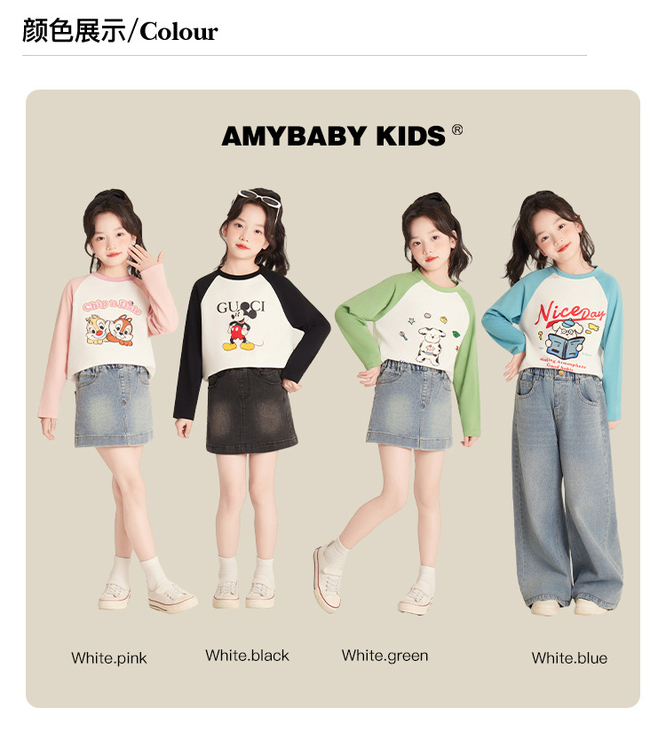Amybaby Girls 'Top Spring 2025 새로운 어린이 서양 스타일 유행 캐주얼 슬림핏 명암 어깨 소매스토어 가기
