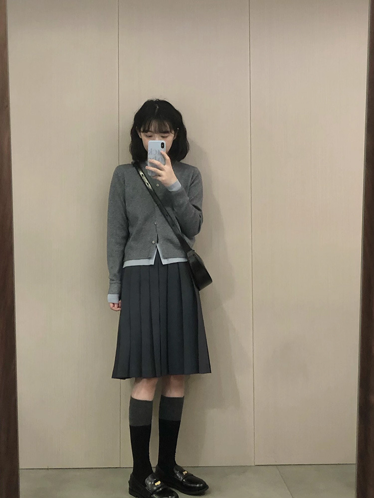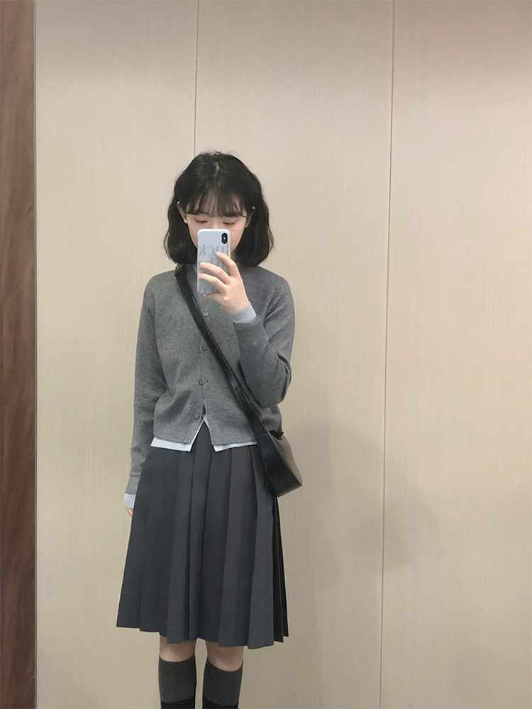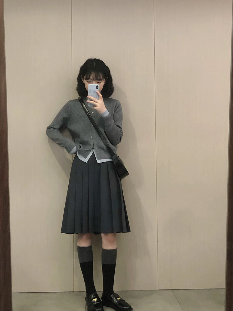 한국 드라마 차부, 회색 스웨터 카디건 플리츠 스커트 투피스 세트 학술 스타일 원피스 착용스토어 가기