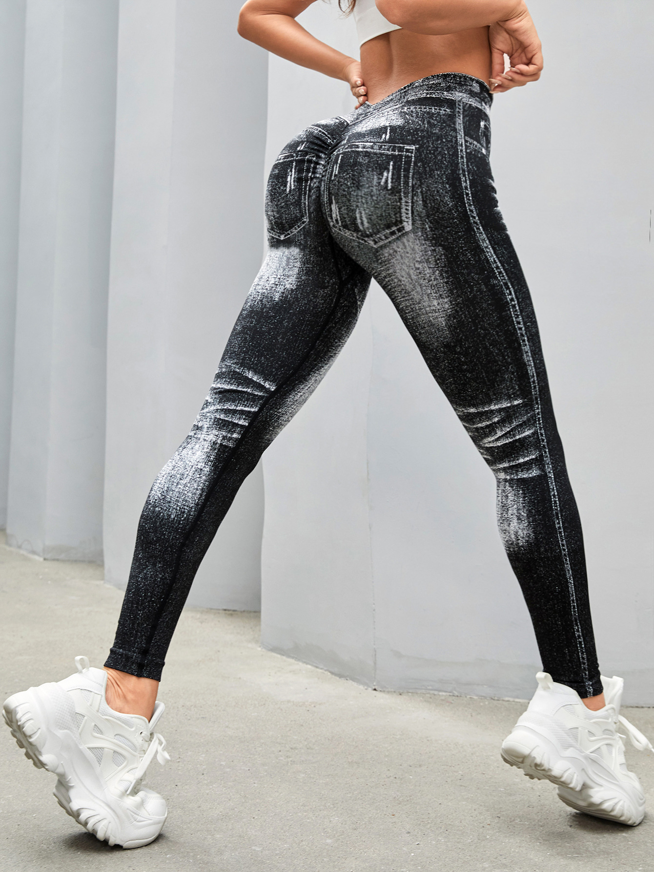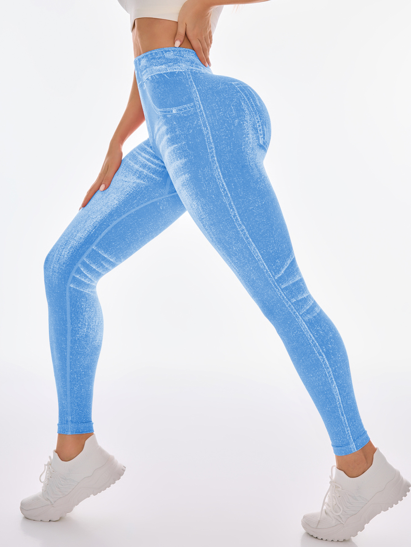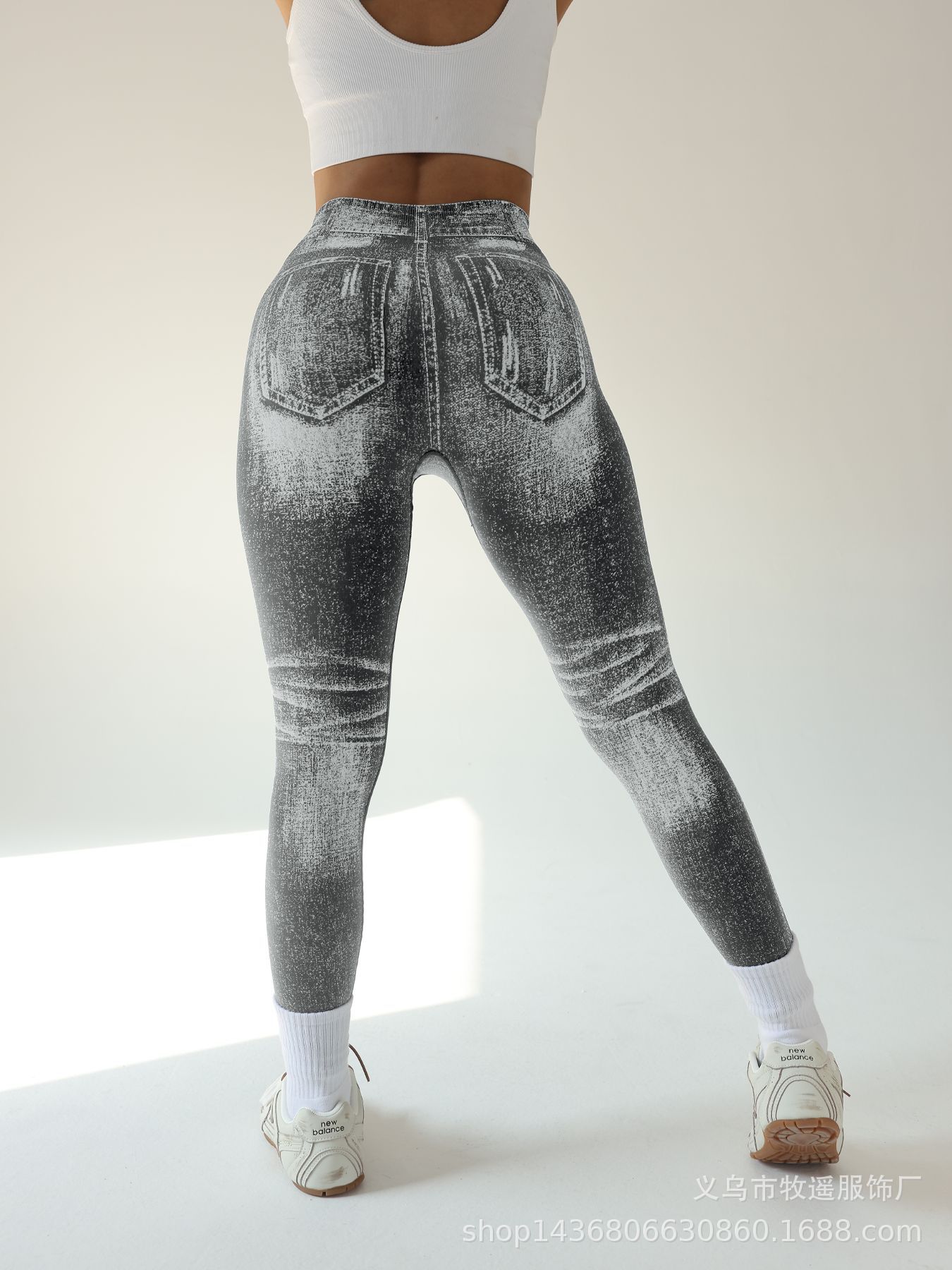 국경 간 폭발 모방 데님 원활한 요가 바지 여성용 후면 V 허리 엉덩이 빠른 건조 꽉 달리기 스포츠 피트니스 바지스토어 가기