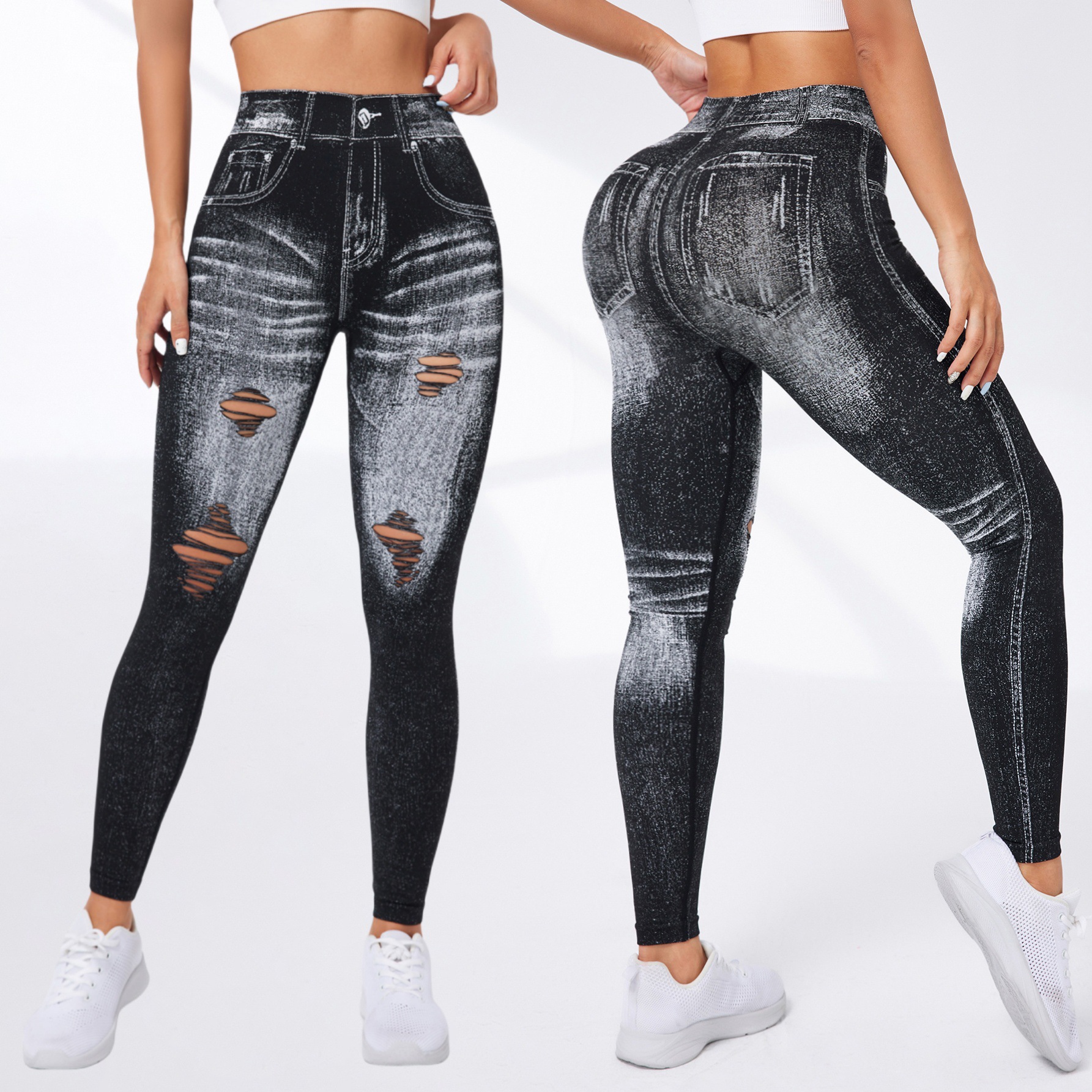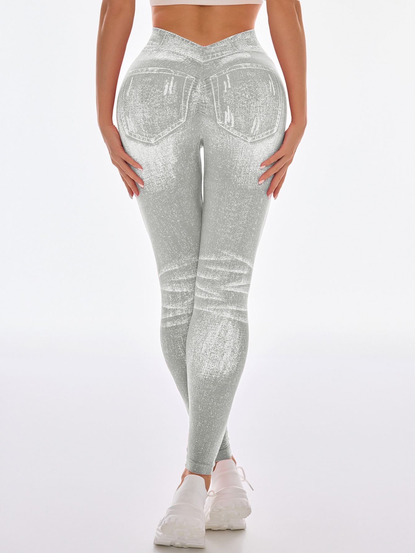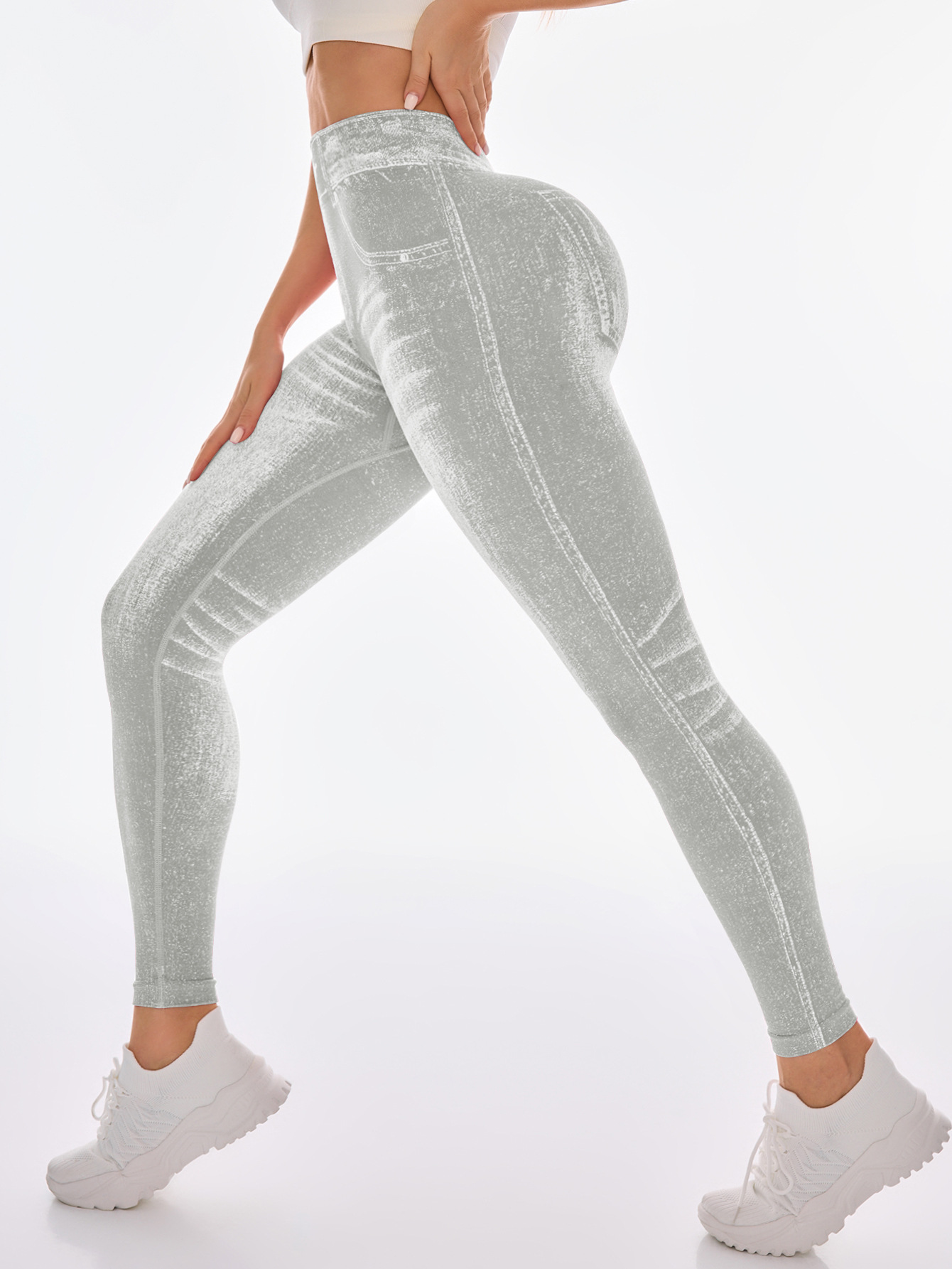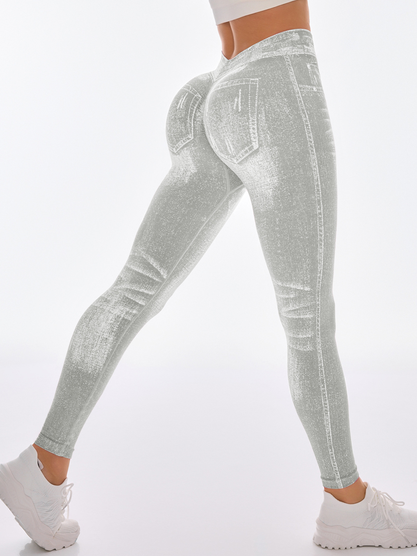 국경 간 폭발 모방 데님 원활한 요가 바지 여성용 후면 V 허리 엉덩이 빠른 건조 꽉 달리기 스포츠 피트니스 바지