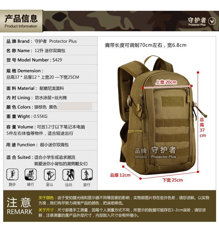 가디언 캔버스 배낭 전술 배낭 남성 12 인치 태블릿 컴퓨터 가방 소형 승마 12 리터 야외 등산 가방