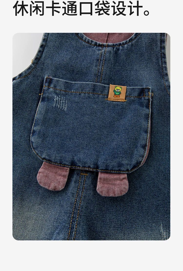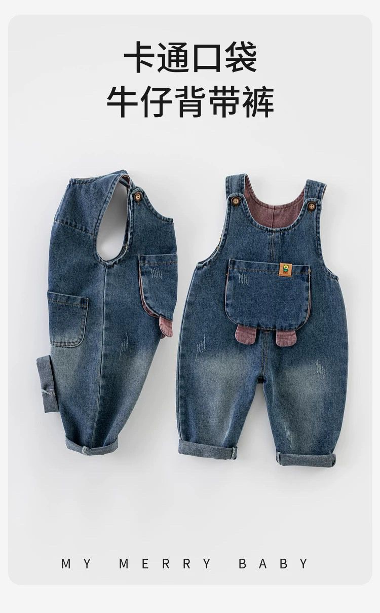 봄과 가을 남성과 여성의 아동복 데님 스트래피 아기 세련된 어린이 독특한 유행 한국 만화 큰 포켓 바지스토어 가기