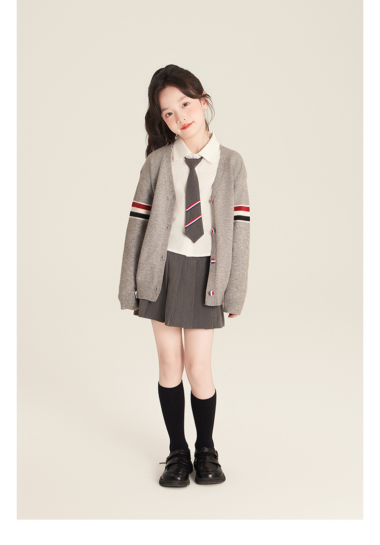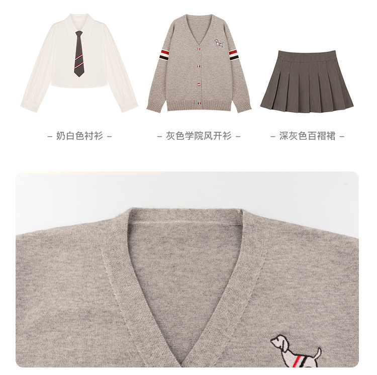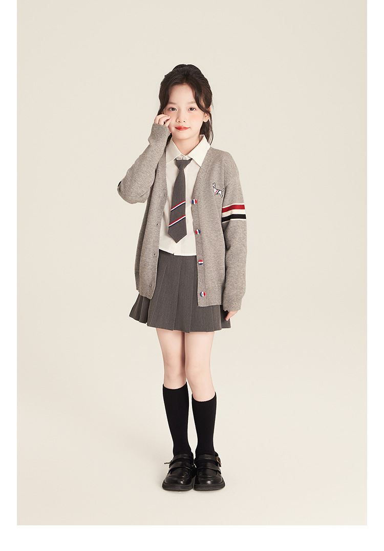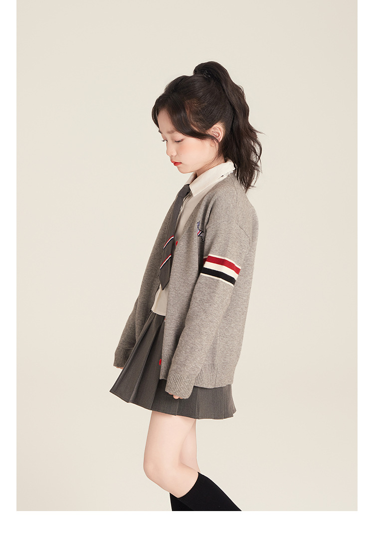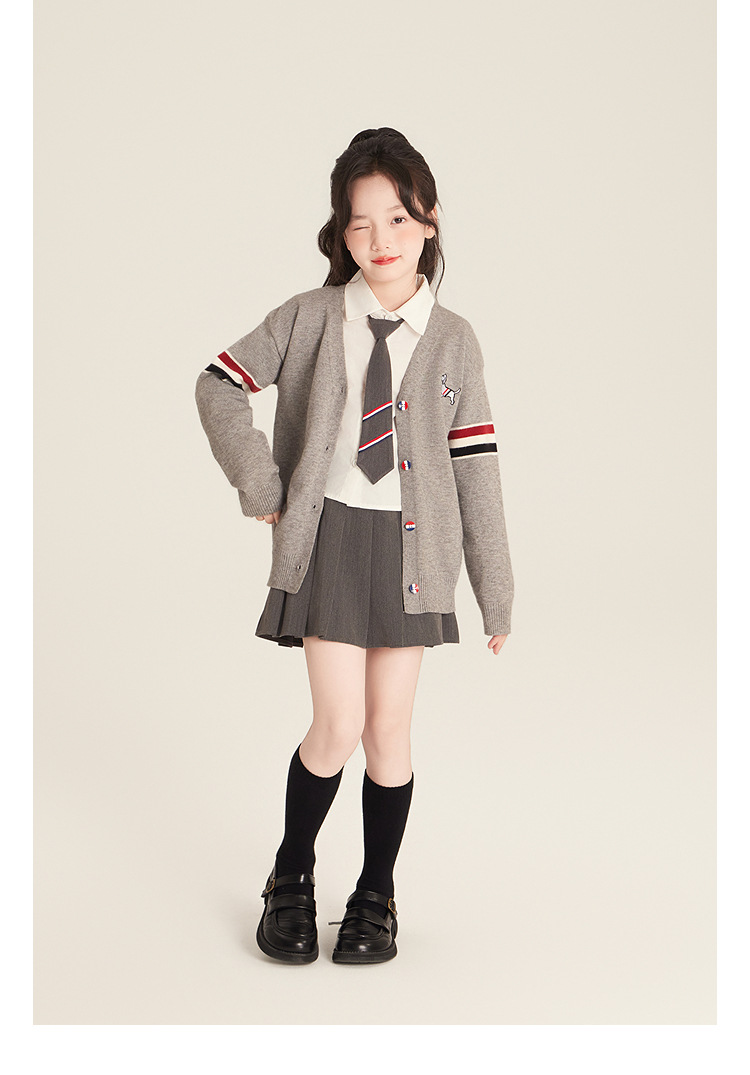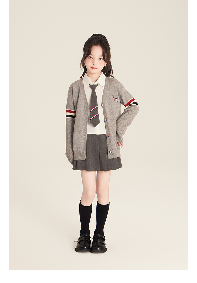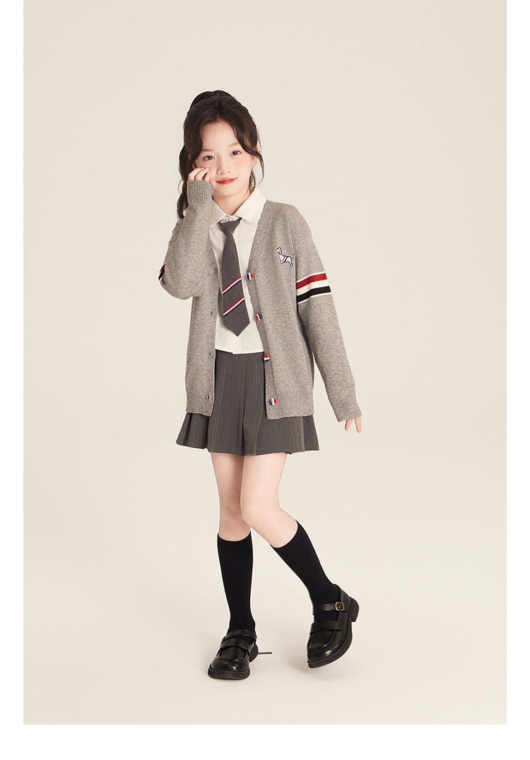 Amybaby Girls 세트 봄 2025 새로운 게으른 바람 대비 색상 강아지 수놓은 V-Neck 카디건 주름 치마