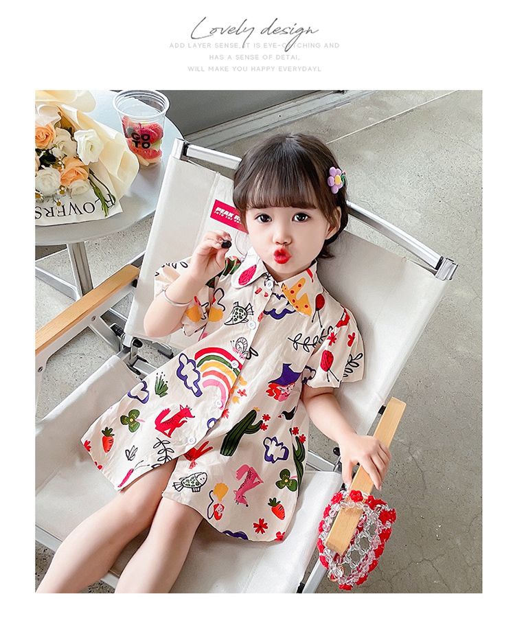 여자 여름 원피스 아기 세련된 어린이 맞춤형 유행 브랜드 한국 스타일 무지개 만화 옷깃 공주 셔츠 원피스