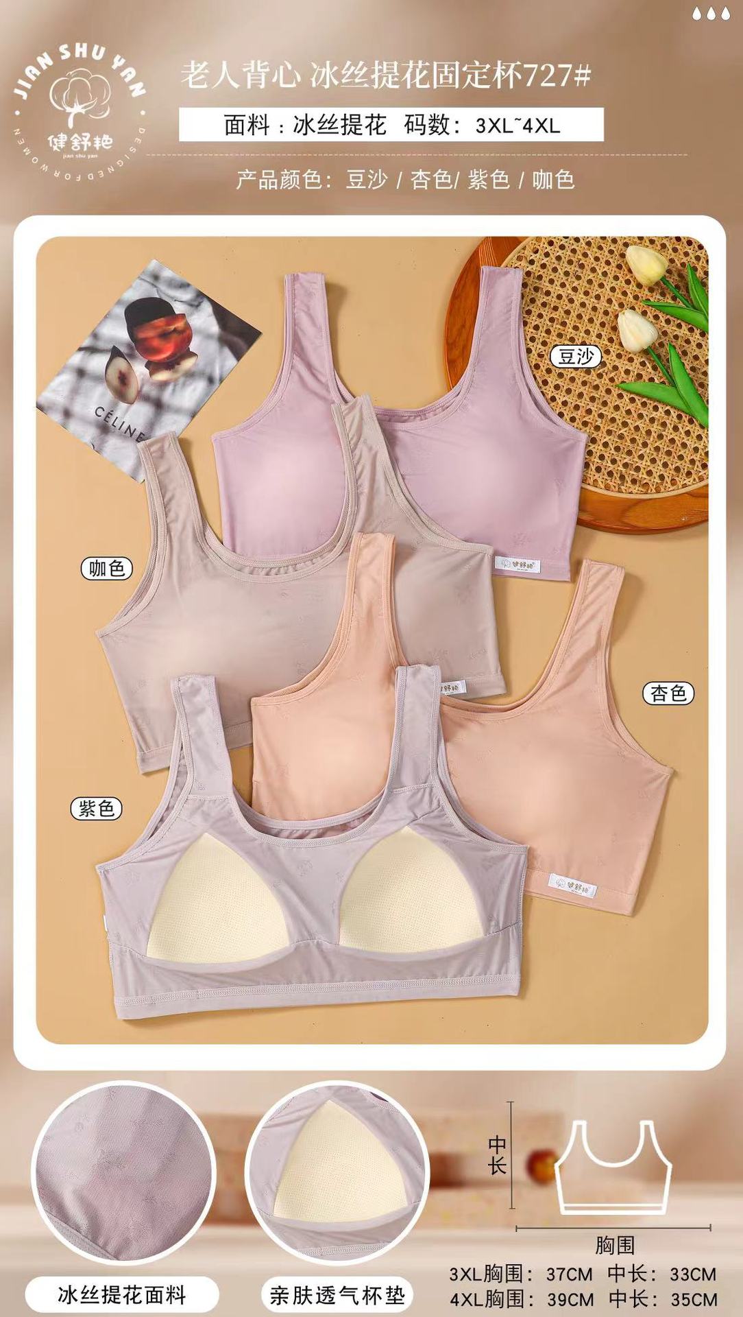 여름 새로운 중년 브라 아이스 실크 통기성 수영 천 자카드 탄성 편안한 경량 소프트 왁스 고정 코스터