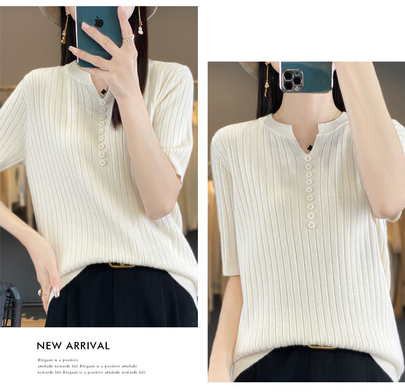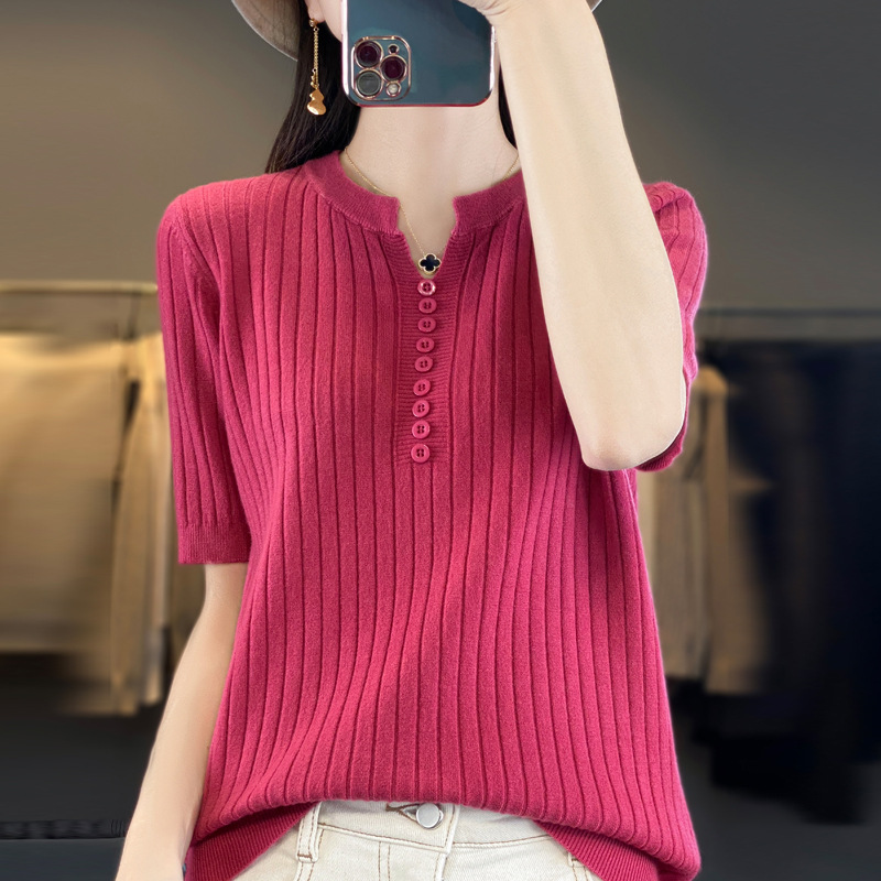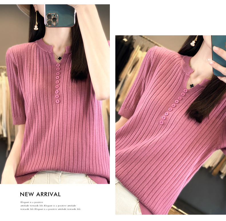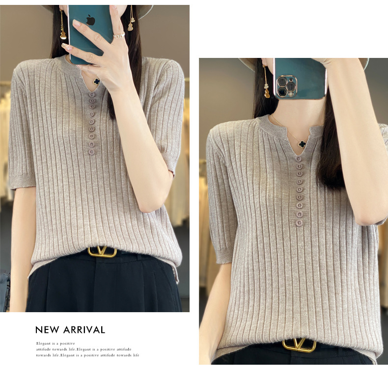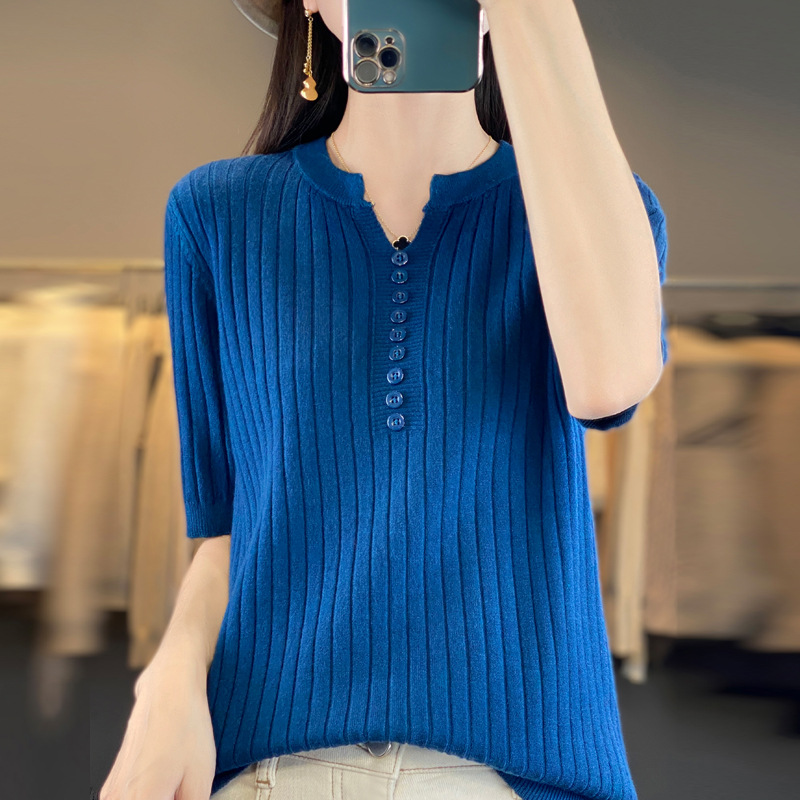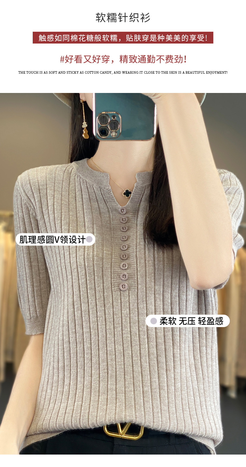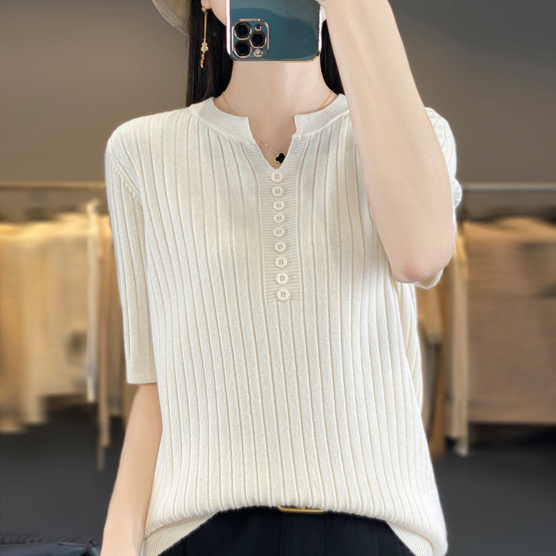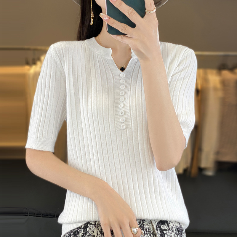 니트 반팔 여성용 슬림 핏 기질 V-넥 버튼 탑 봄과 여름 새로운 스웨터 반소매 바닥 셔츠 도매스토어 가기