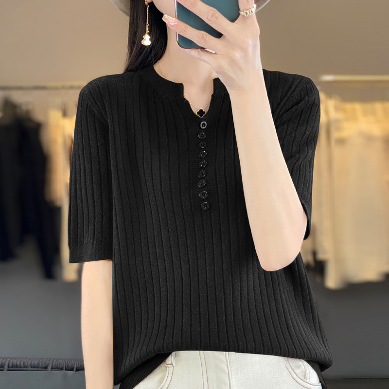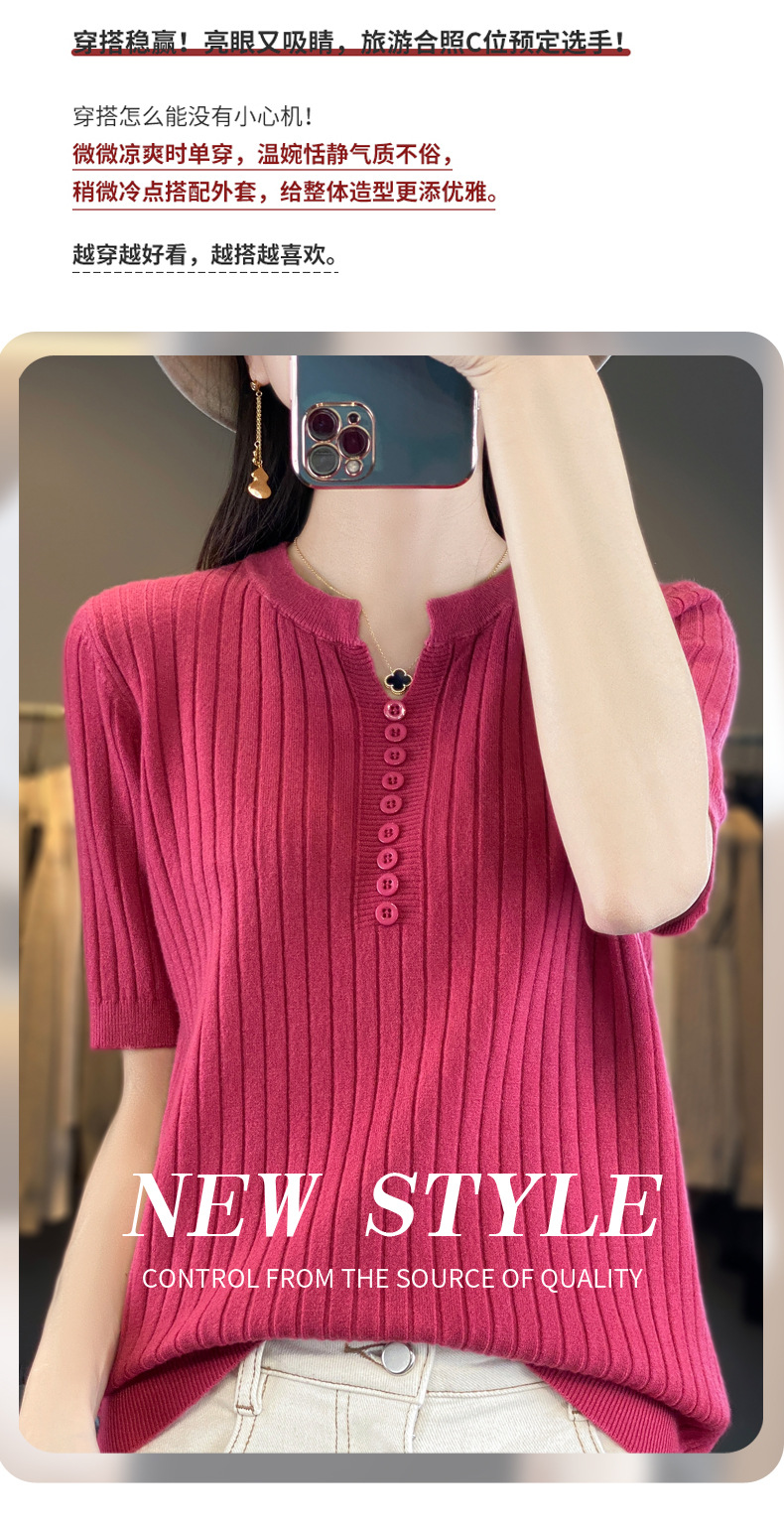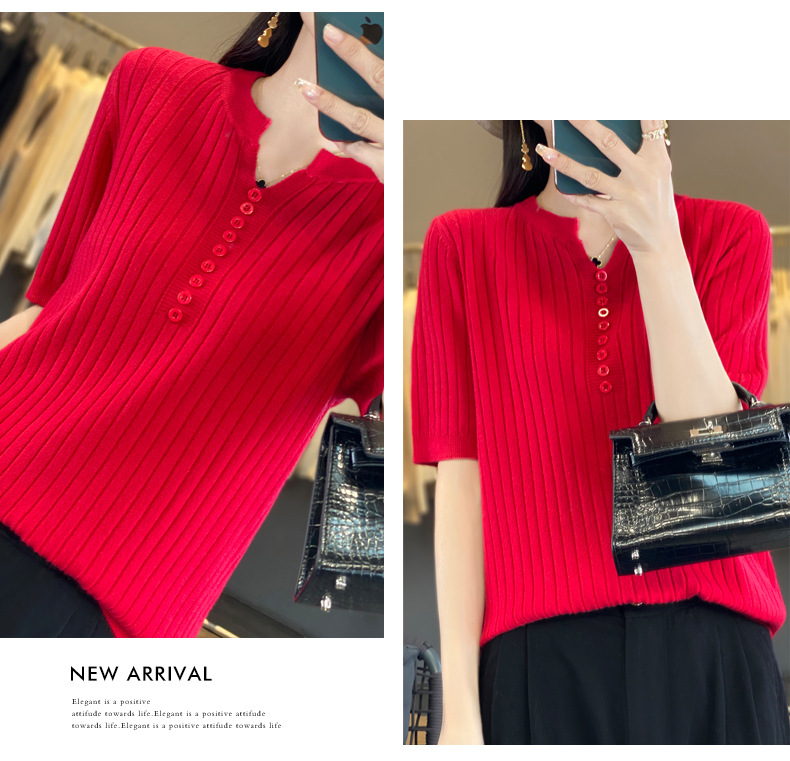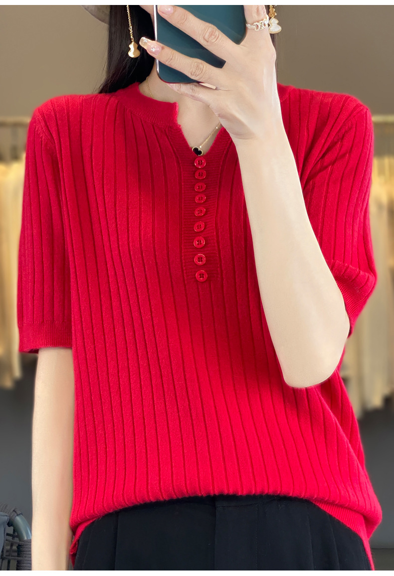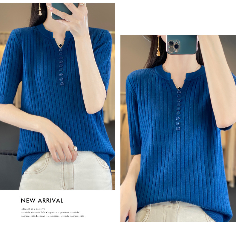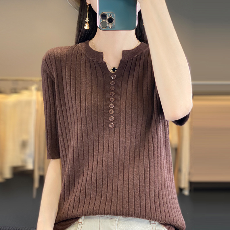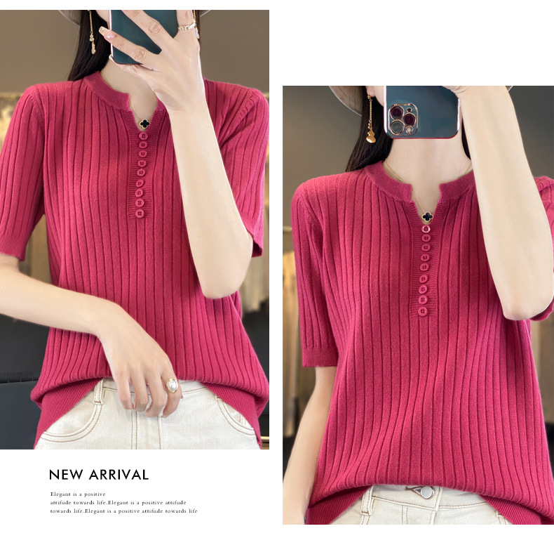 니트 반팔 여성용 슬림 핏 기질 V-넥 버튼 탑 봄과 여름 새로운 스웨터 반소매 바닥 셔츠 도매스토어 가기
