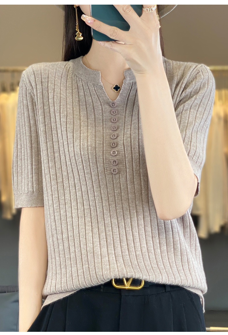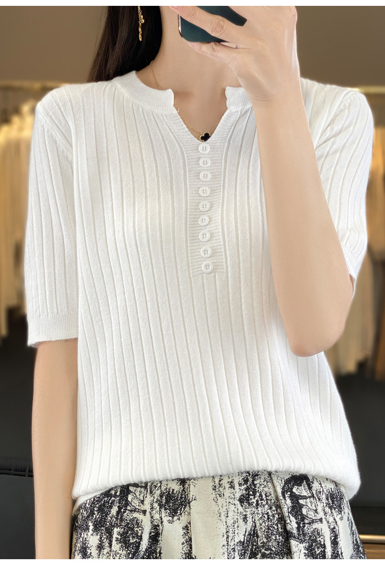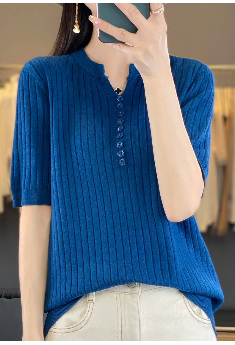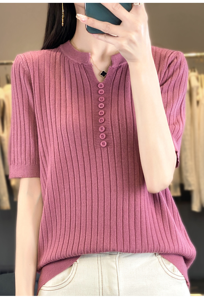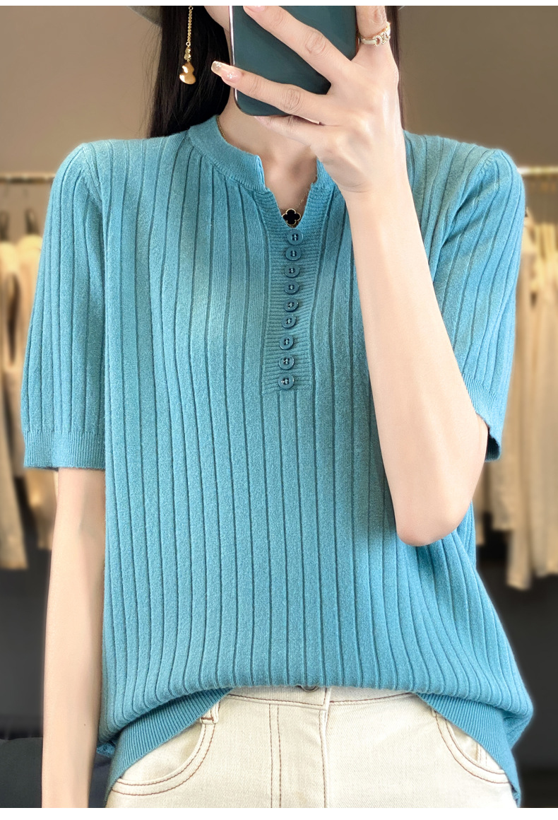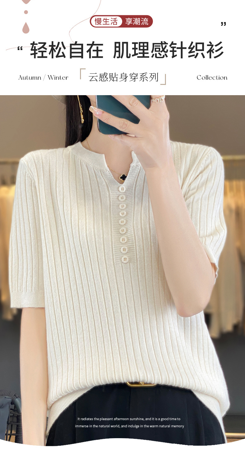 니트 반팔 여성용 슬림 핏 기질 V-넥 버튼 탑 봄과 여름 새로운 스웨터 반소매 바닥 셔츠 도매스토어 가기