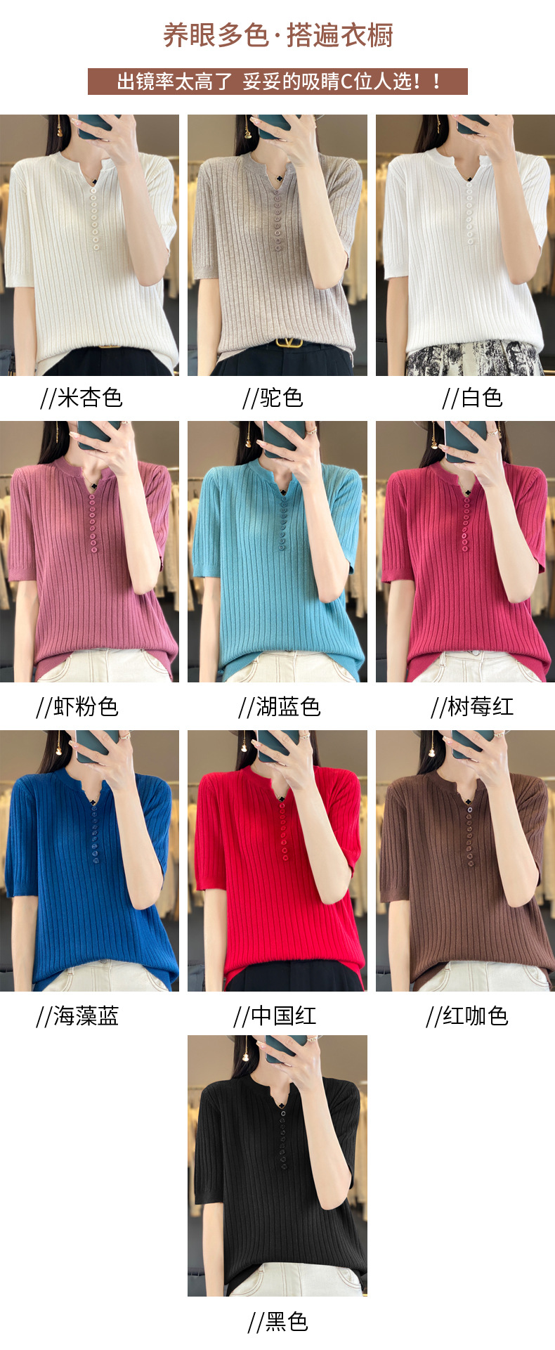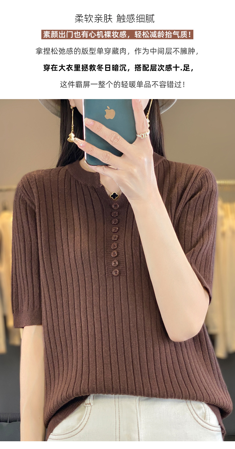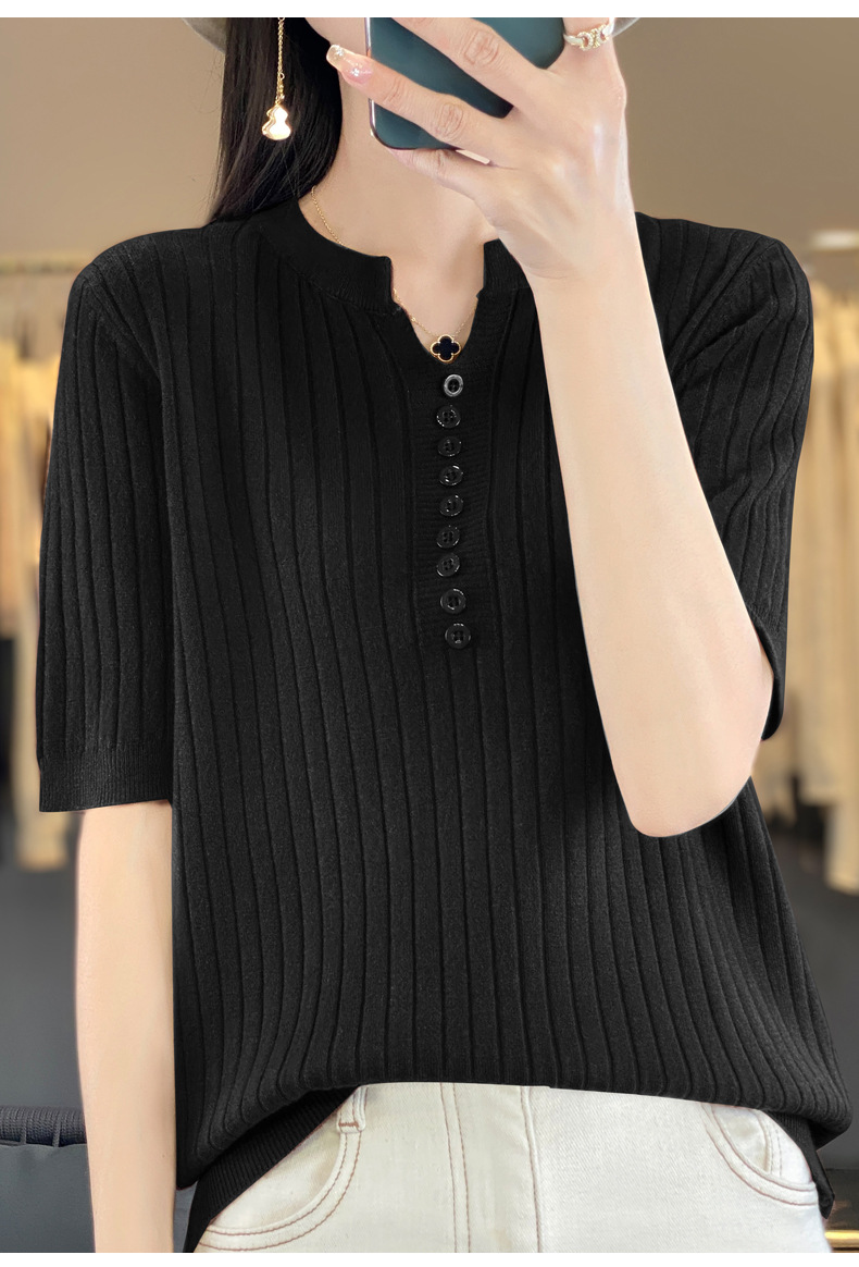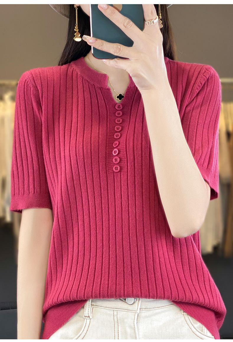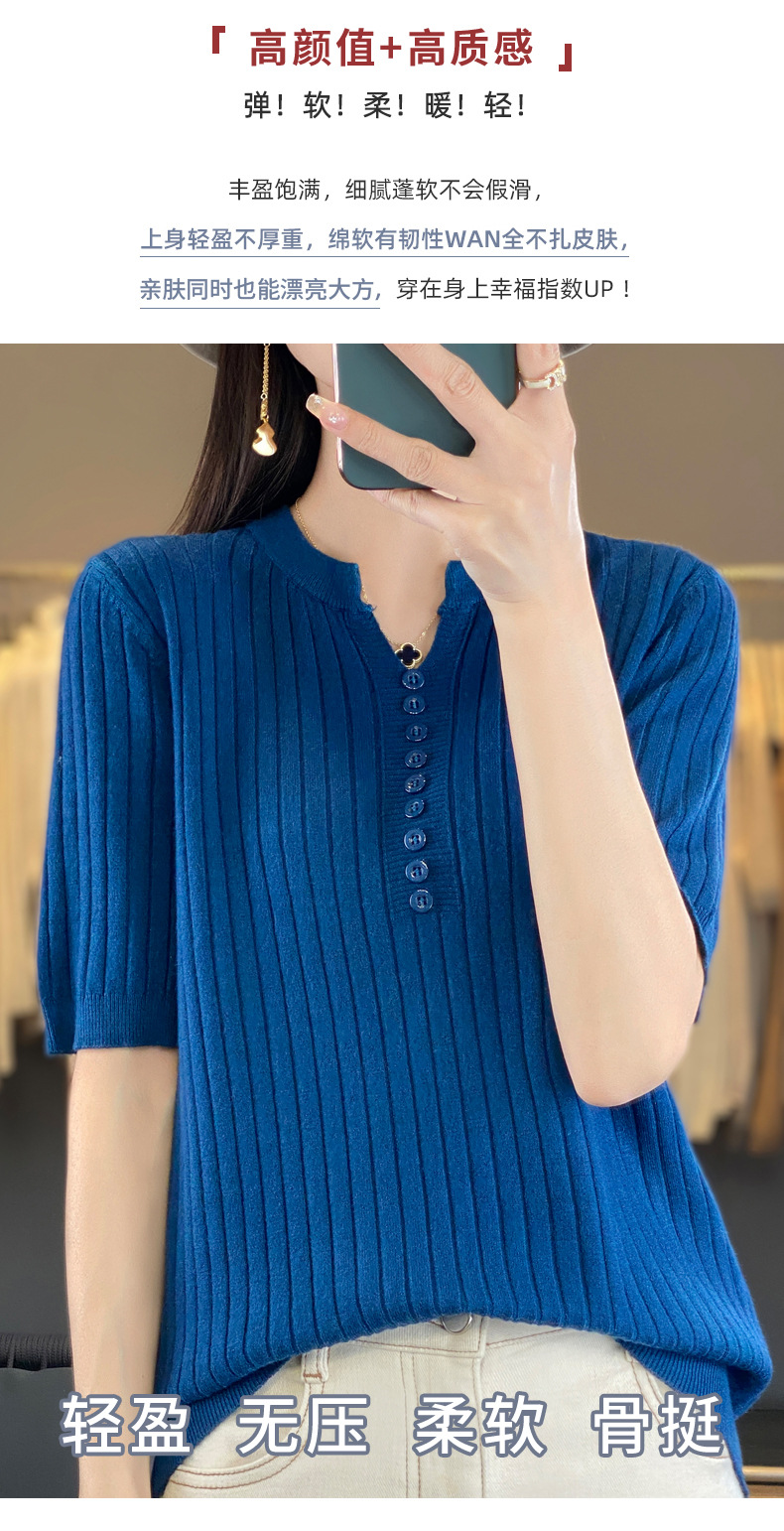 니트 반팔 여성용 슬림 핏 기질 V-넥 버튼 탑 봄과 여름 새로운 스웨터 반소매 바닥 셔츠 도매스토어 가기