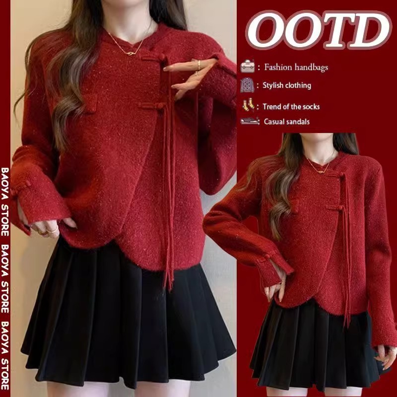 봄 2025 새로운 스타일 샤넬 스타일 새로운 중국 빨간 니트 스웨터 여성 패션 카디건 재킷 주름 치마 세트스토어 가기