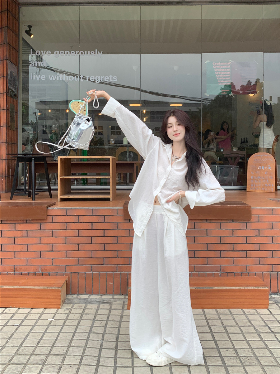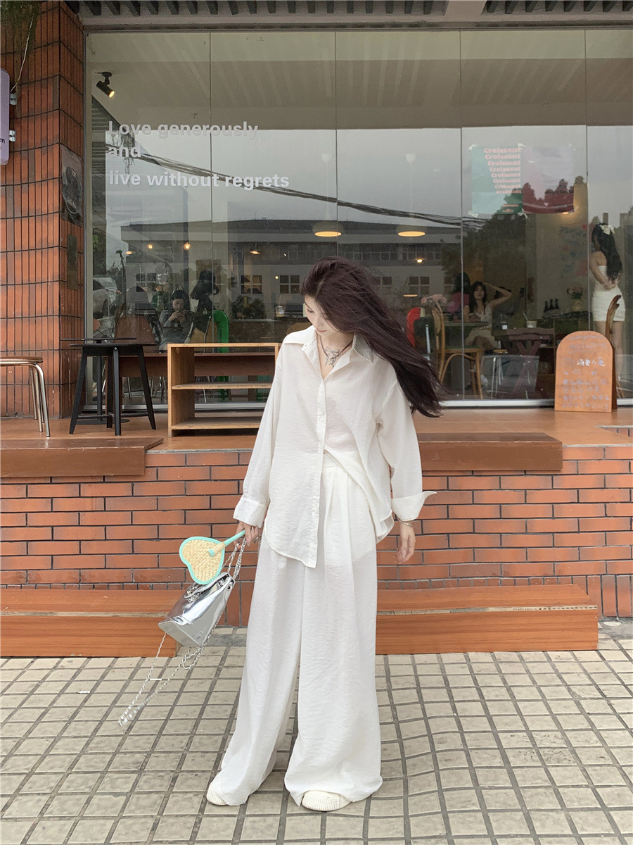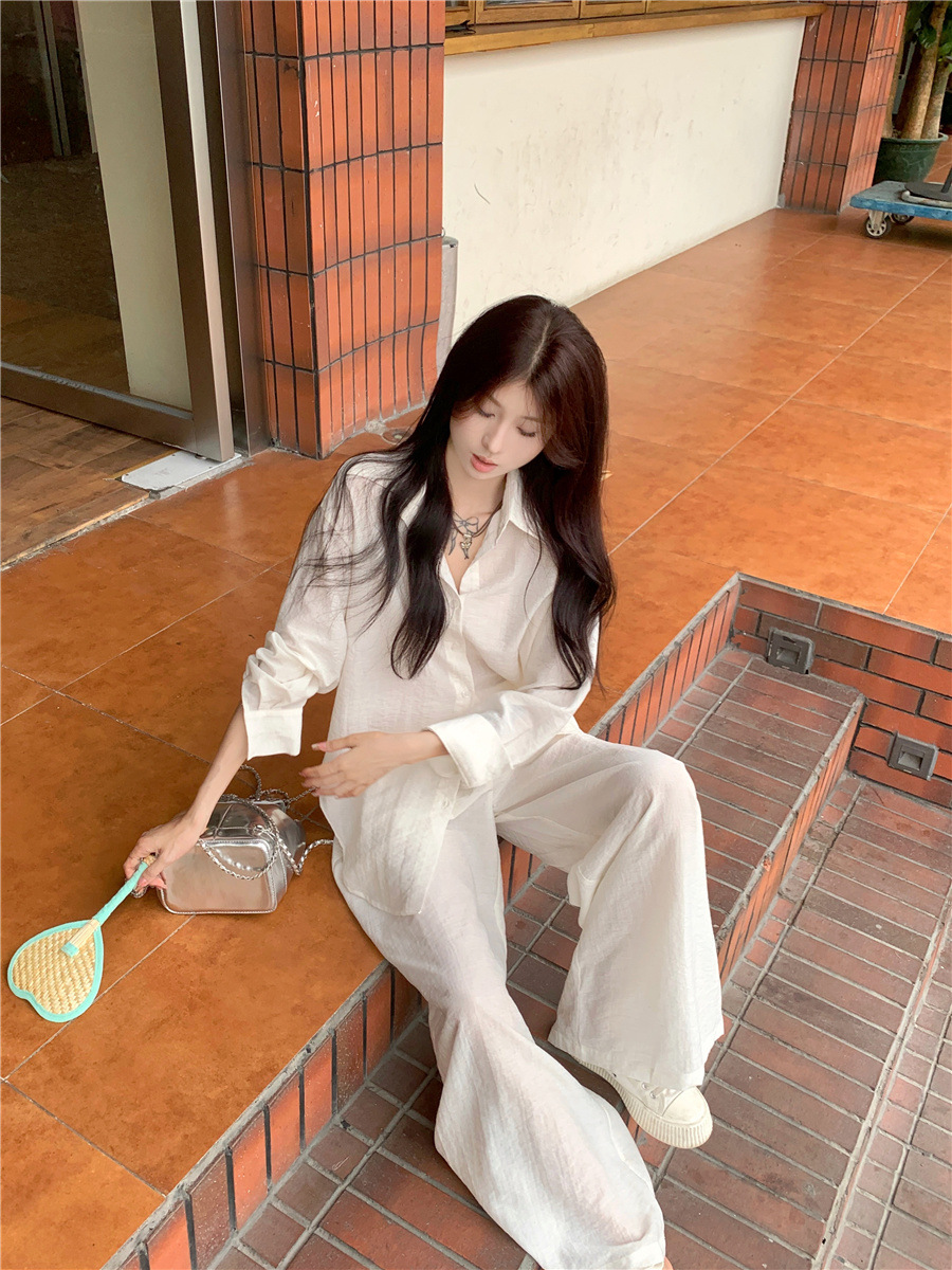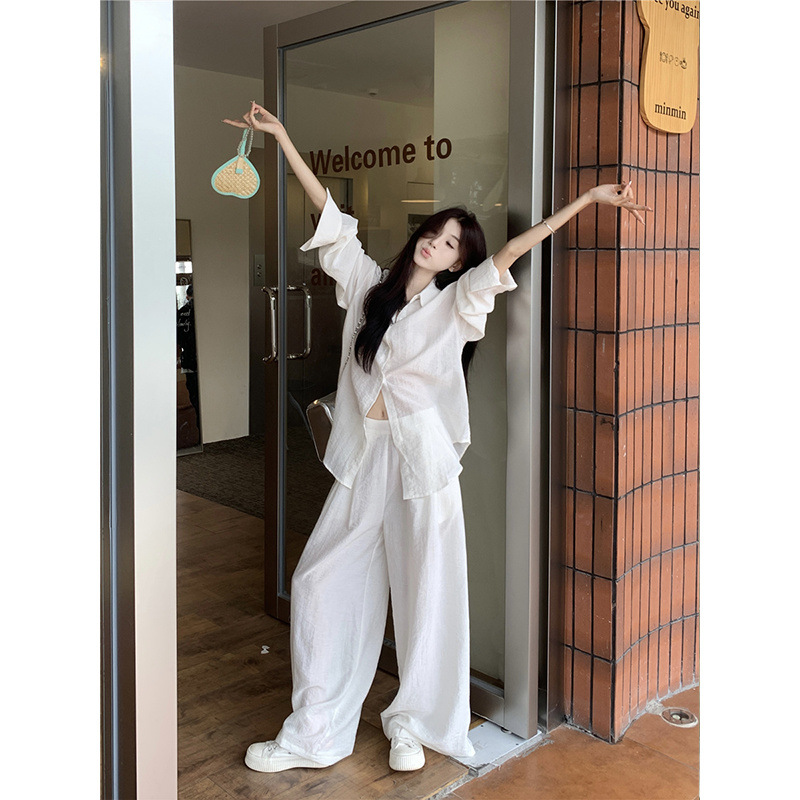 캐주얼 세트 중간 길이의 우아한 셔츠 여자의 2025 여름 새로운 높은 허리 넓은 다리 바지 투피스 세트스토어 가기