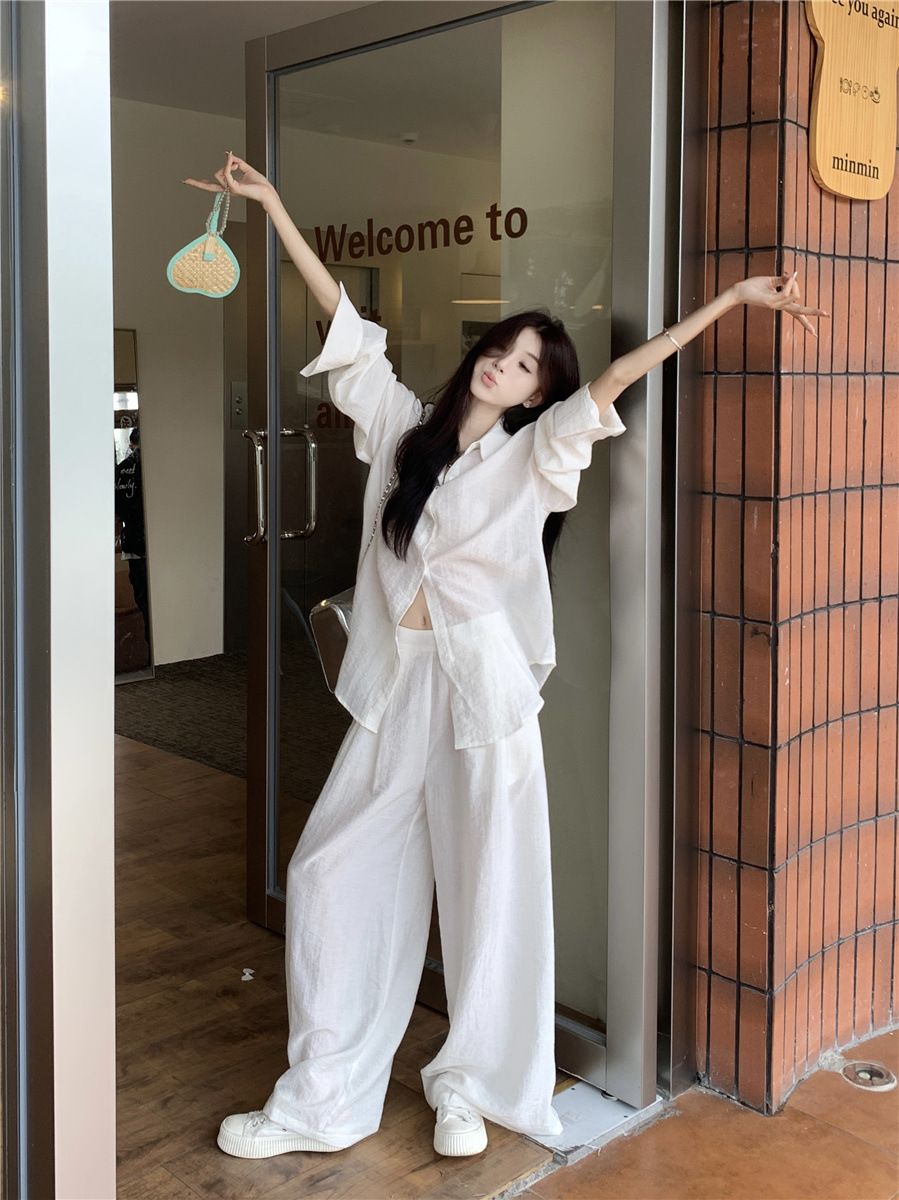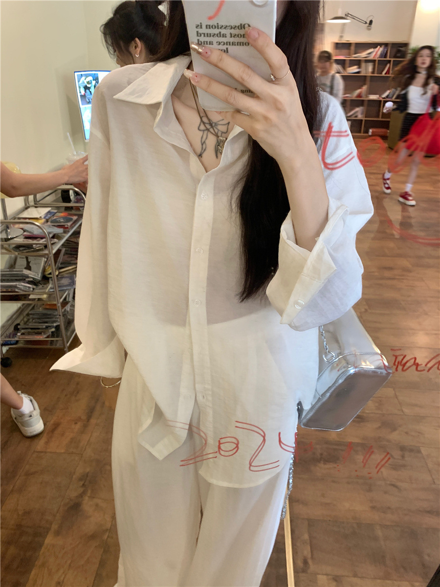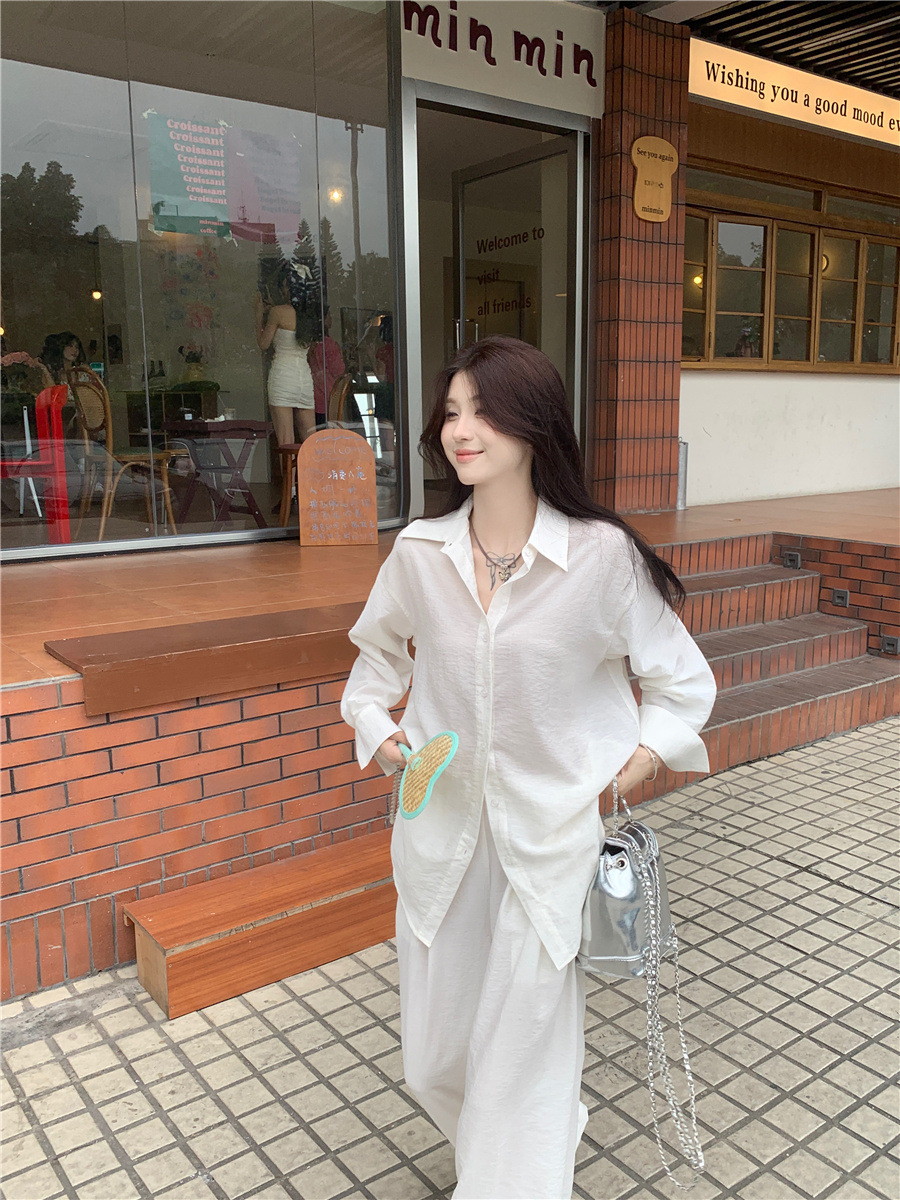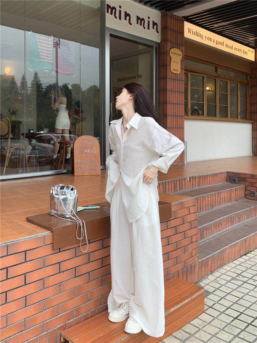 캐주얼 세트 중간 길이의 우아한 셔츠 여자의 2025 여름 새로운 높은 허리 넓은 다리 바지 투피스 세트스토어 가기