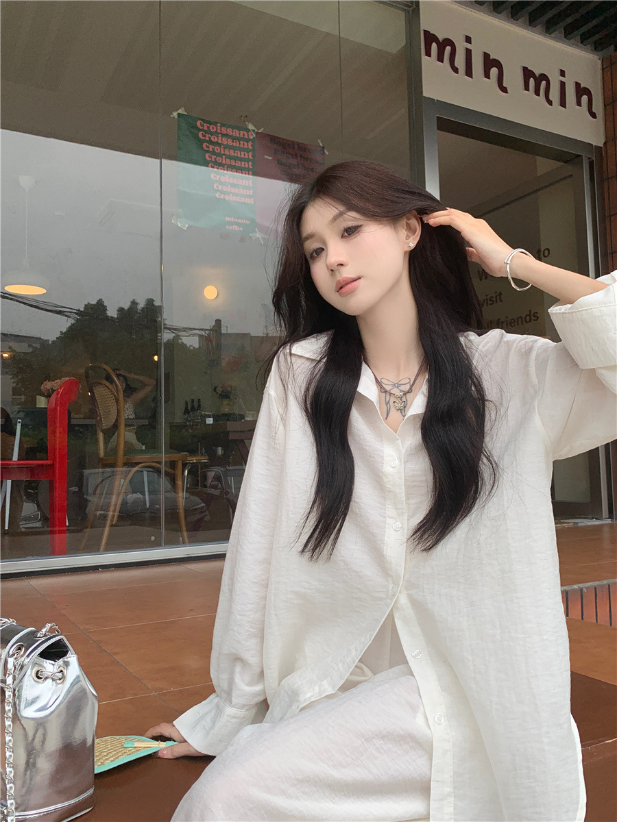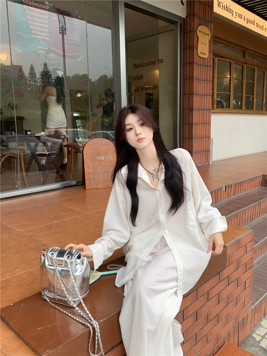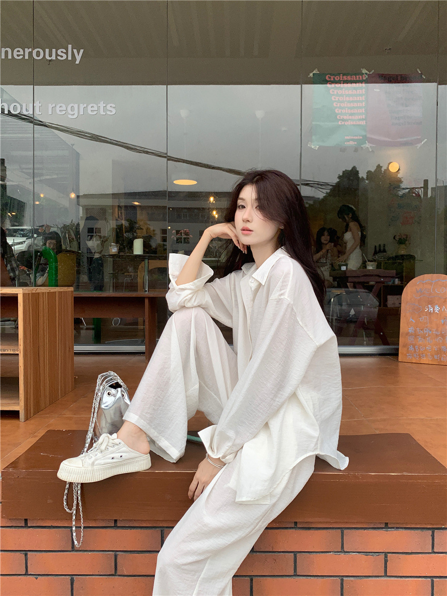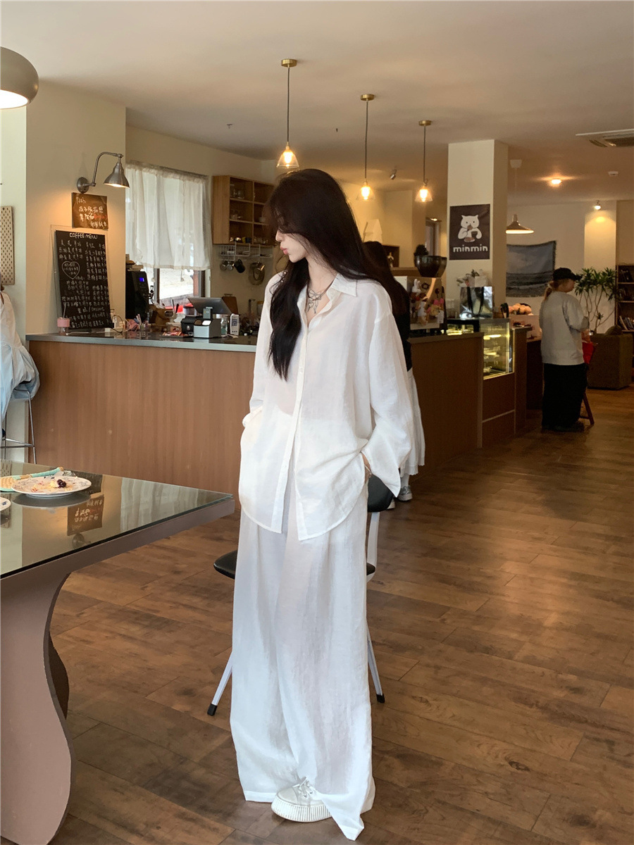 캐주얼 세트 중간 길이의 우아한 셔츠 여자의 2025 여름 새로운 높은 허리 넓은 다리 바지 투피스 세트스토어 가기