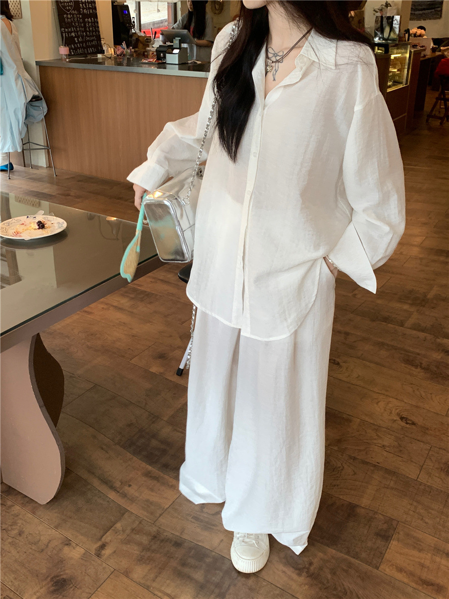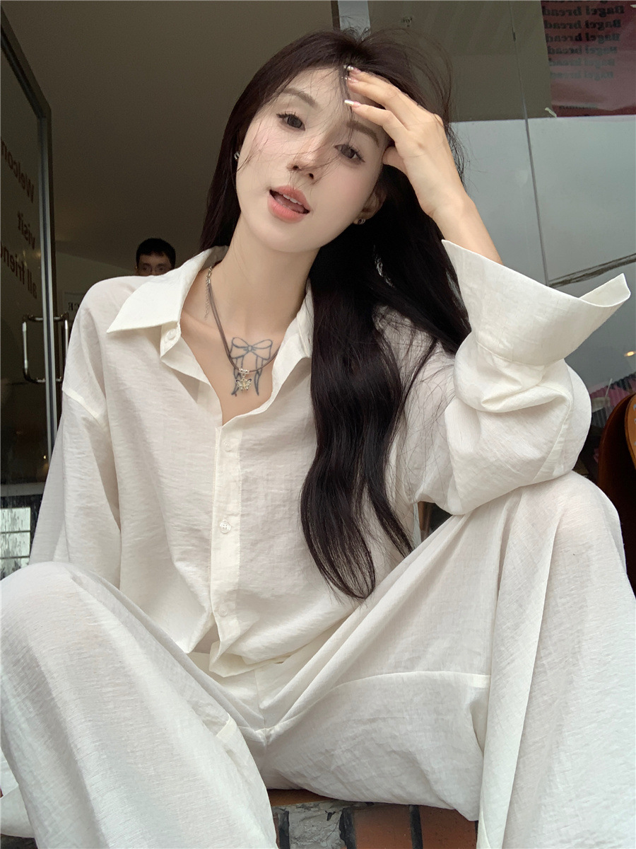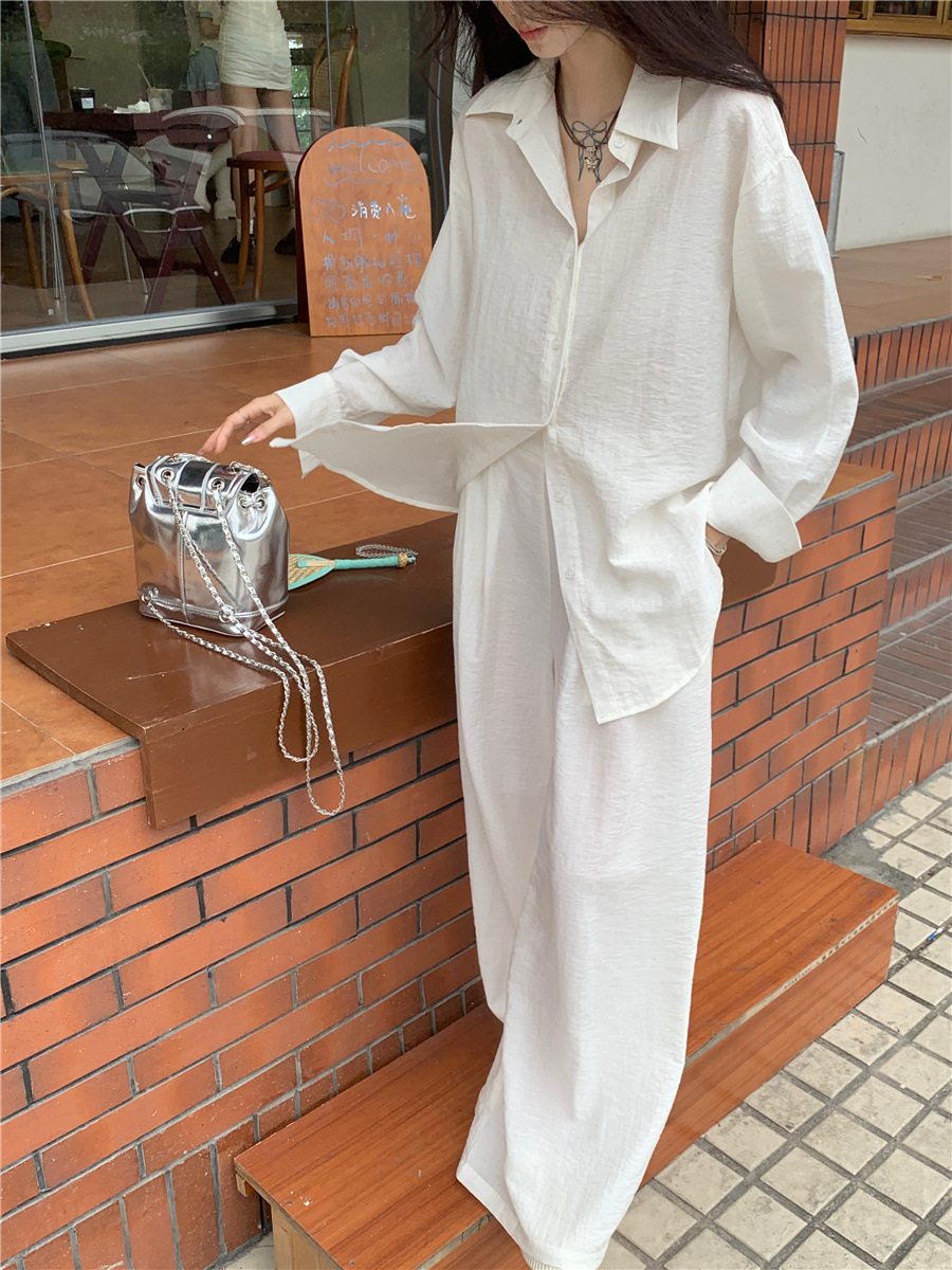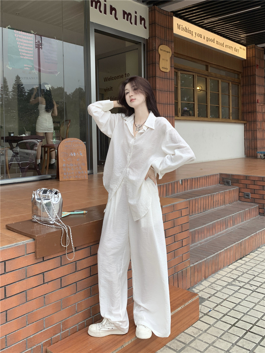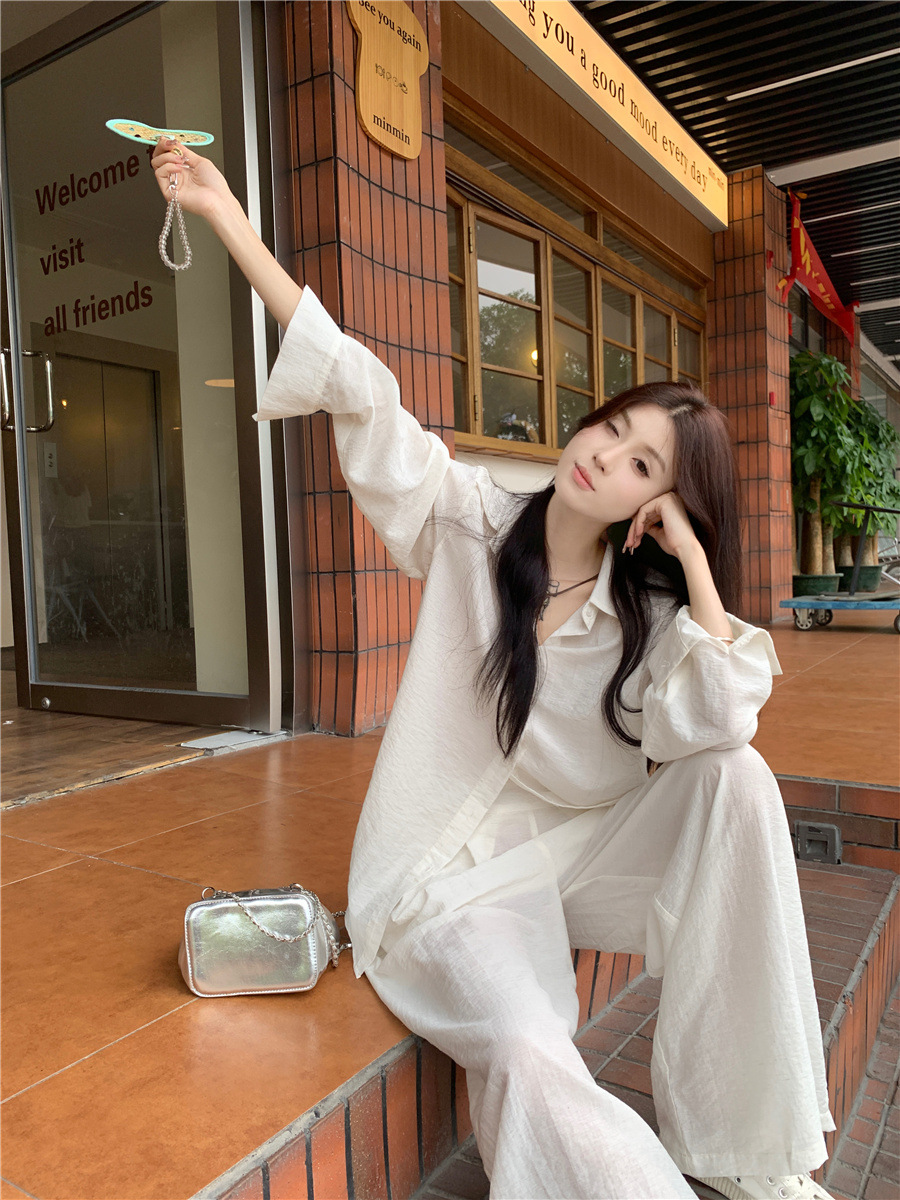 캐주얼 세트 중간 길이의 우아한 셔츠 여자의 2025 여름 새로운 높은 허리 넓은 다리 바지 투피스 세트