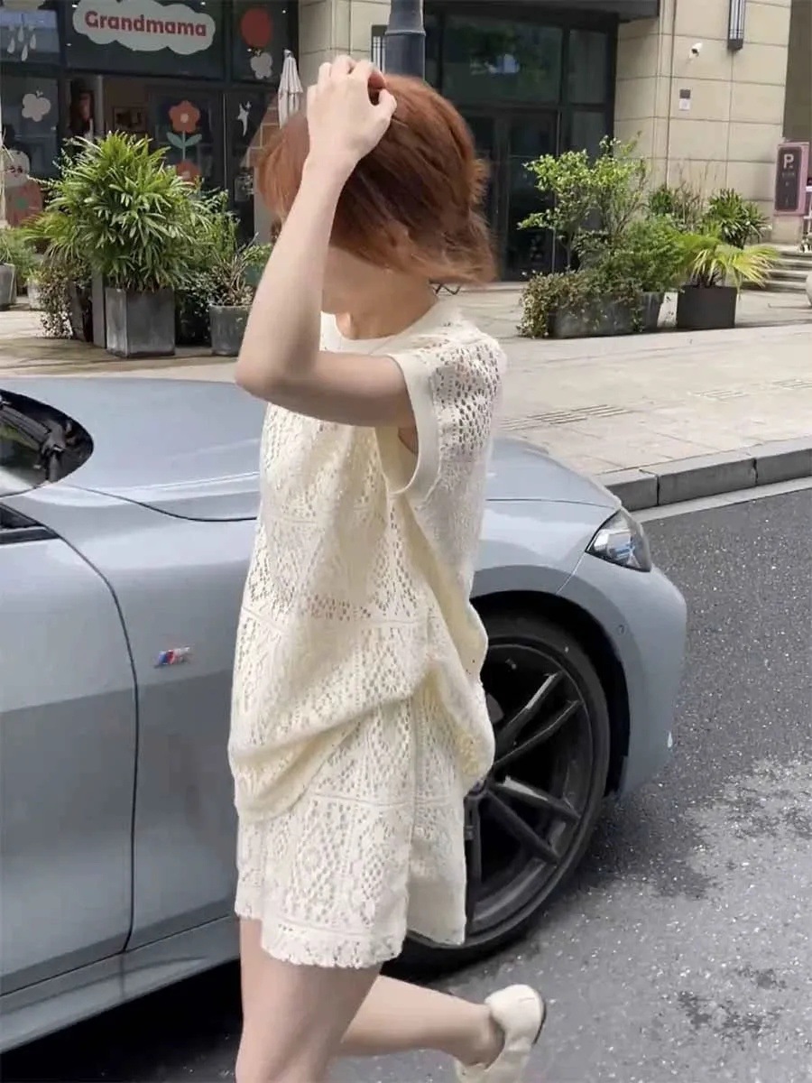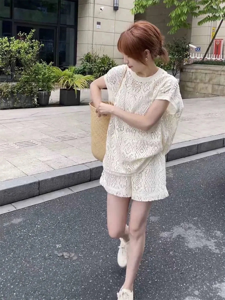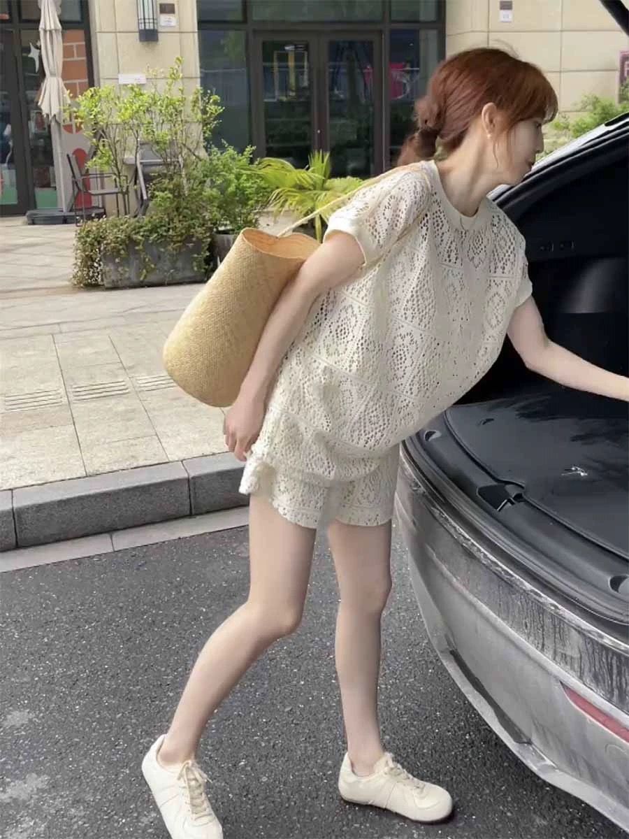 패션 투피스 세트 세트 소금 빛 잘 익은 하이 엔드 레이스 속이 빈 탑 반바지 세트와 함께 여름