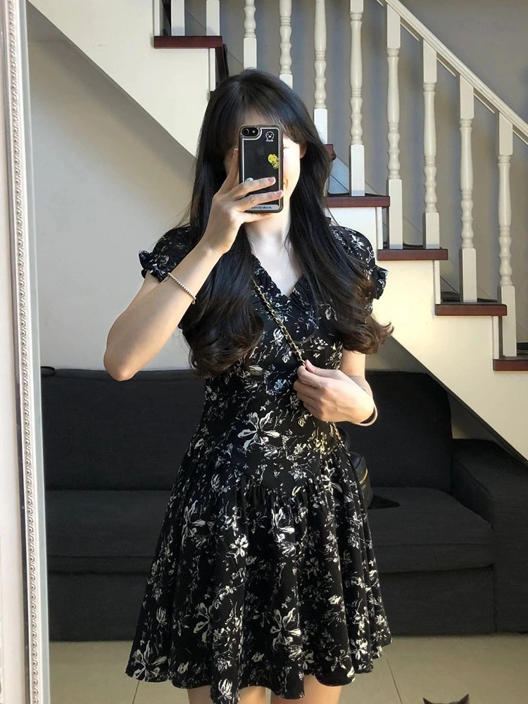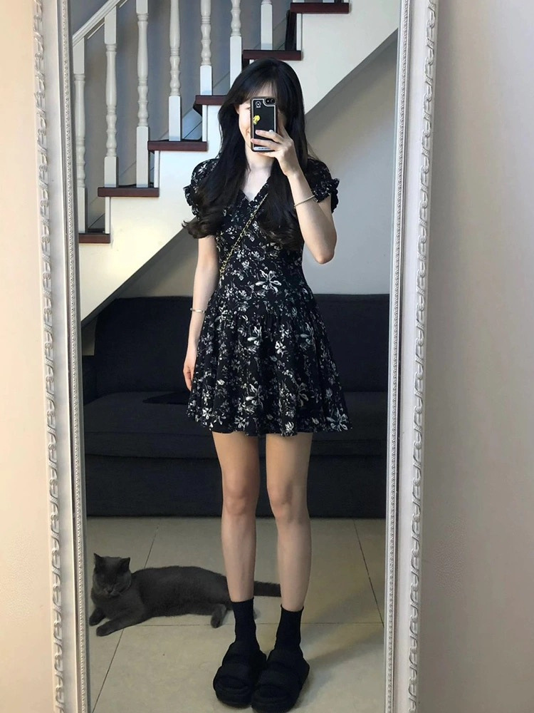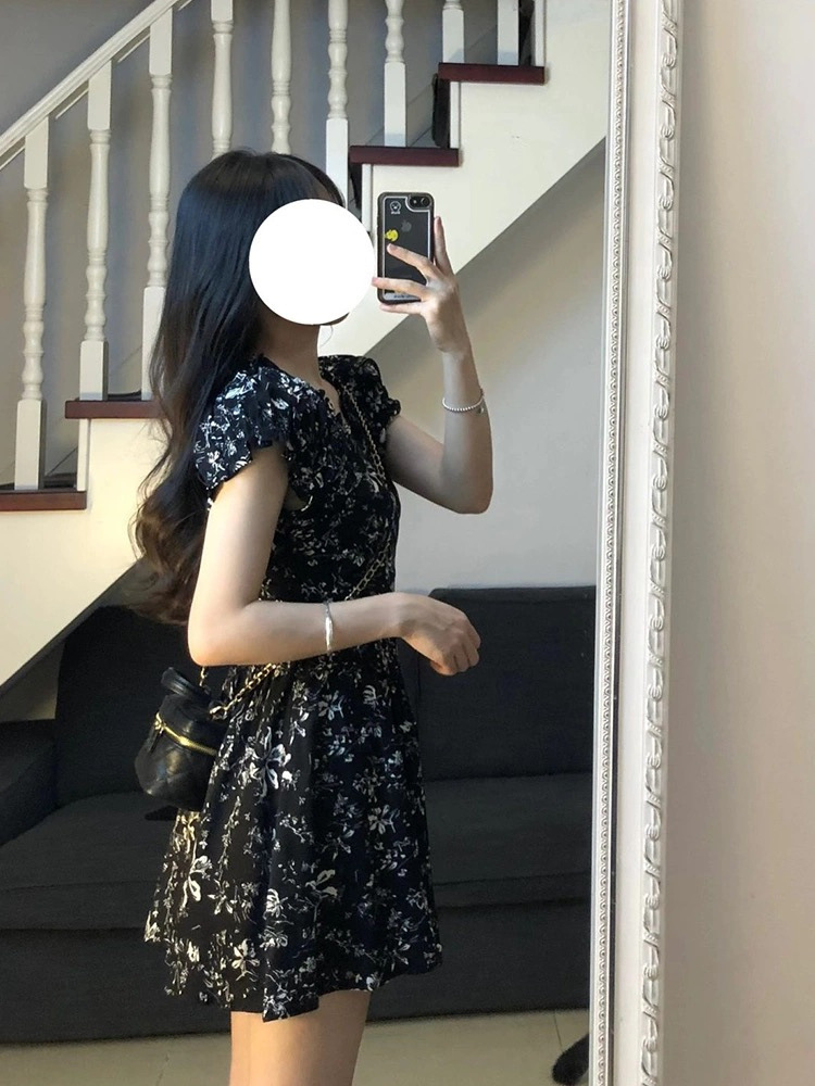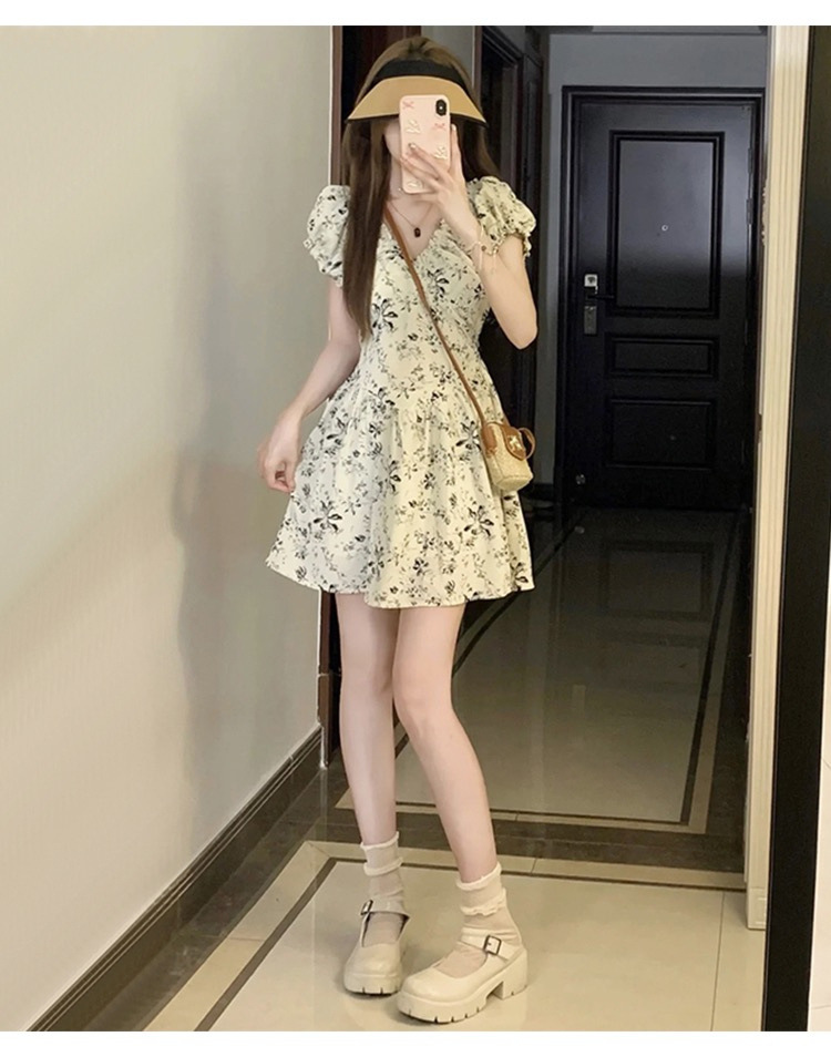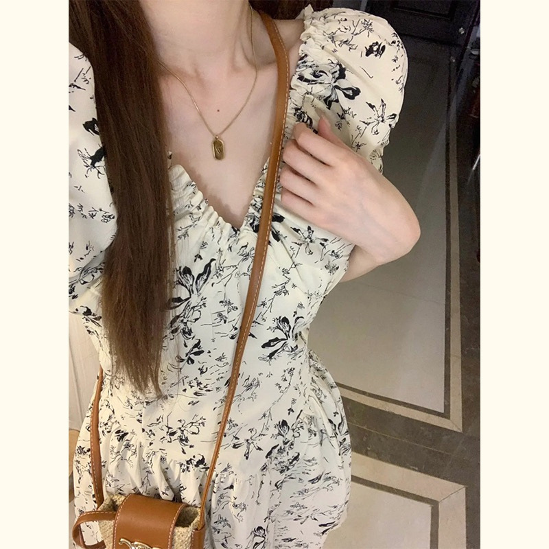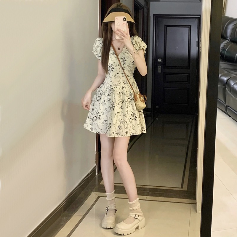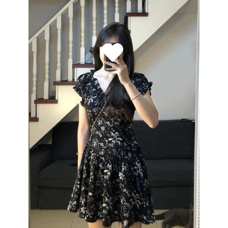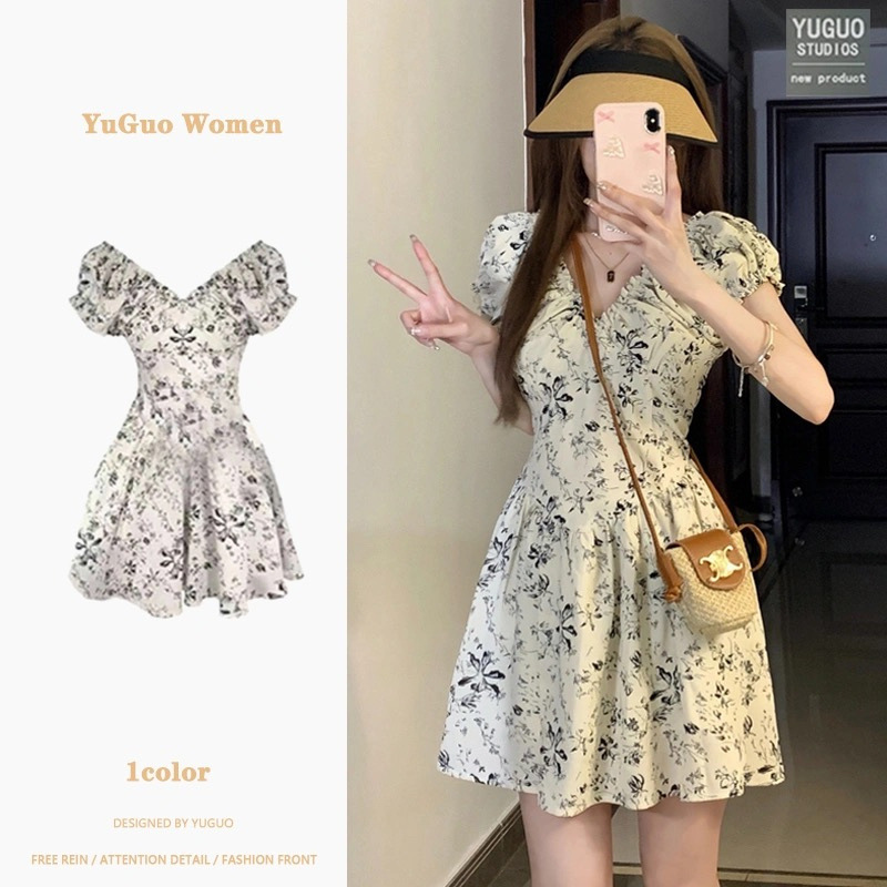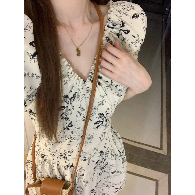 프랑스 복고풍 꽃 원피스 여름 새로운 2025 허리 우아한 고급 V 넥 슬리밍 디자인 스커트스토어 가기
