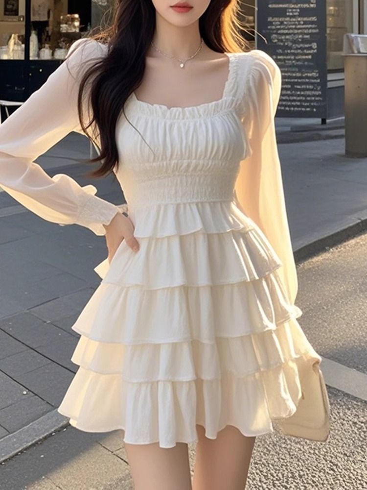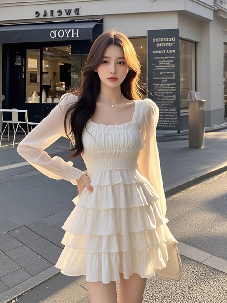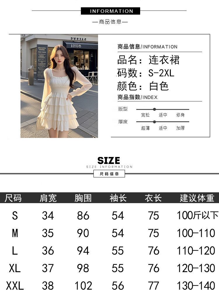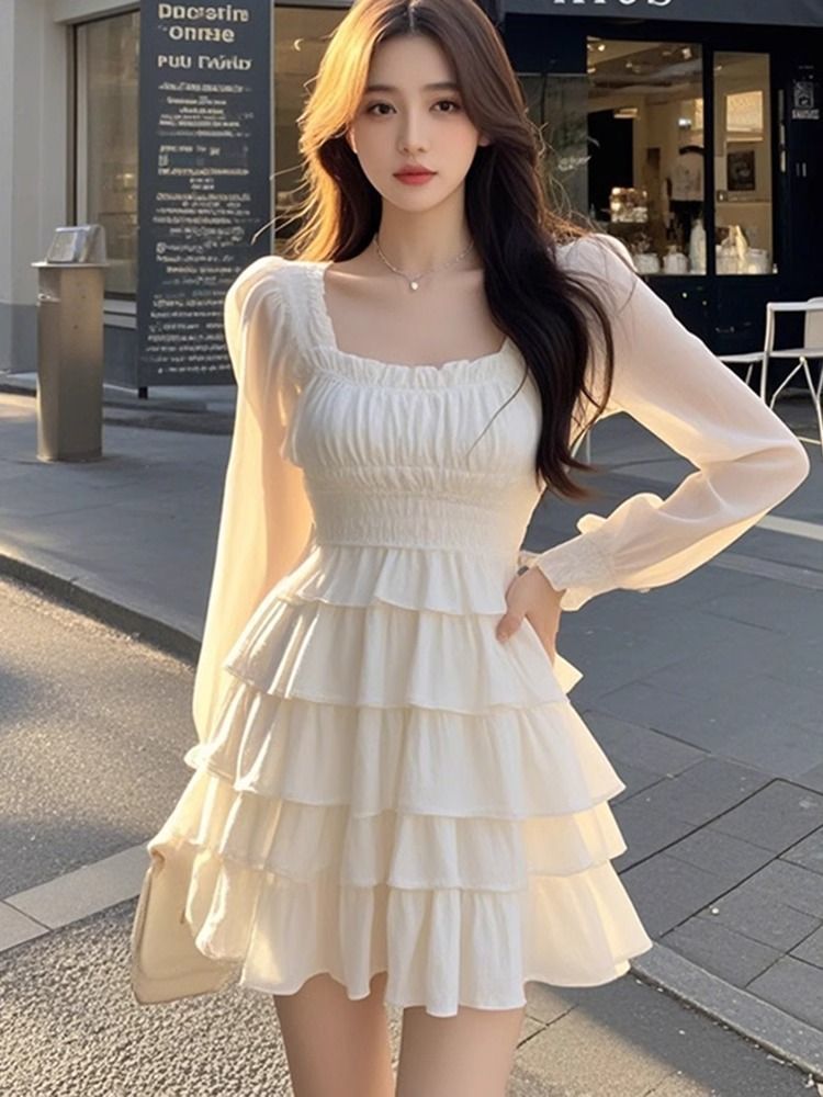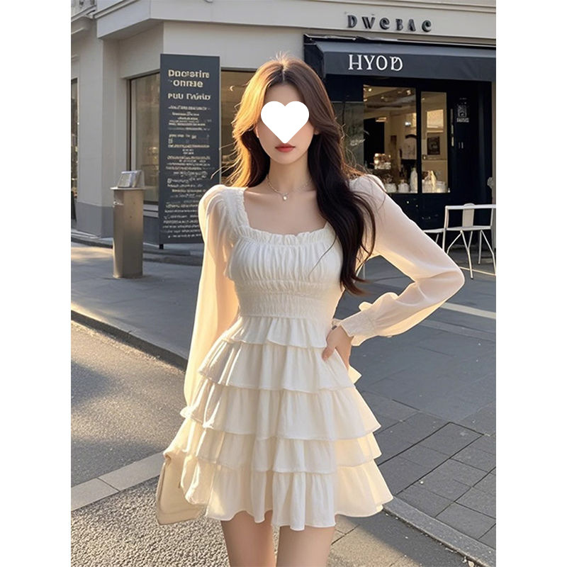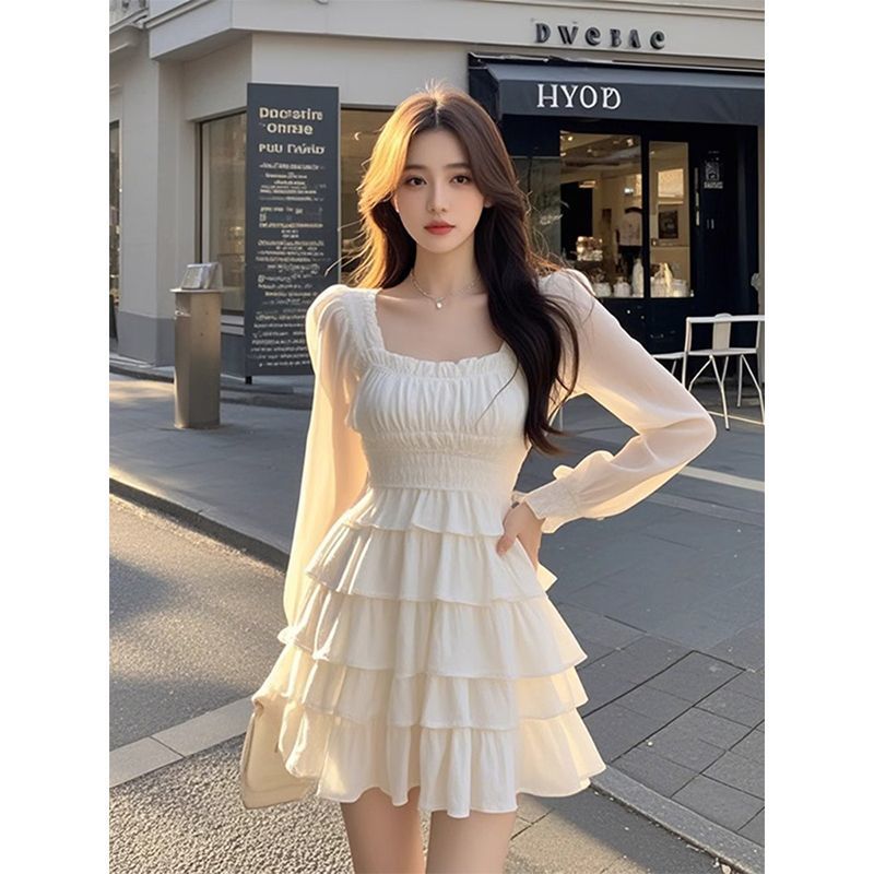 달콤하고 쾌활한 스퀘어 칼라 긴 소매 원피스 여성의 가을과 겨울 프랑스 부드러운 기질 허리 슬림 아름다운 케이크 스커트스토어 가기