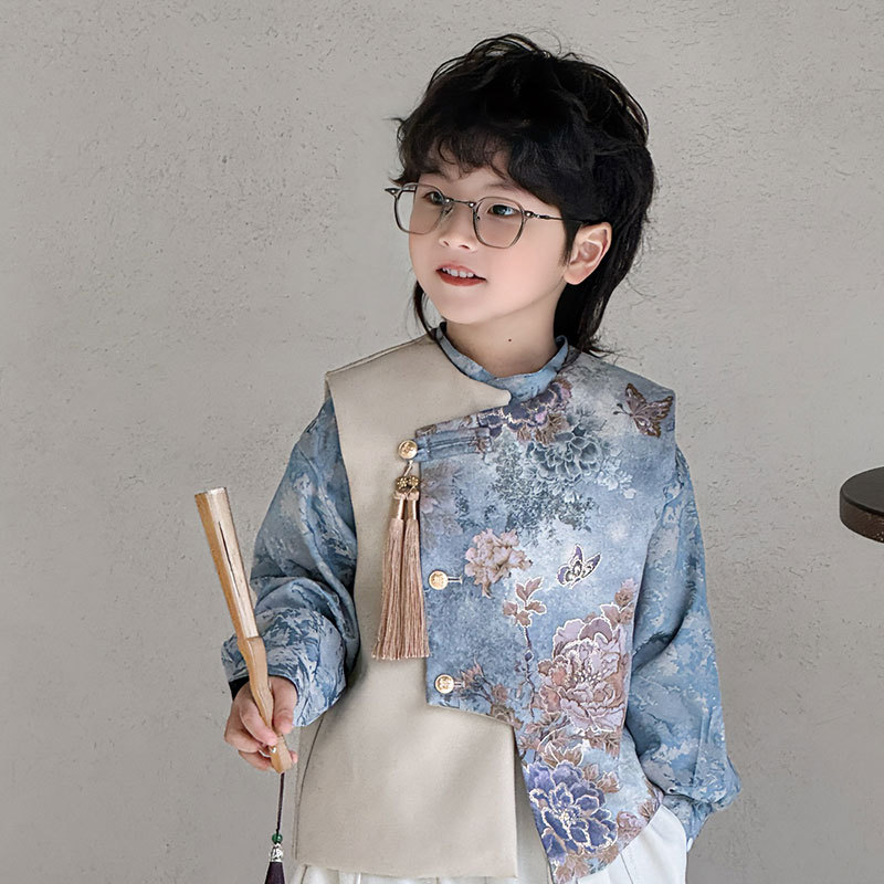 소년 2025 봄과 가을 새로운 어린이 접합 pu 가죽 조끼 국가 조수 중국 스타일 원피스 헤어 타이드스토어 가기