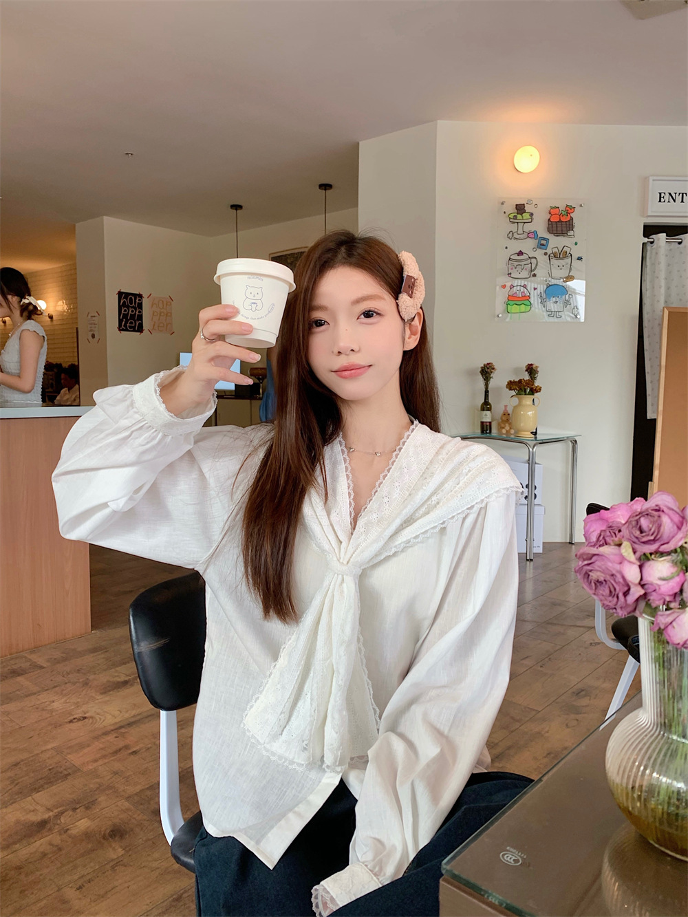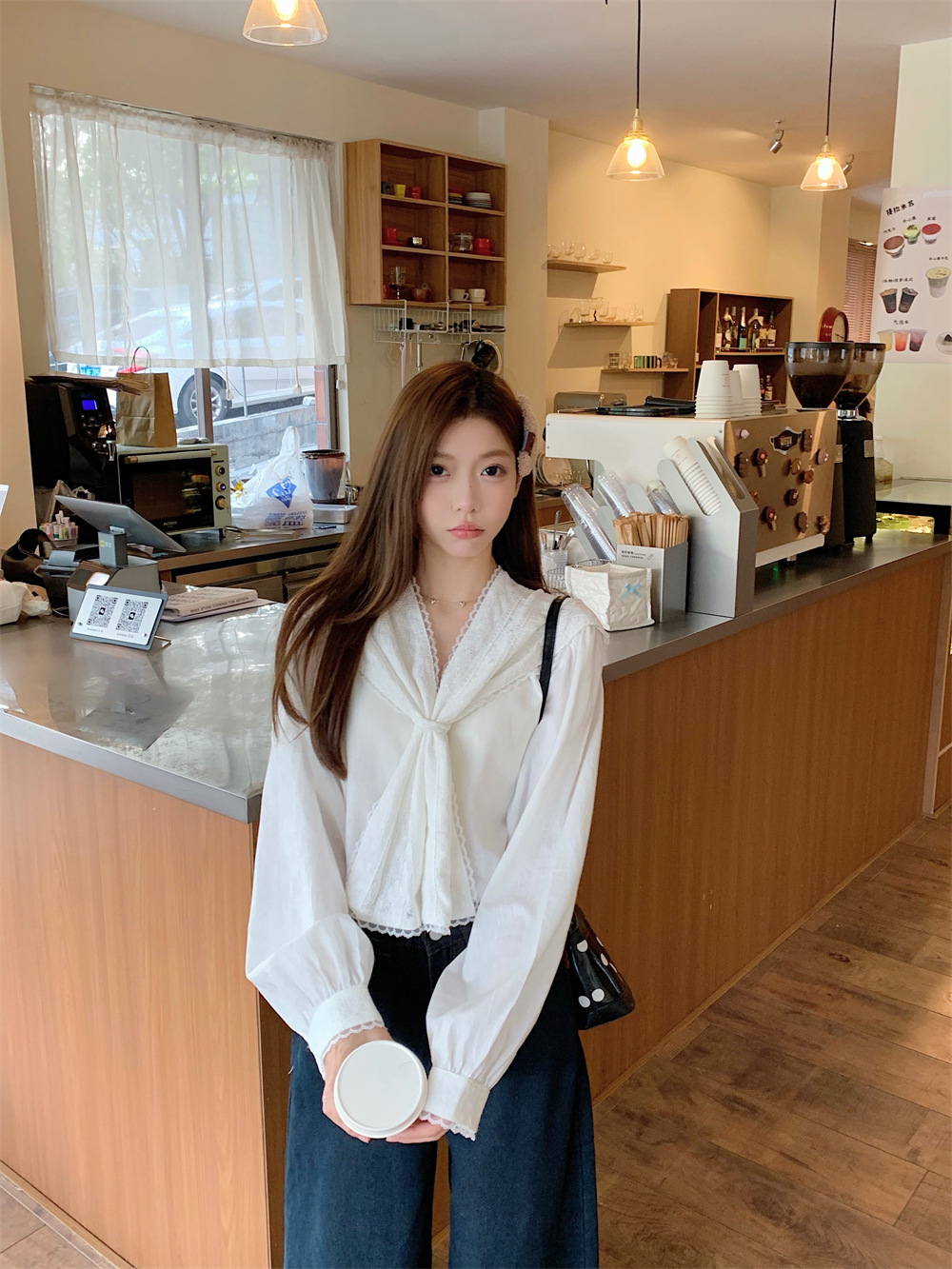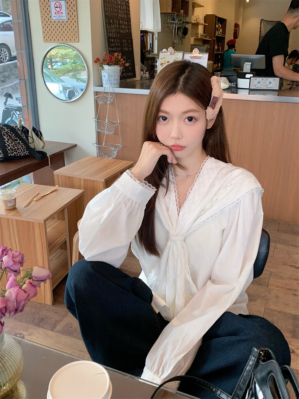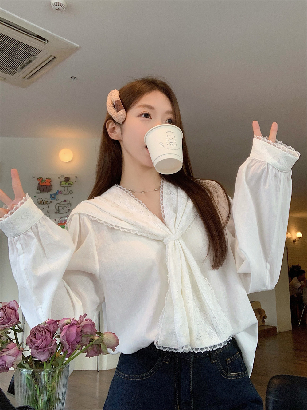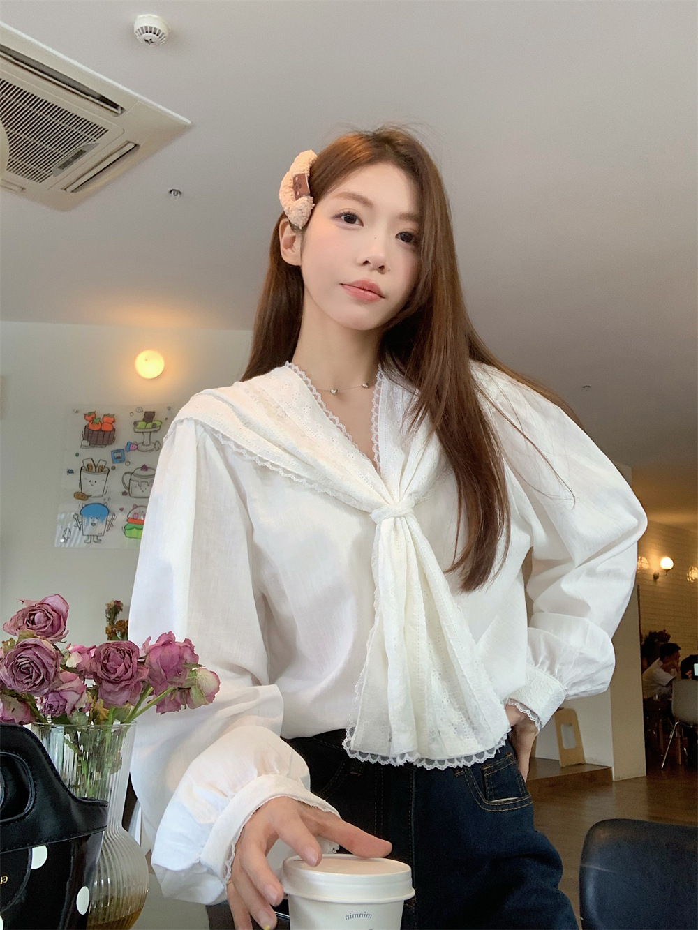 프랑스 레트로 레이스 네이비 칼라 셔츠 여성용 스프링 니치 칙 루즈 긴팔 쉬폰 탑 트렌디스토어 가기