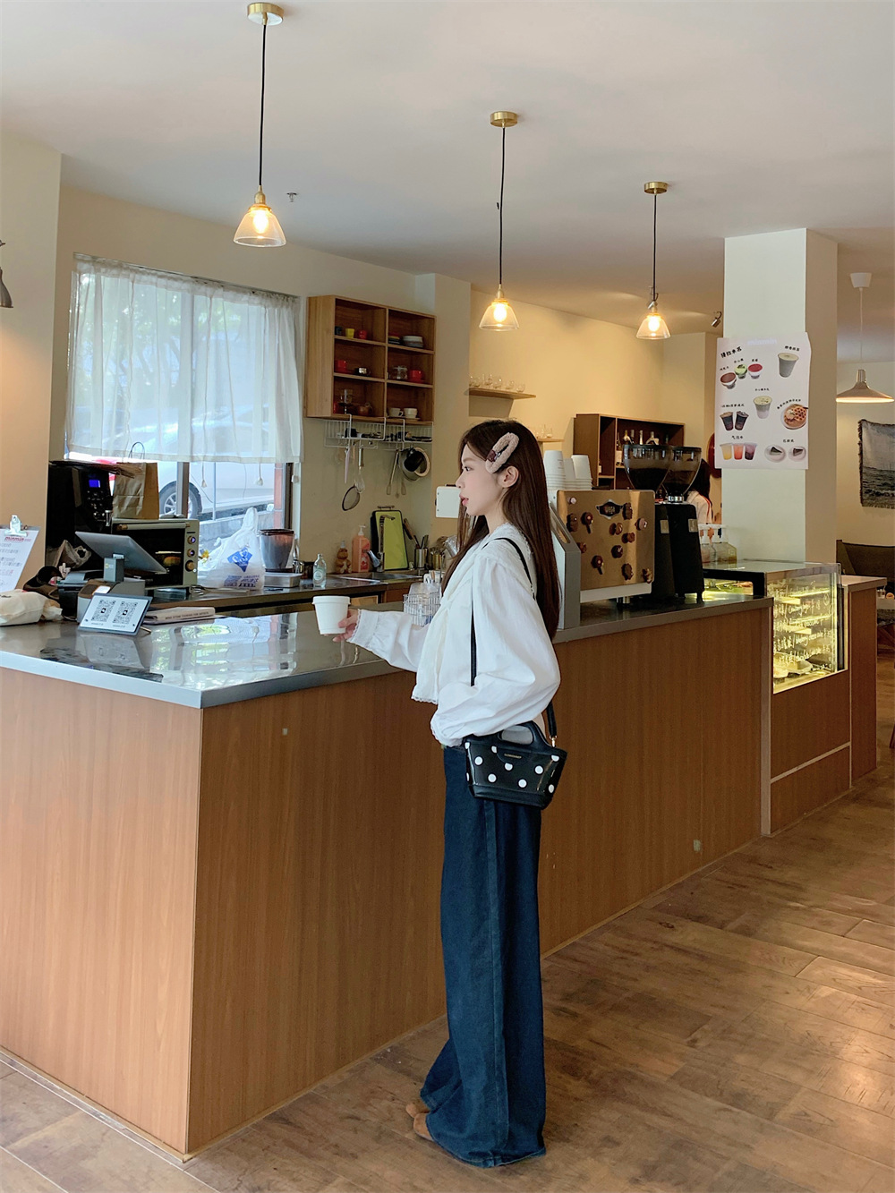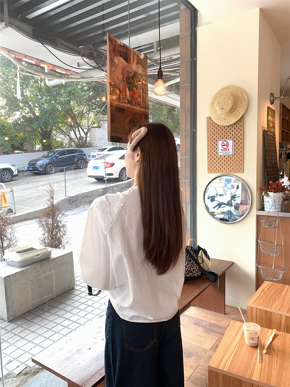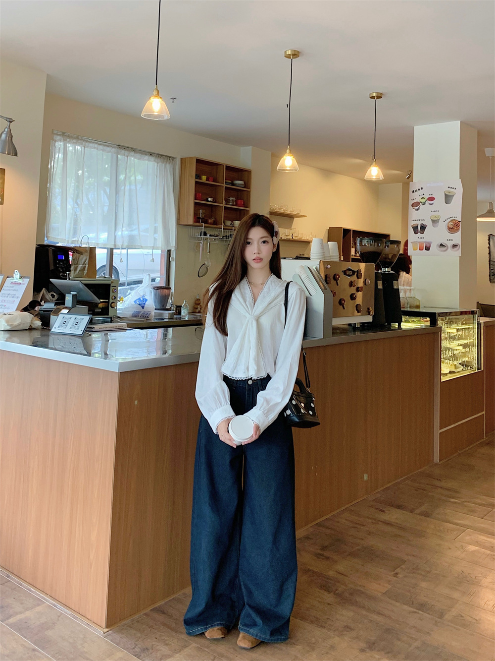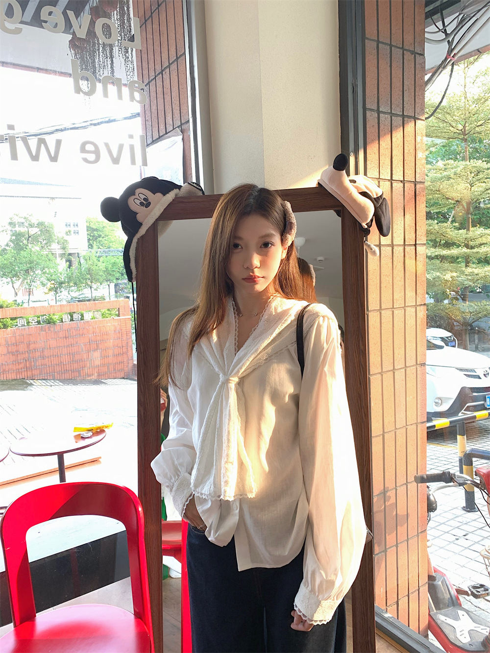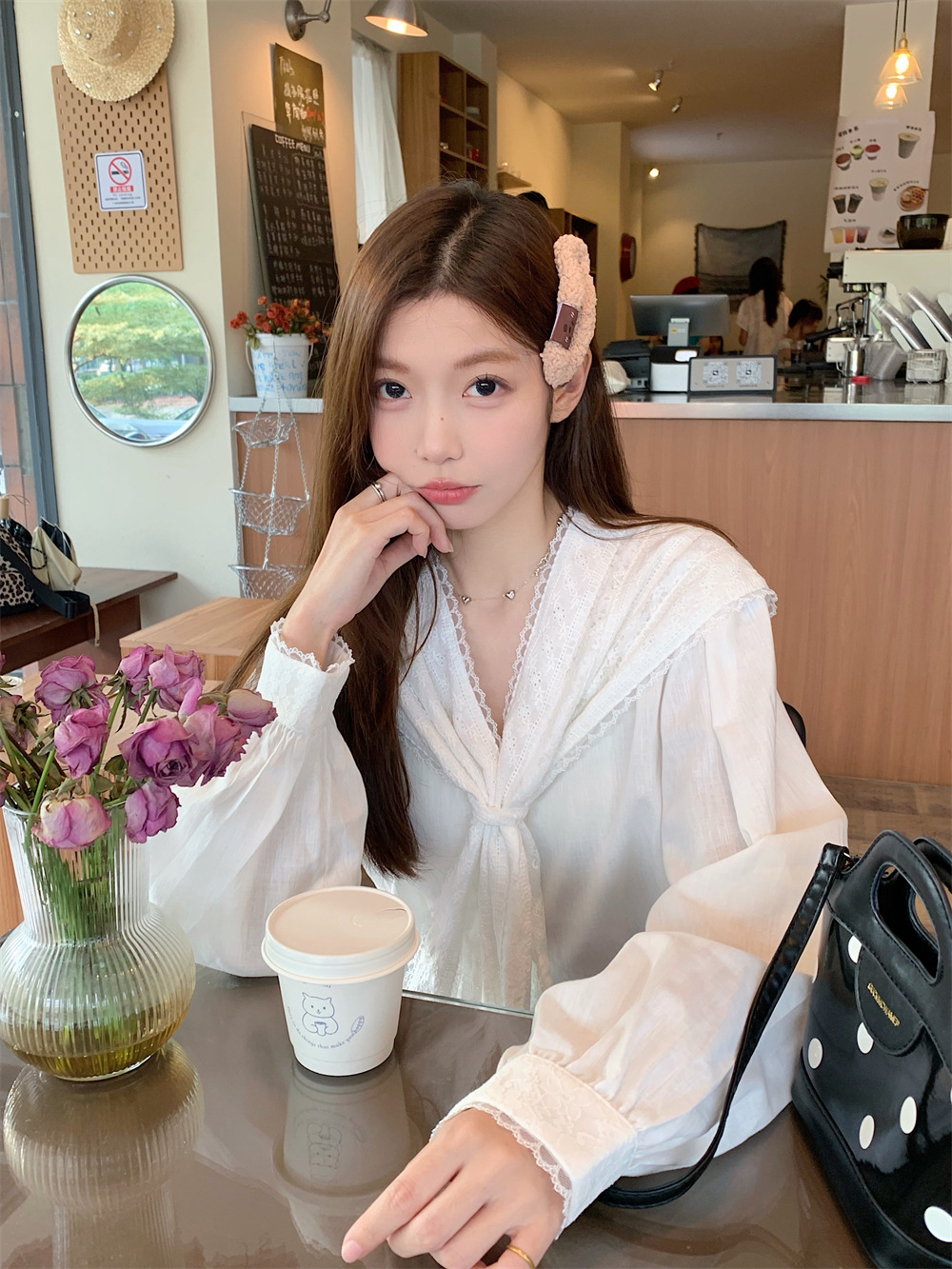 프랑스 레트로 레이스 네이비 칼라 셔츠 여성용 스프링 니치 칙 루즈 긴팔 쉬폰 탑 트렌디스토어 가기