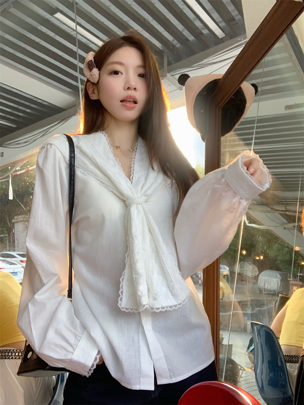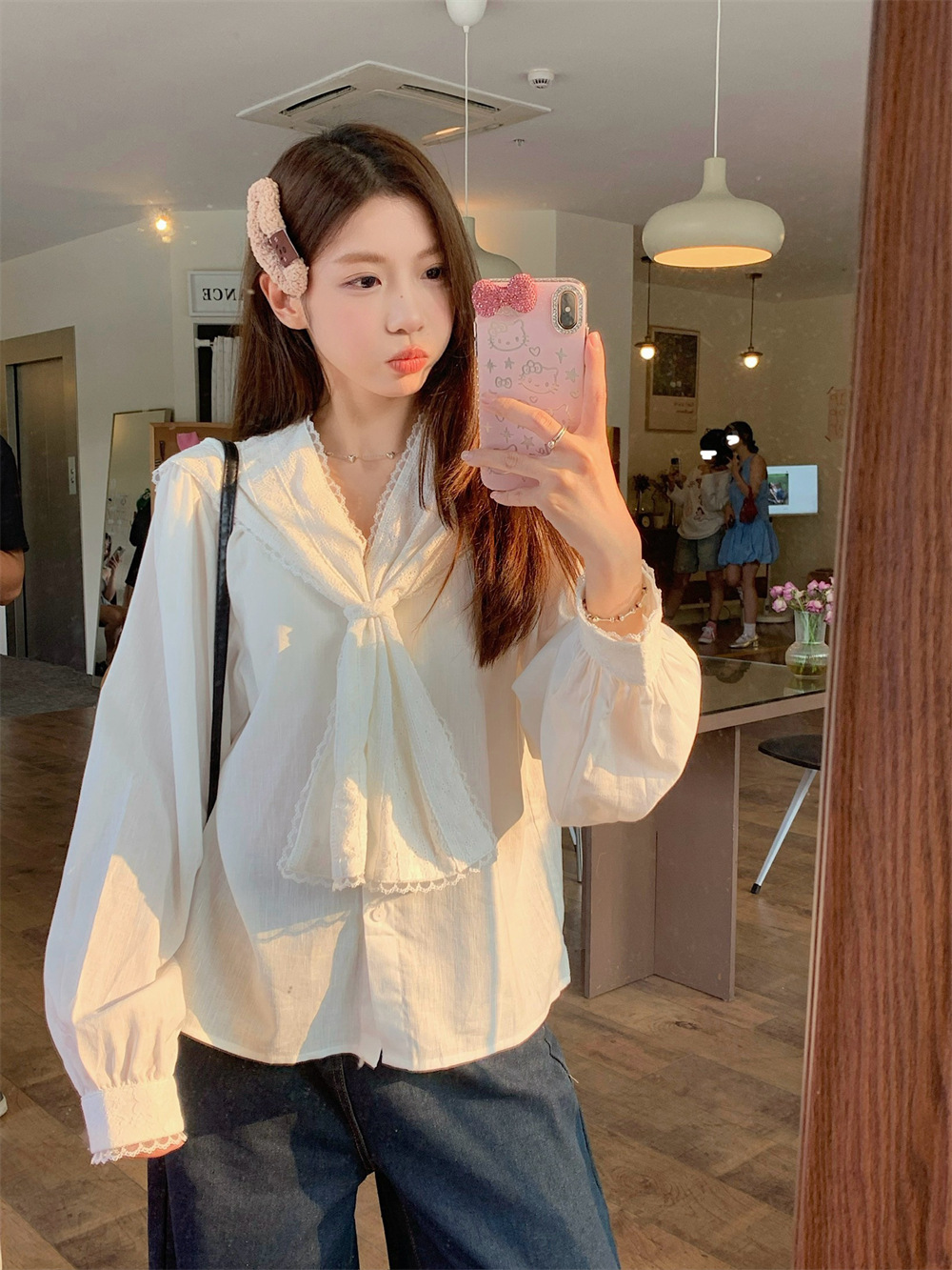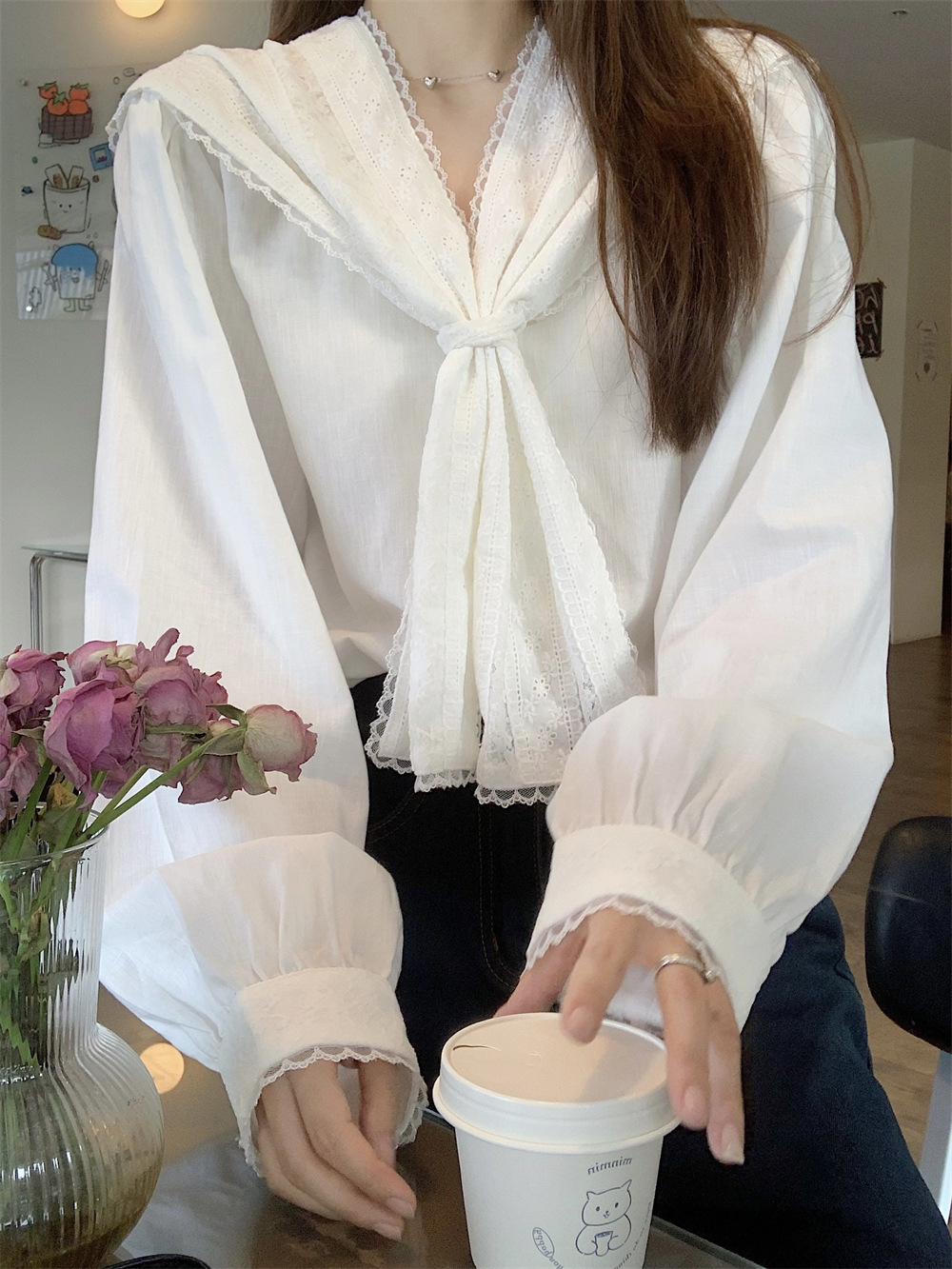 프랑스 레트로 레이스 네이비 칼라 셔츠 여성용 스프링 니치 칙 루즈 긴팔 쉬폰 탑 트렌디