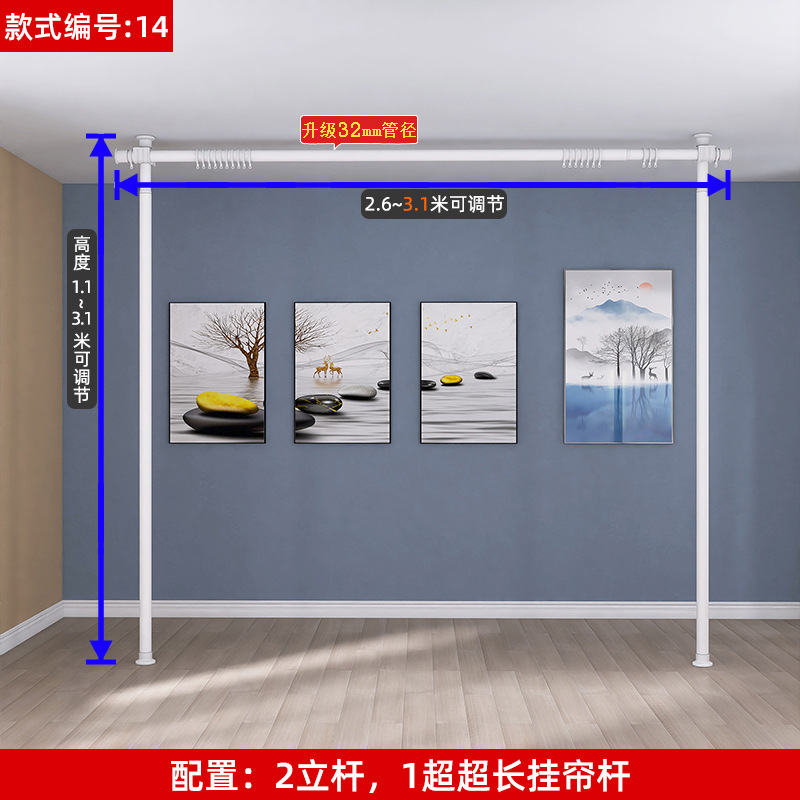 • 13개 이상의 커튼(수직 2개, 수평 막대 1개 2.1- 2.6m )