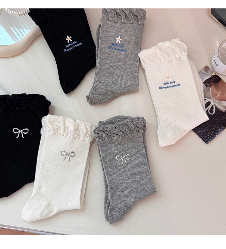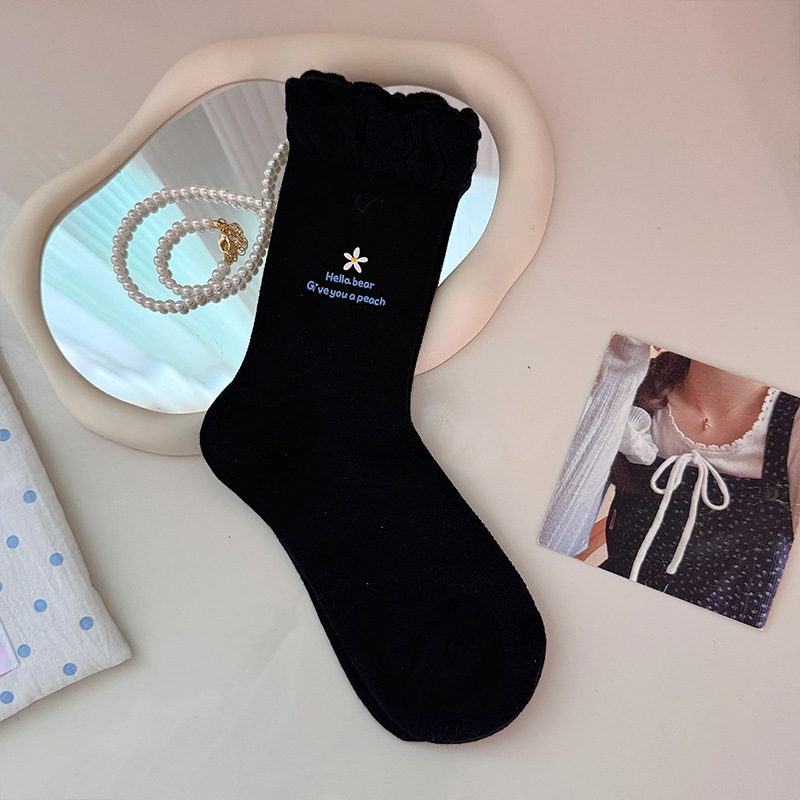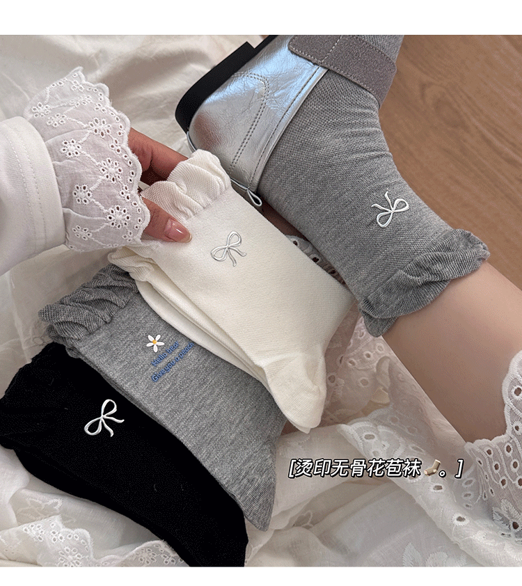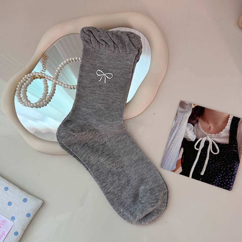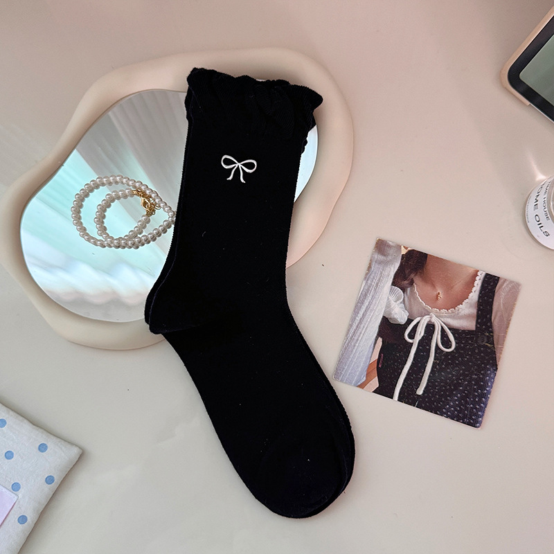 핫 스탬핑 보우 레이스 뼈없는 양말 여성용 미드 튜브 양말 봄과 여름 새로운 얇은 레이스 메쉬 한국식 스택 양말