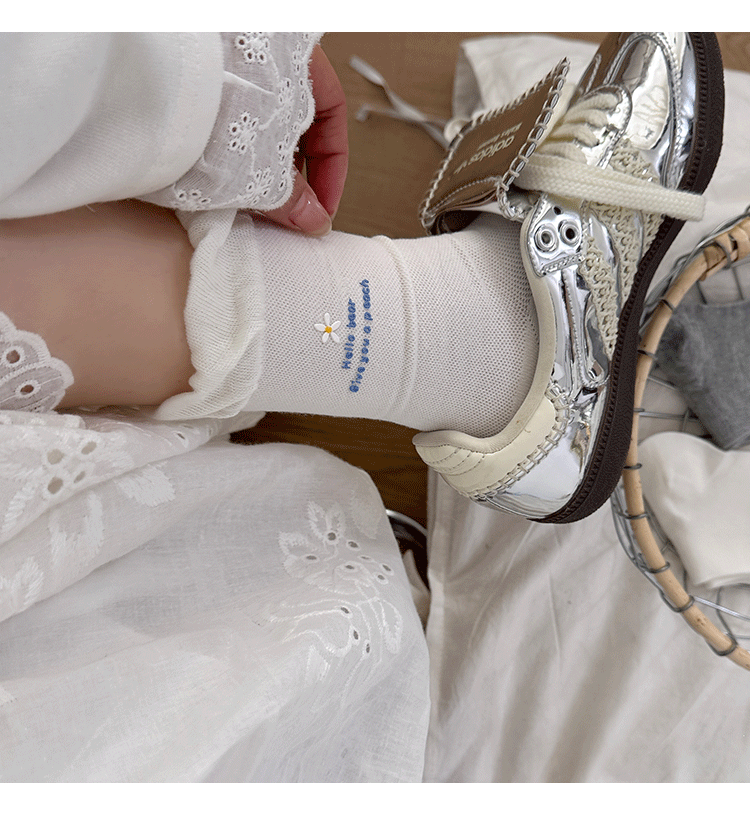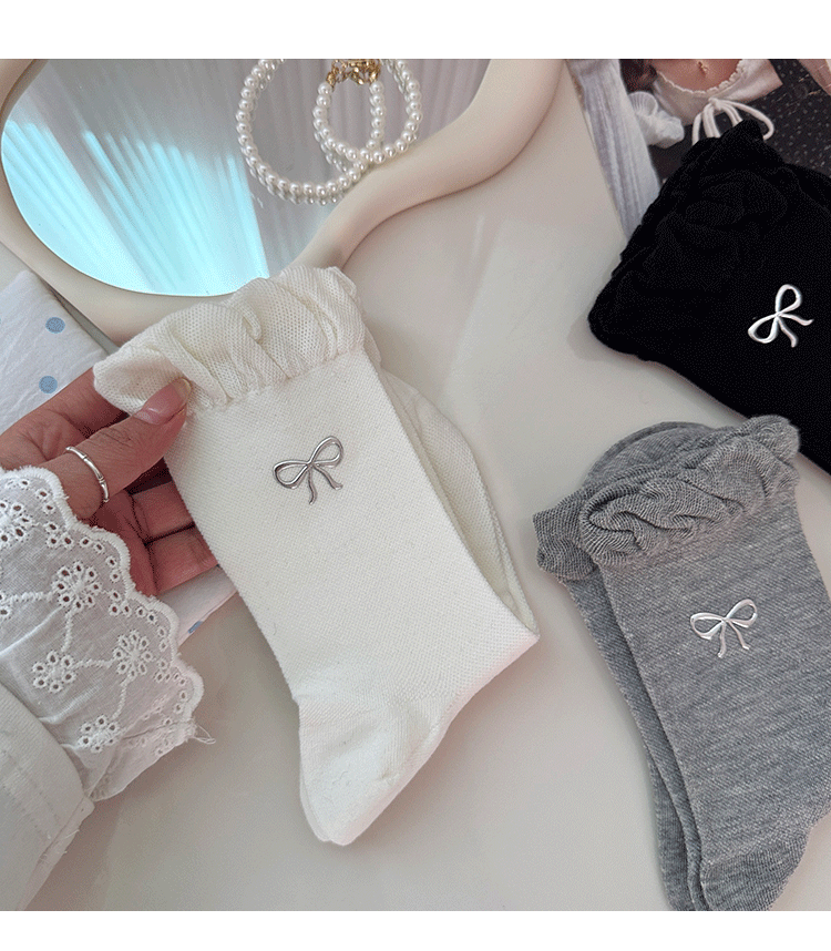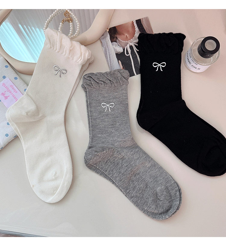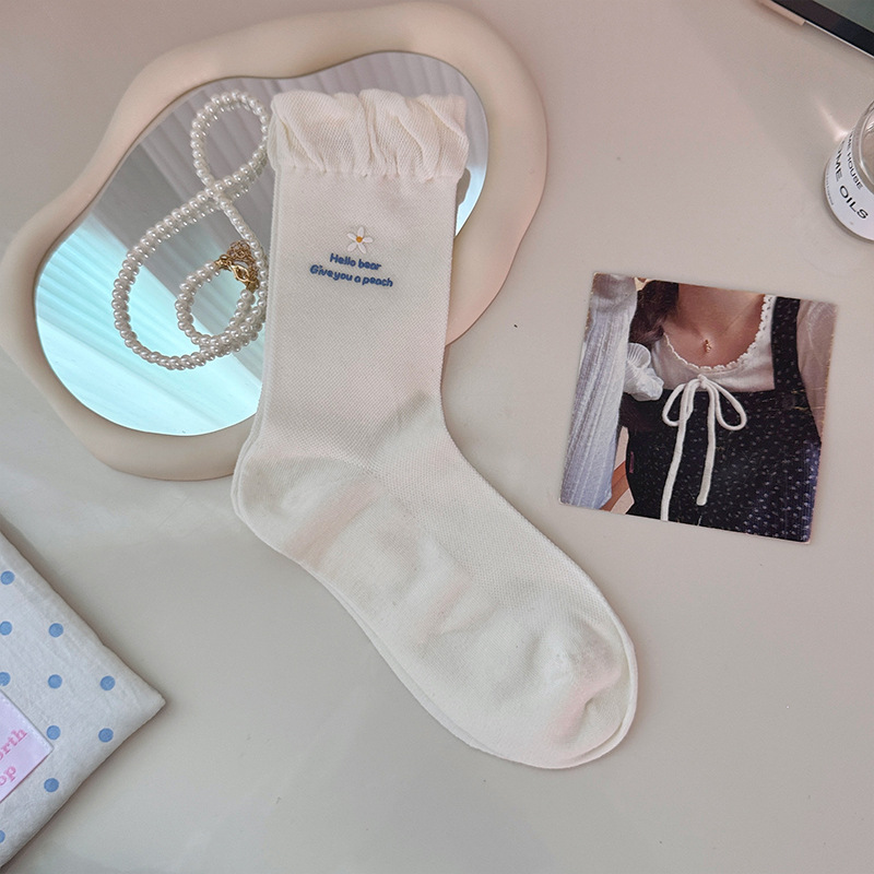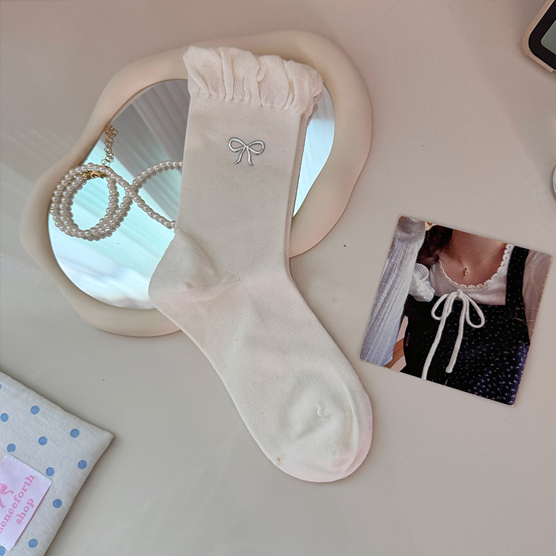 핫 스탬핑 보우 레이스 뼈없는 양말 여성용 미드 튜브 양말 봄과 여름 새로운 얇은 레이스 메쉬 한국식 스택 양말스토어 가기