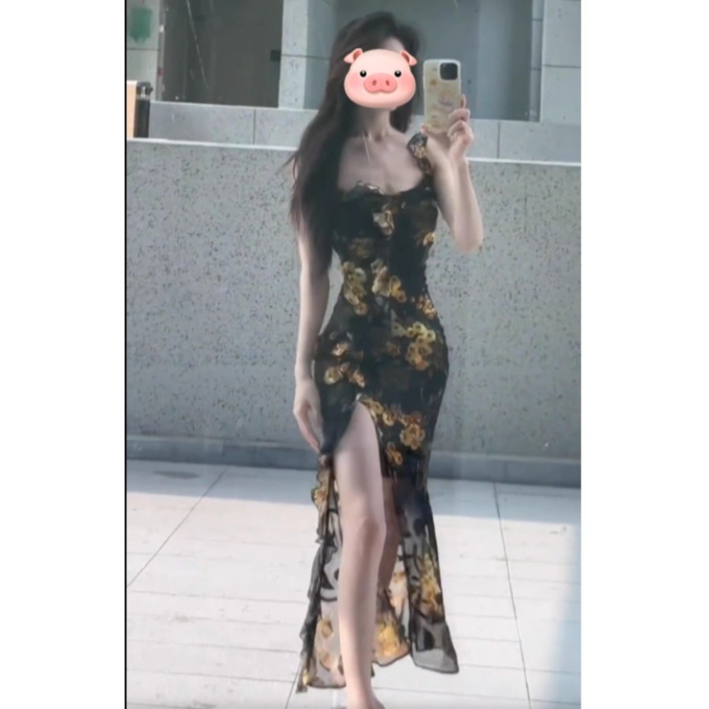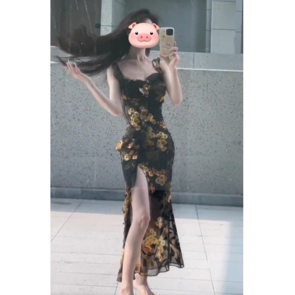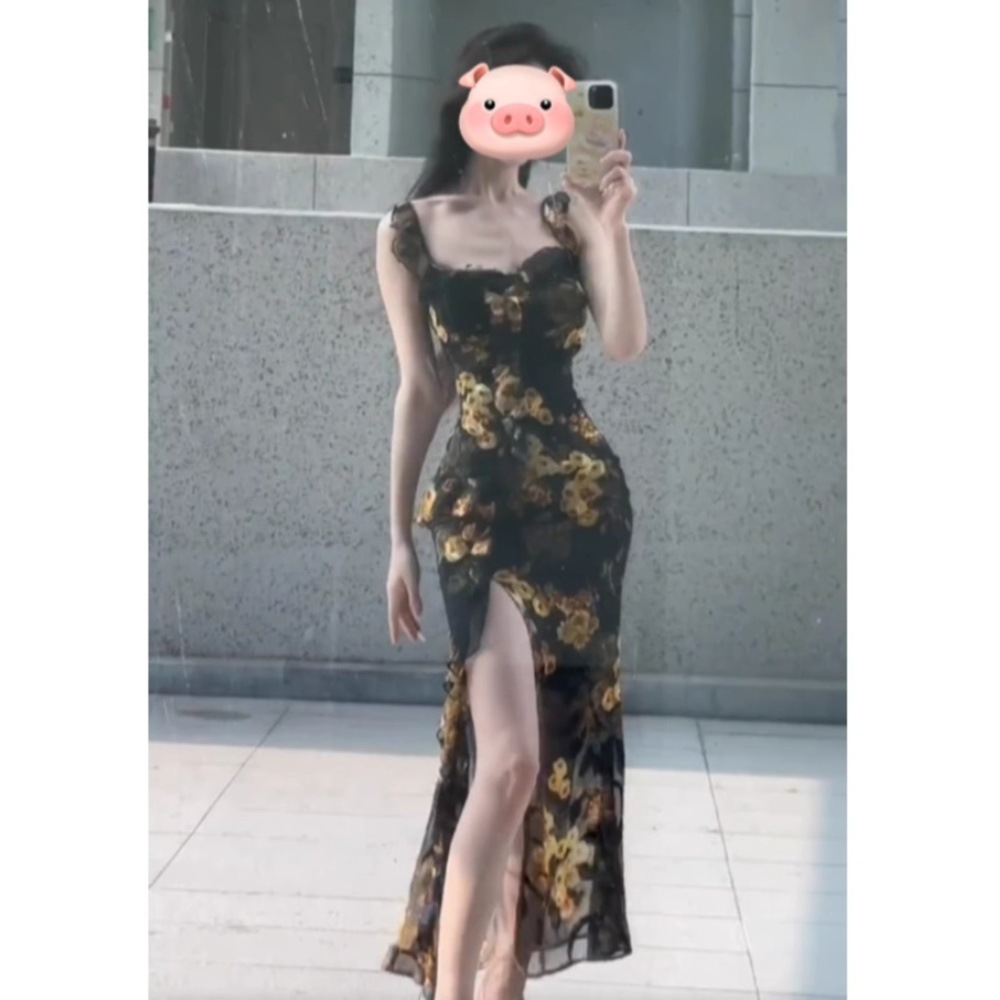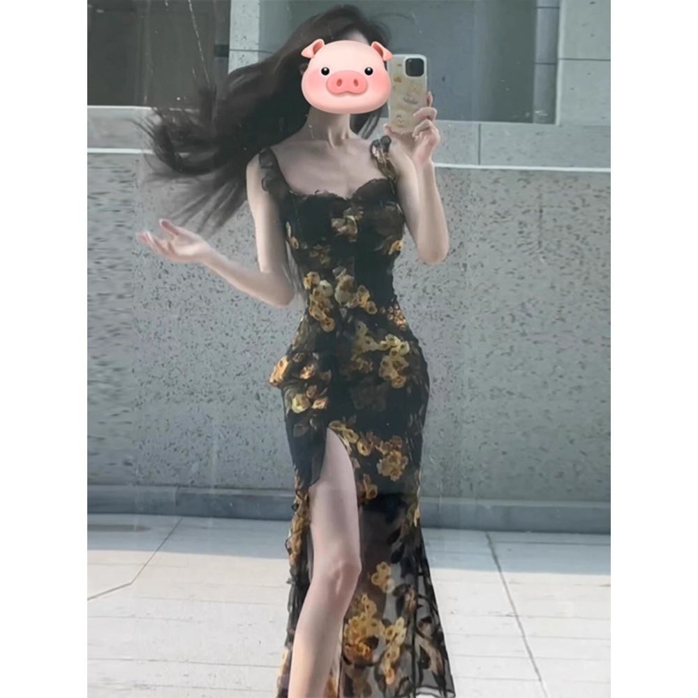 여성 여름 빈티지 꽃 슬링 원피스 우아한 러플 핏 슬림 핏 타이트 허리 슬리밍 스플릿 쉬스 롱 스커트