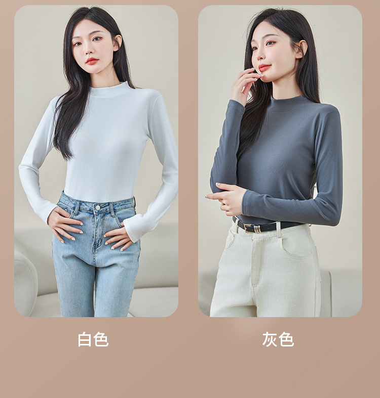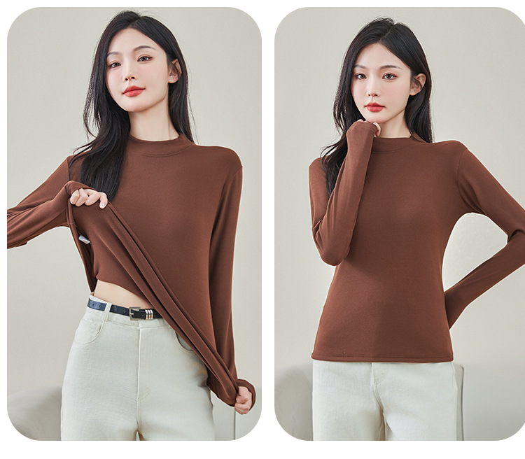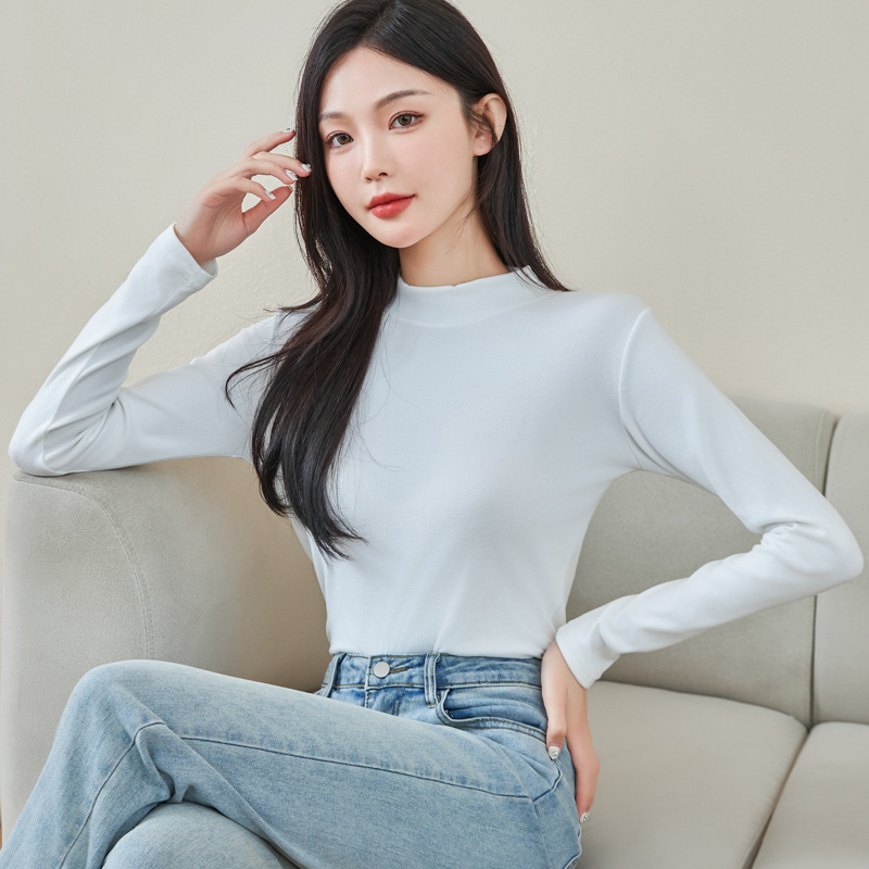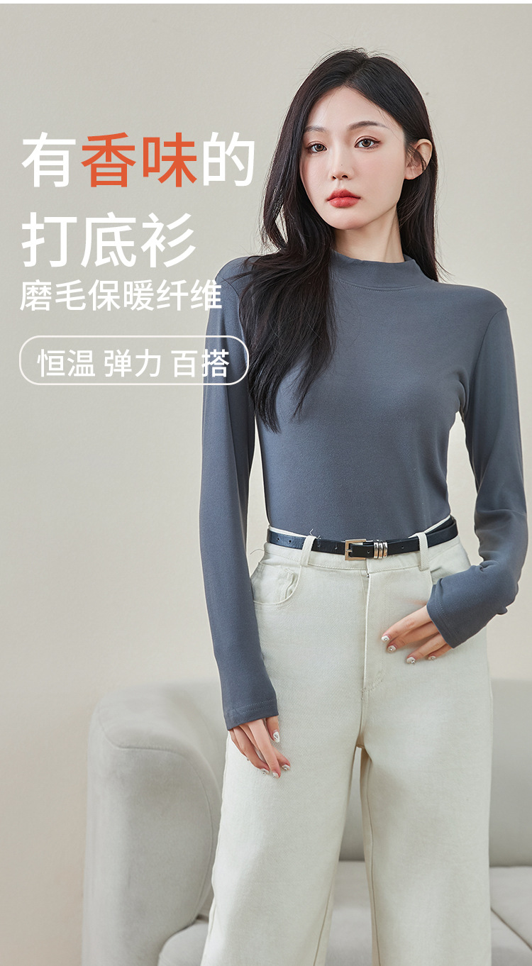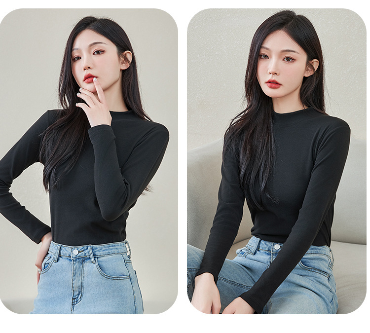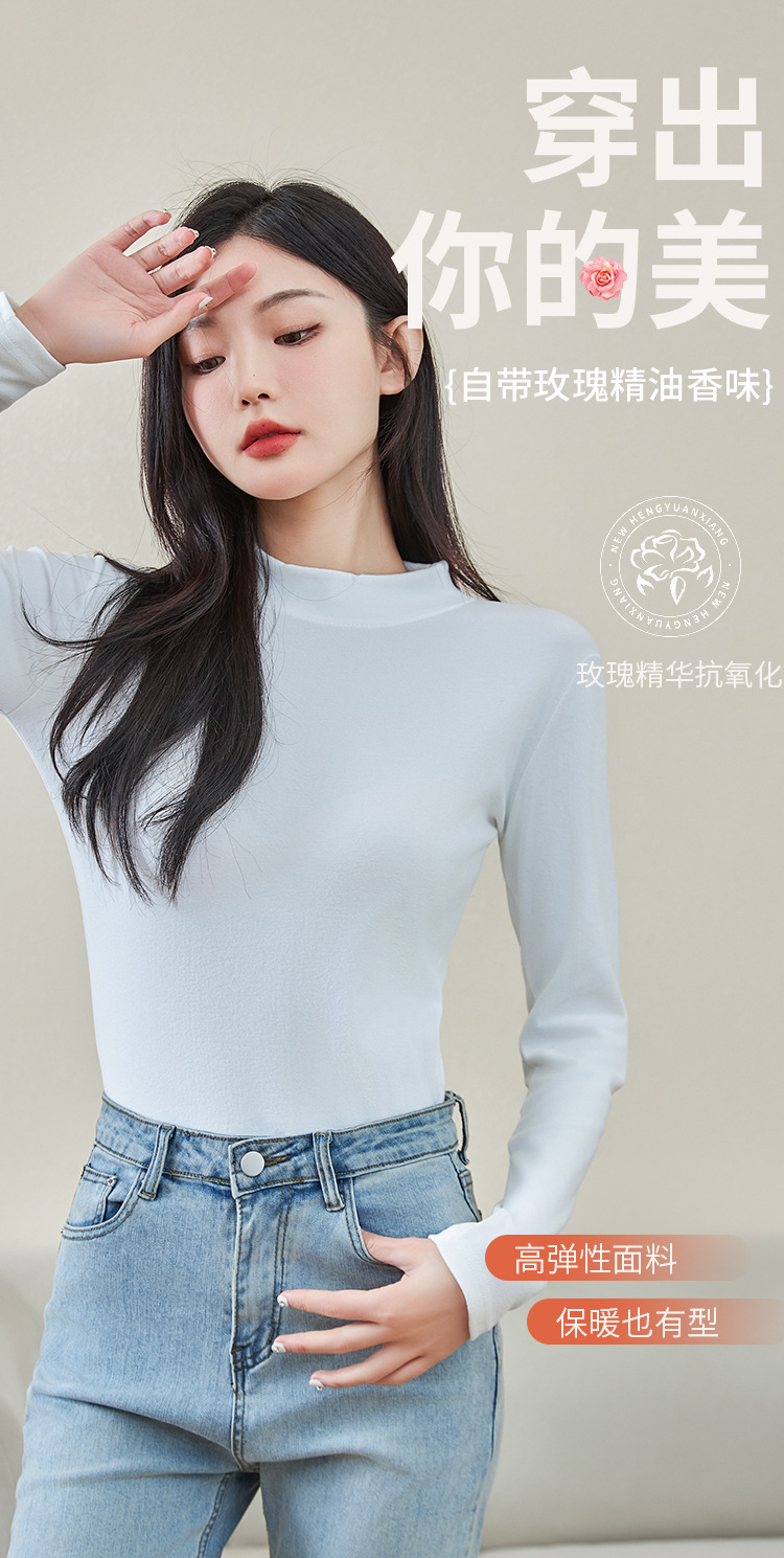 로즈 에센셜 오일 여성용 라운드 넥 바닥 셔츠 가을, 겨울 양면 기모 하프 터틀넥 미드 칼라 따뜻한 탑 긴팔 티셔츠스토어 가기