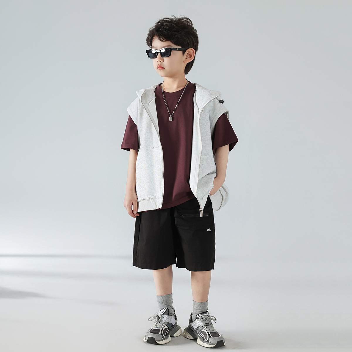 소년 여름 정장 어린이 여름 한국어 버전 2025 새로운 스포츠 티셔츠 아동 의류 후드 조끼 반바지 간단한 트렌드스토어 가기