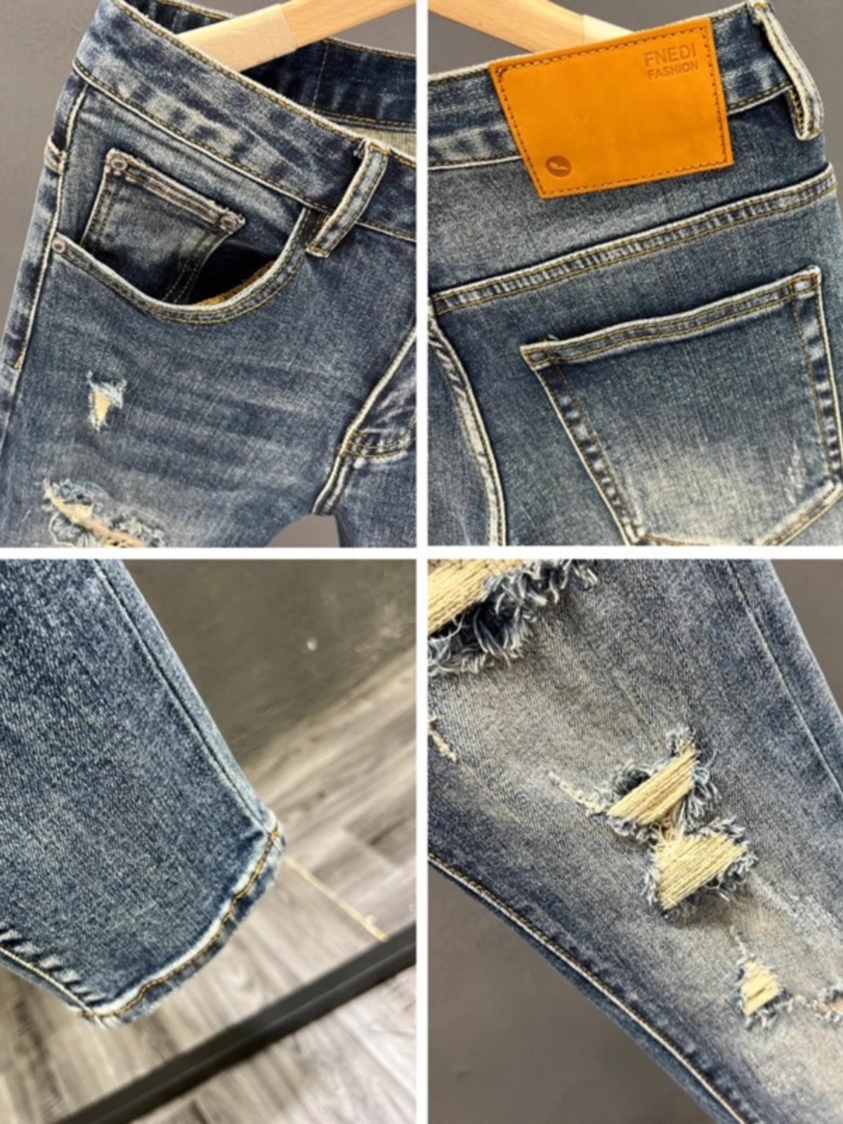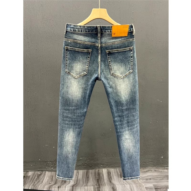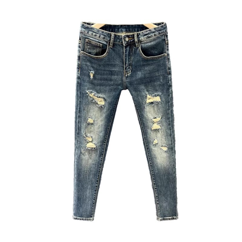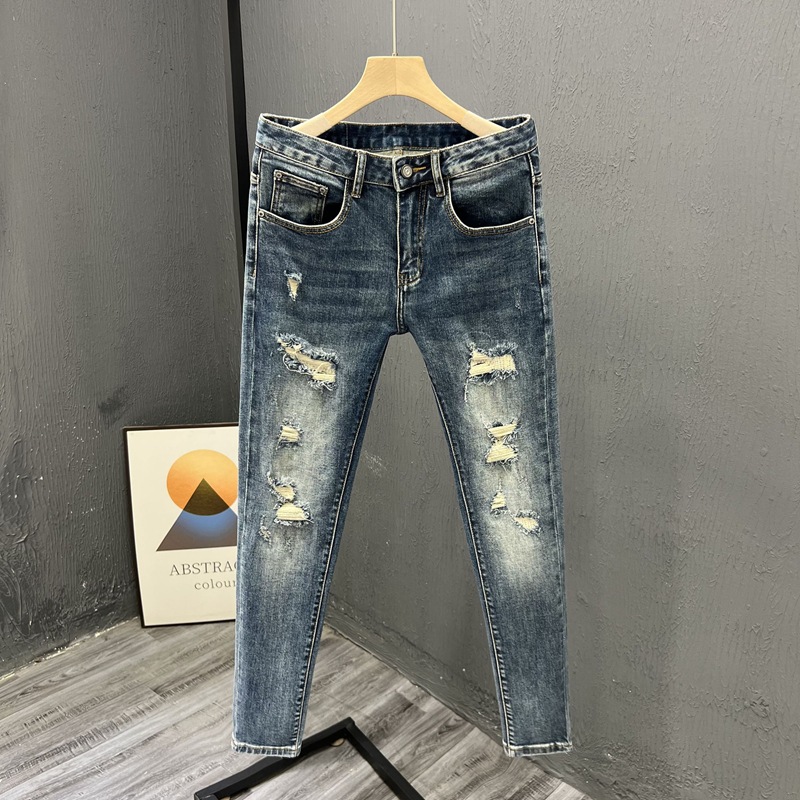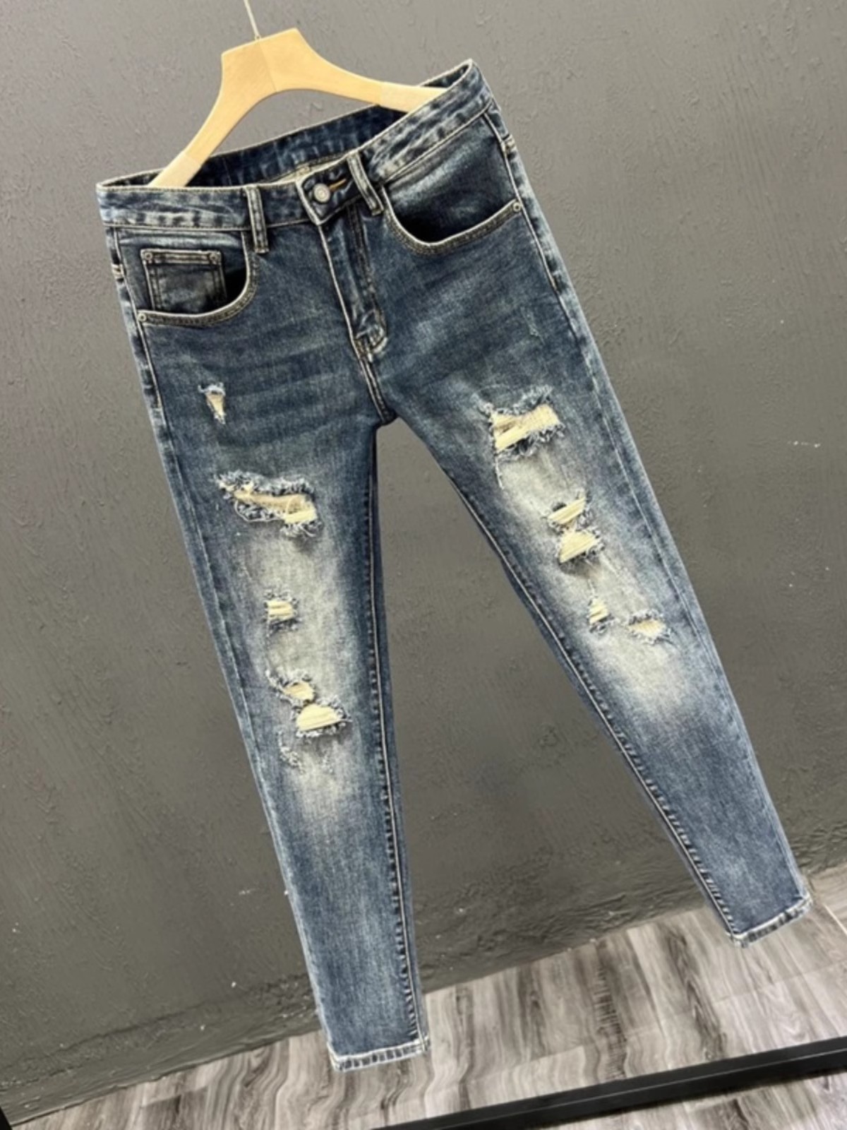 남성용 한국식 슬림 핏 스키니 팬츠 봄과 가을 트렌디 한 신축성있는 슬림 한 발목 길이 바지 청소년 패션 찢어진 청바지스토어 가기