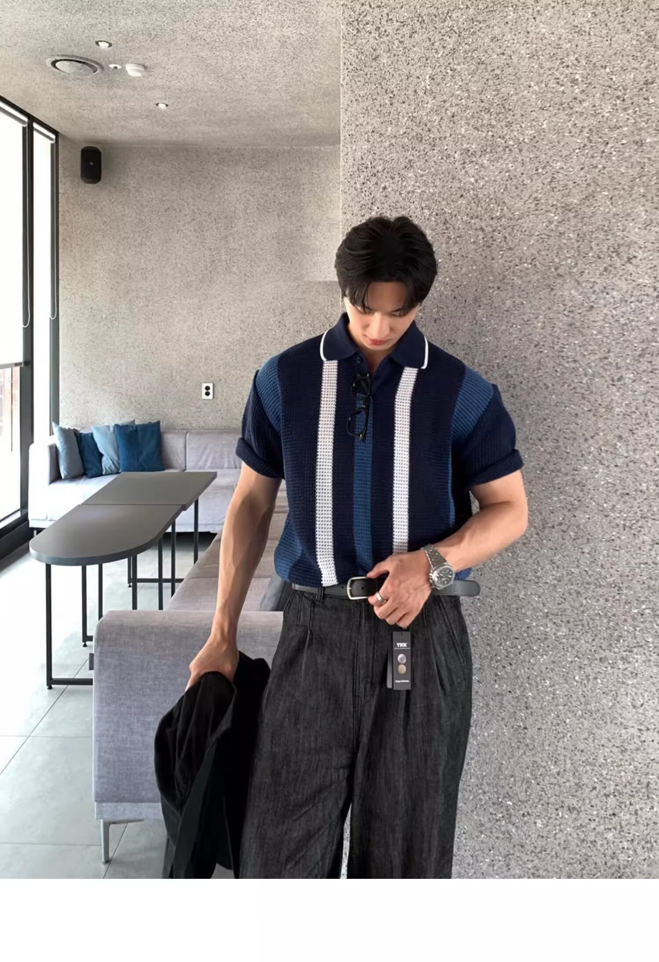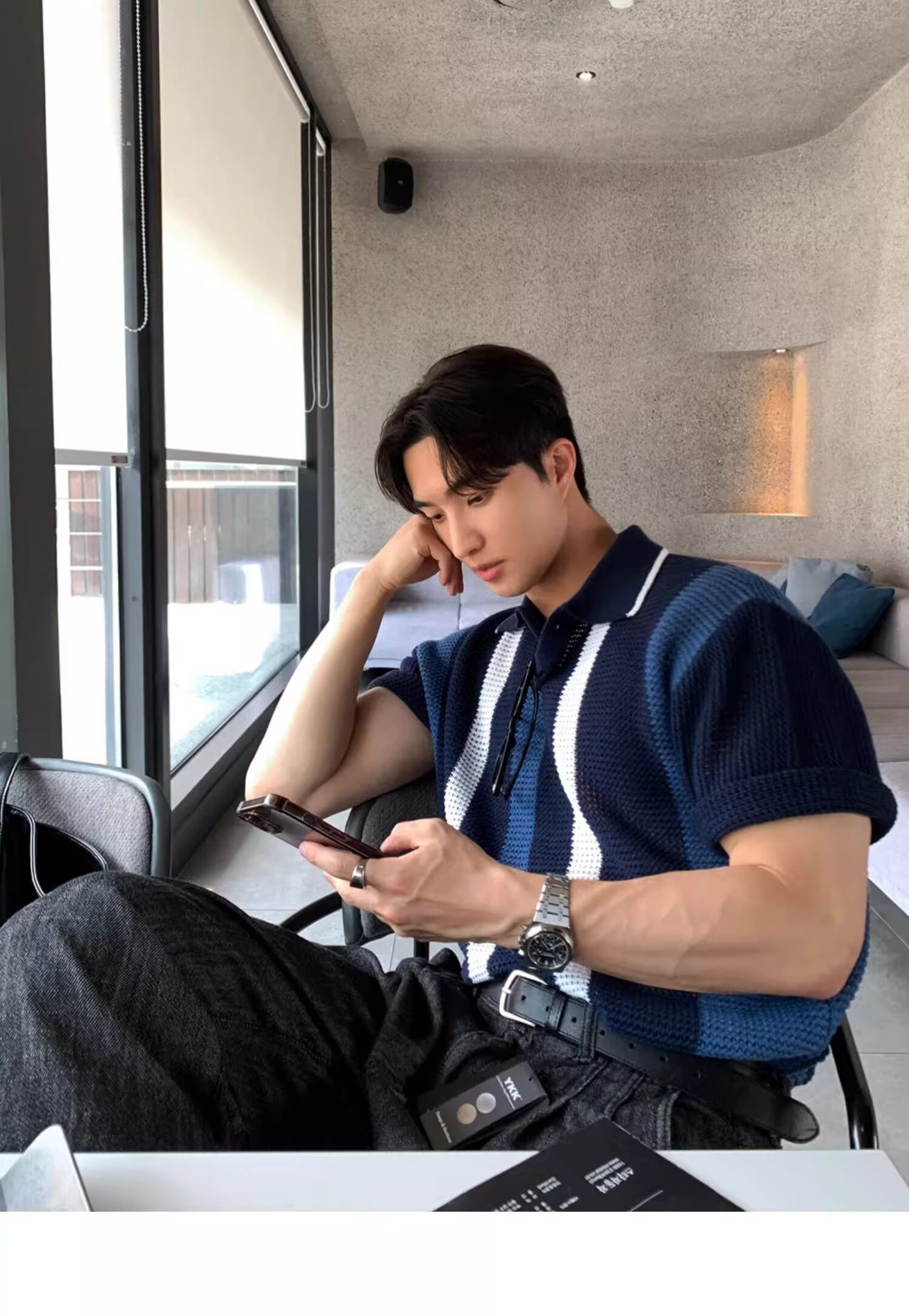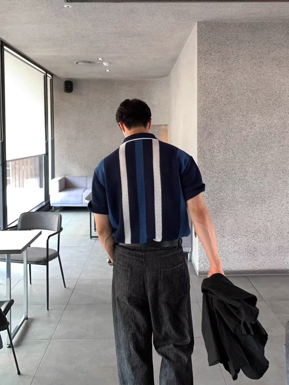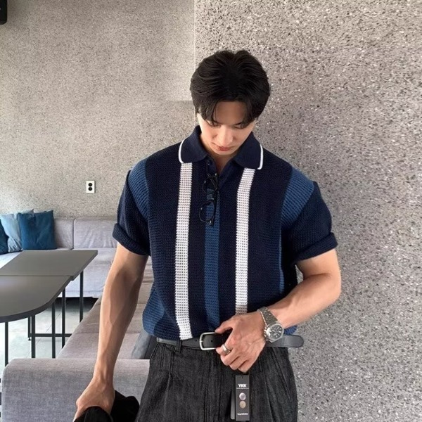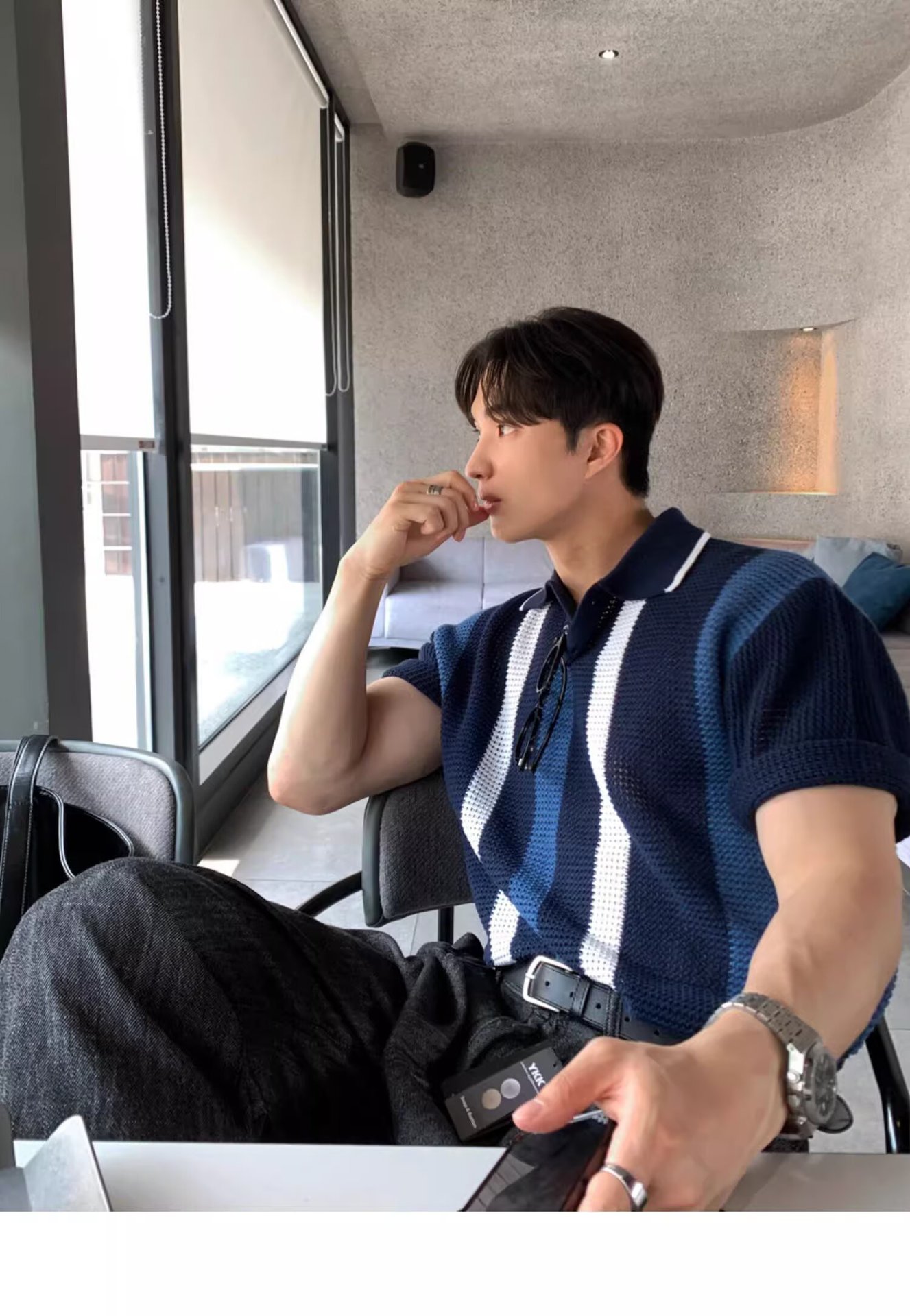2025 새로운 스타일 우아한 여름 유행 청소년 인기있는 남성 니트 스웨터 예술적 표준 모든 경기 유행 줄무늬 단순 짧은스토어 가기