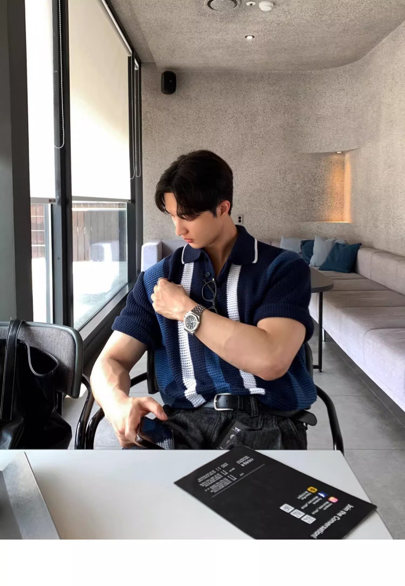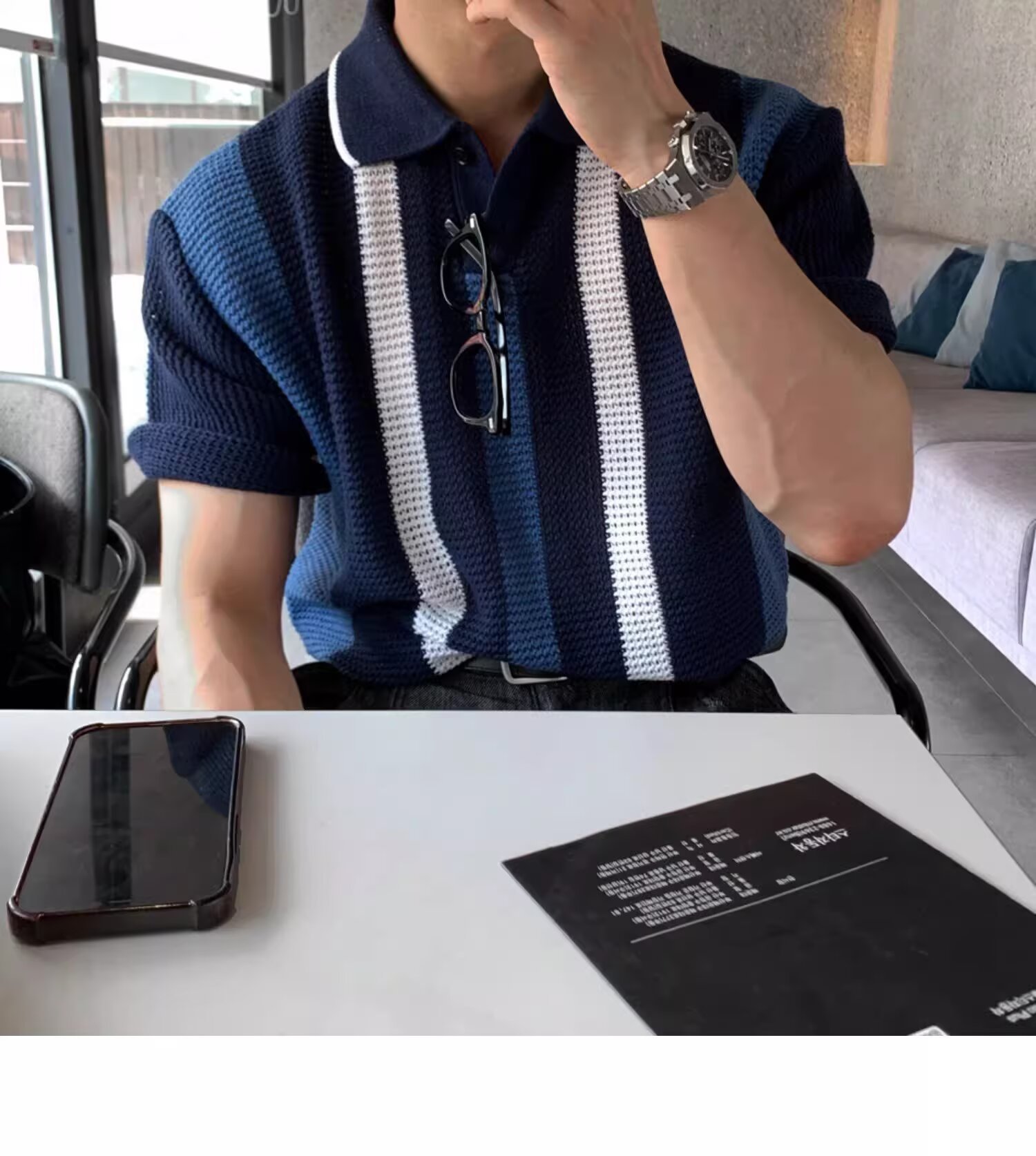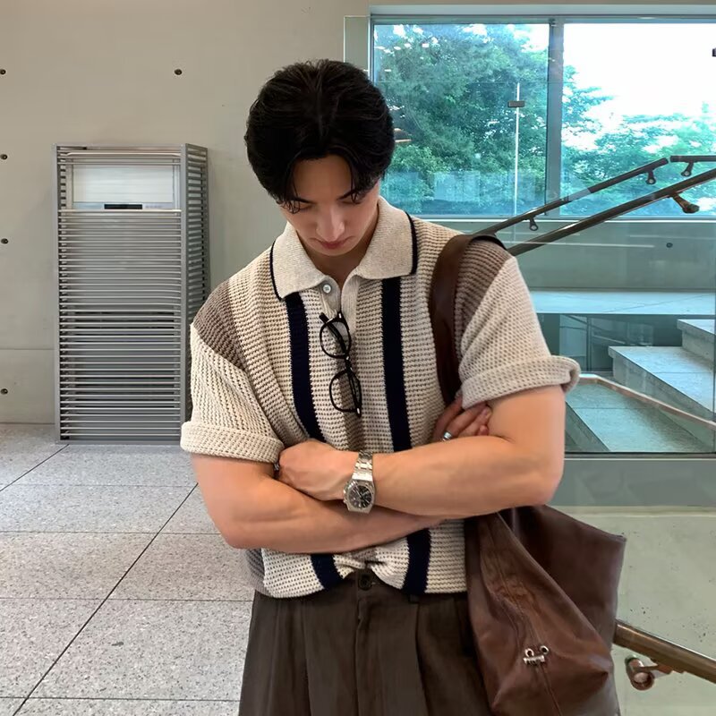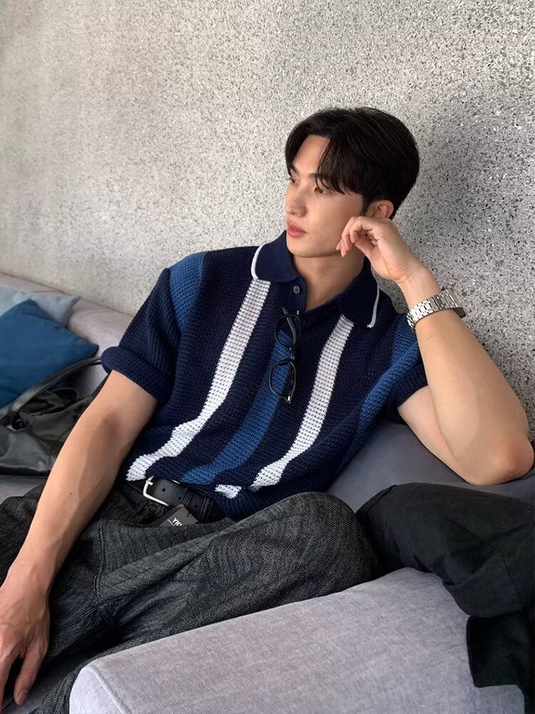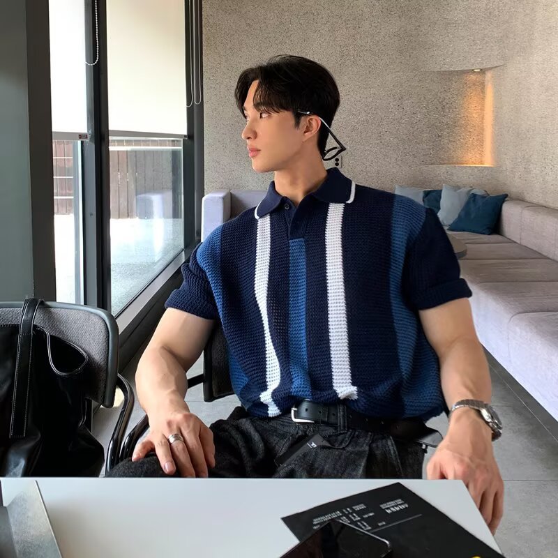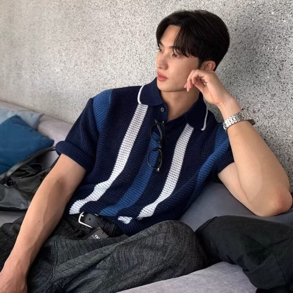 2025 새로운 스타일 우아한 여름 유행 청소년 인기있는 남성 니트 스웨터 예술적 표준 모든 경기 유행 줄무늬 단순 짧은스토어 가기