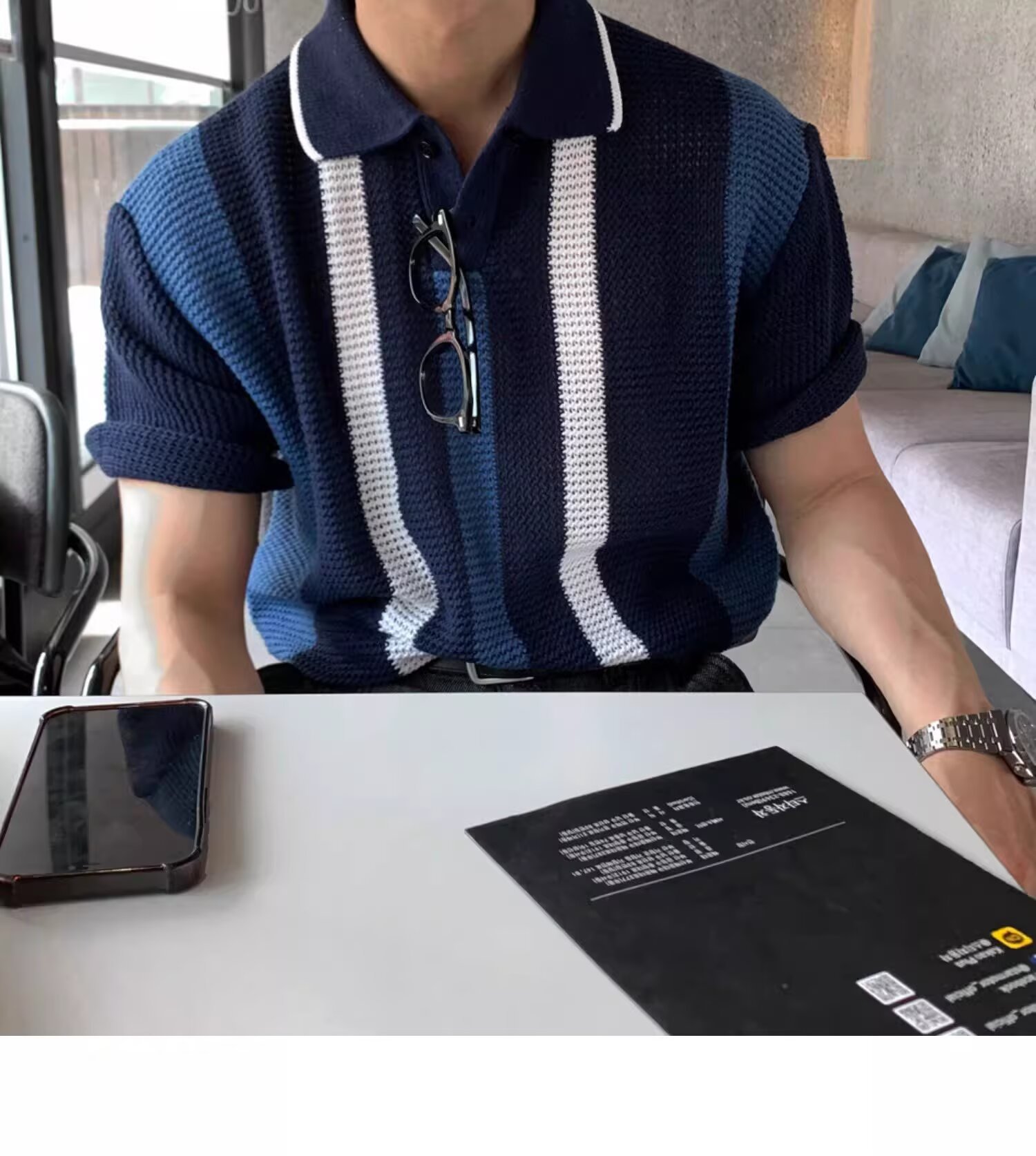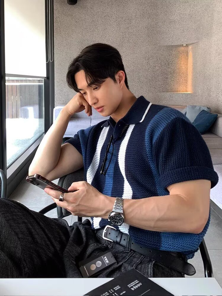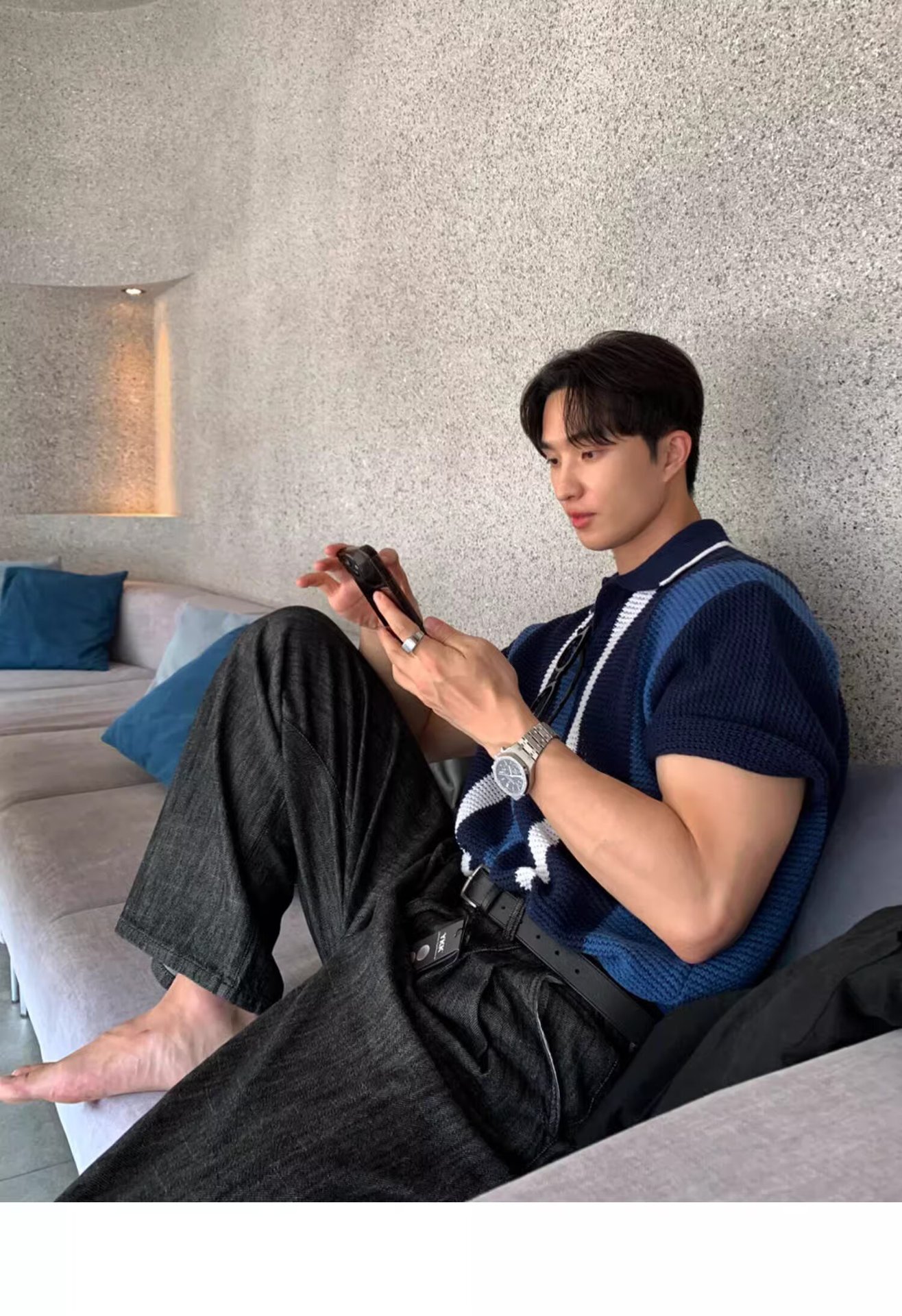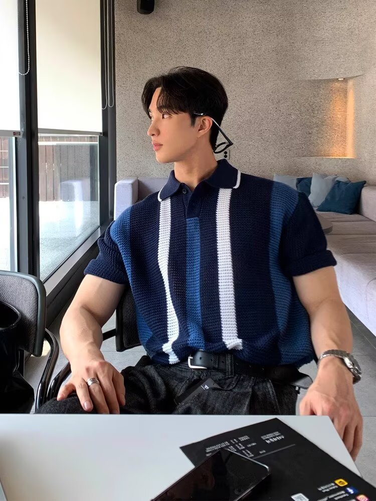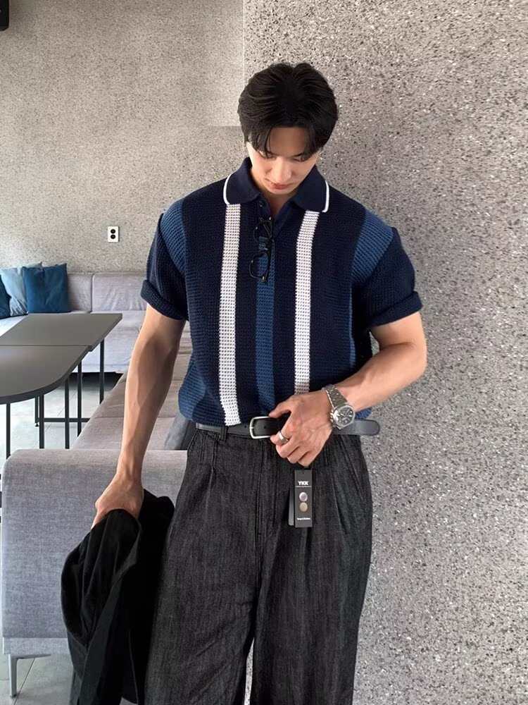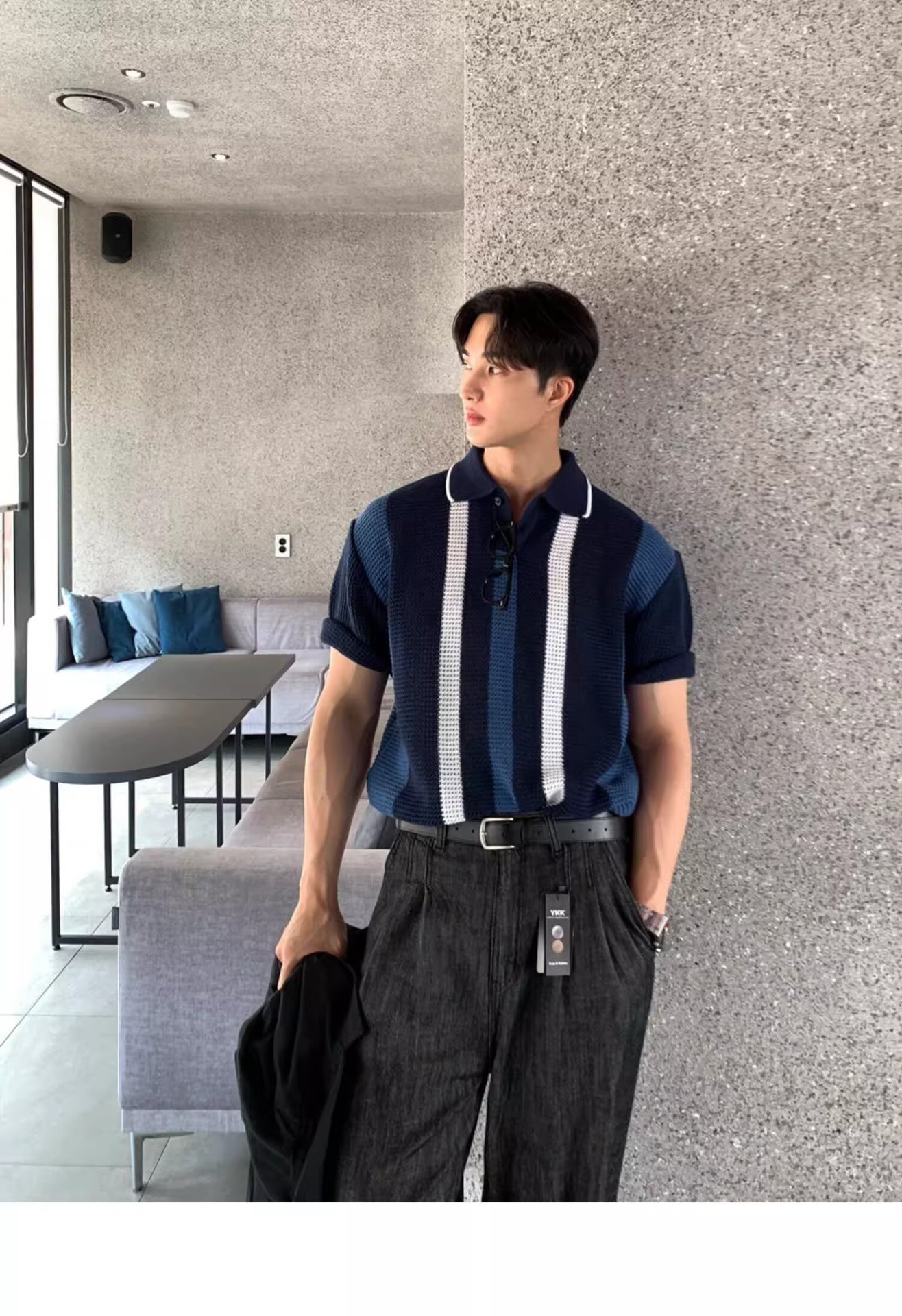 2025 새로운 스타일 우아한 여름 유행 청소년 인기있는 남성 니트 스웨터 예술적 표준 모든 경기 유행 줄무늬 단순 짧은스토어 가기