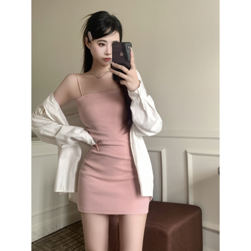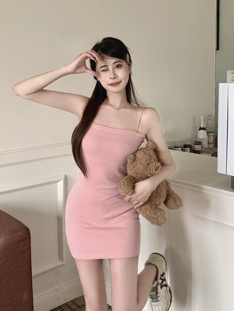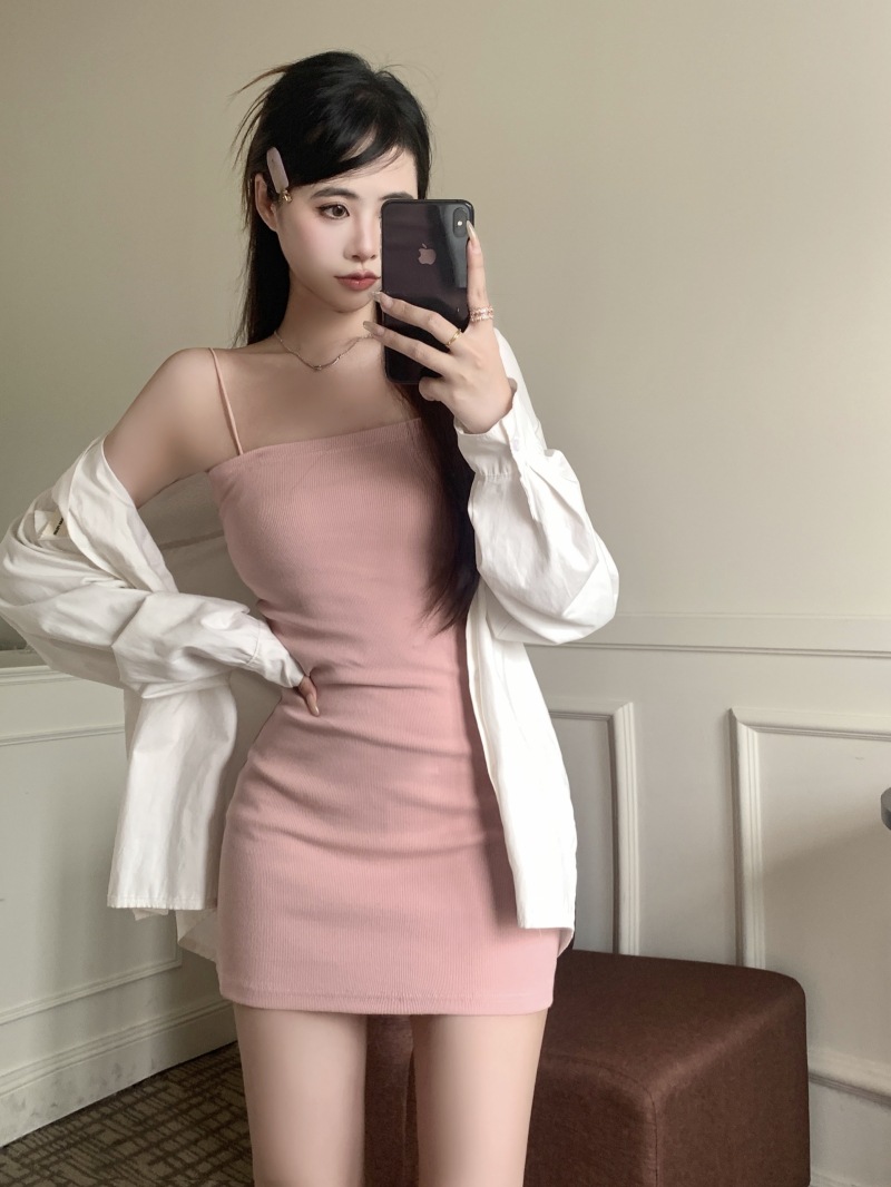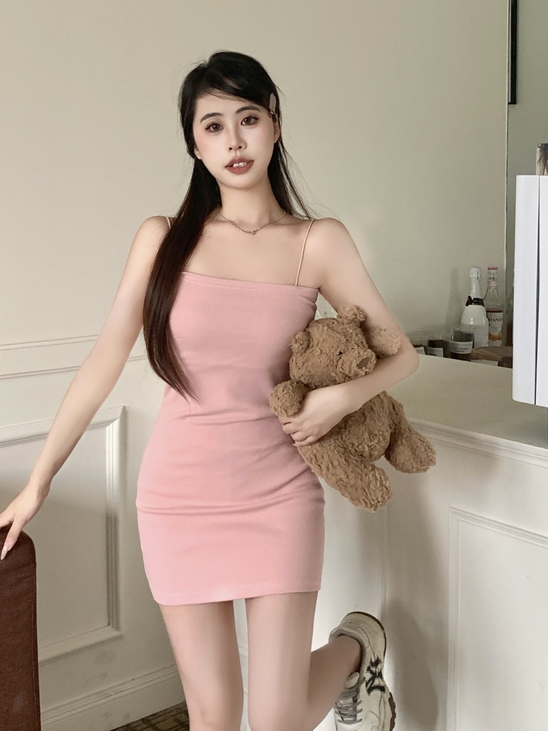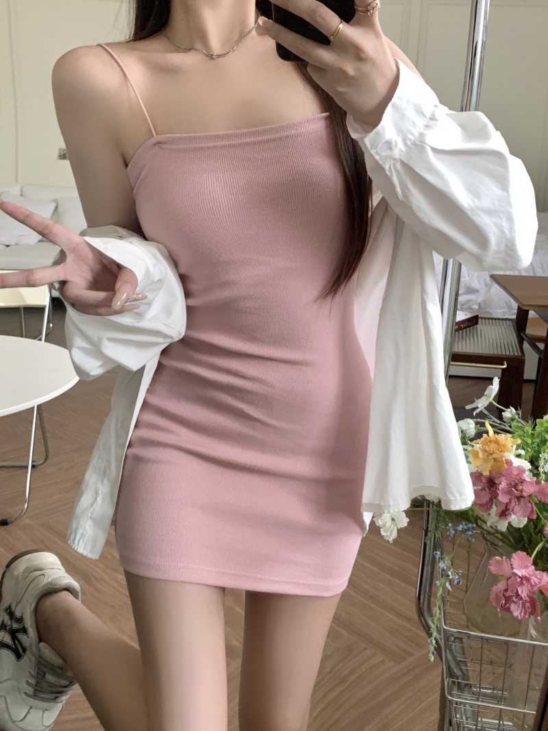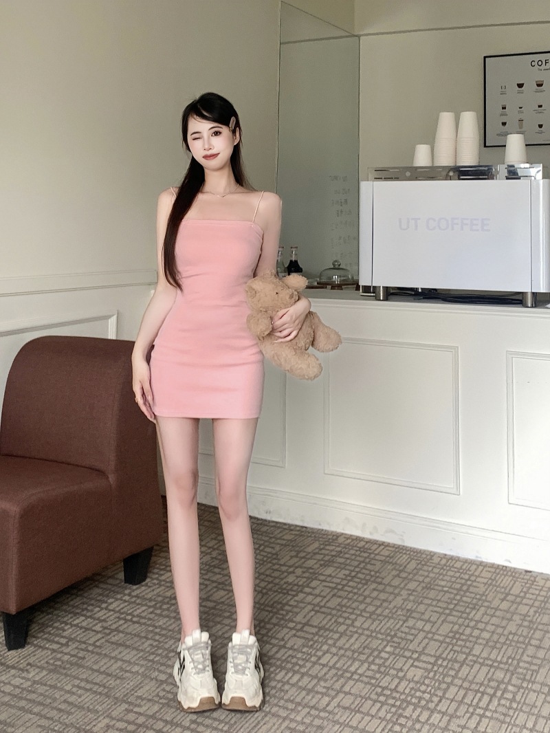 프랑스 스타일 순수한 욕망 스파이스 소녀 순면 슬링 원피스 여성의 우아한 달콤하고 매운 작은 섹시한 핑크 엉덩이 짧은 치마