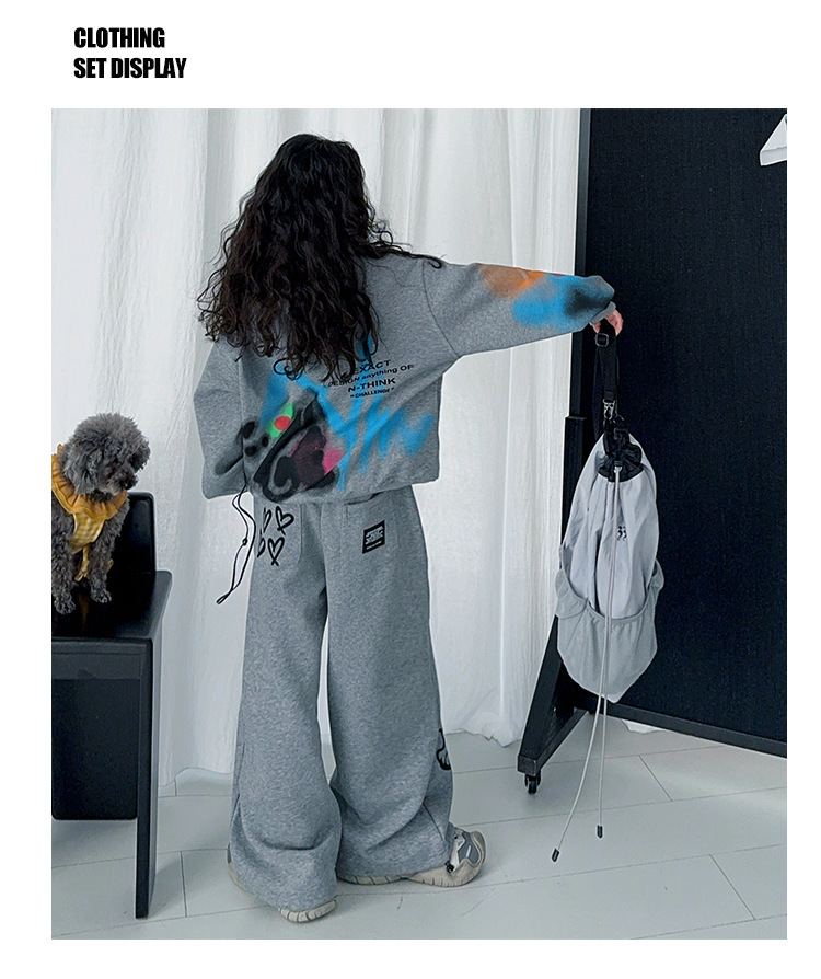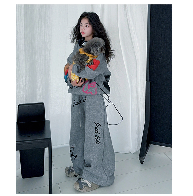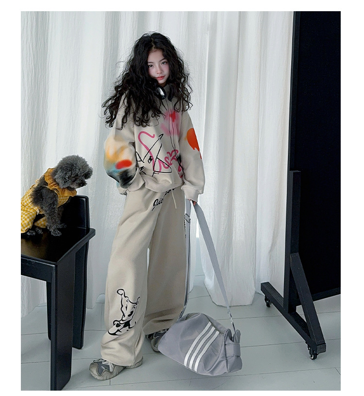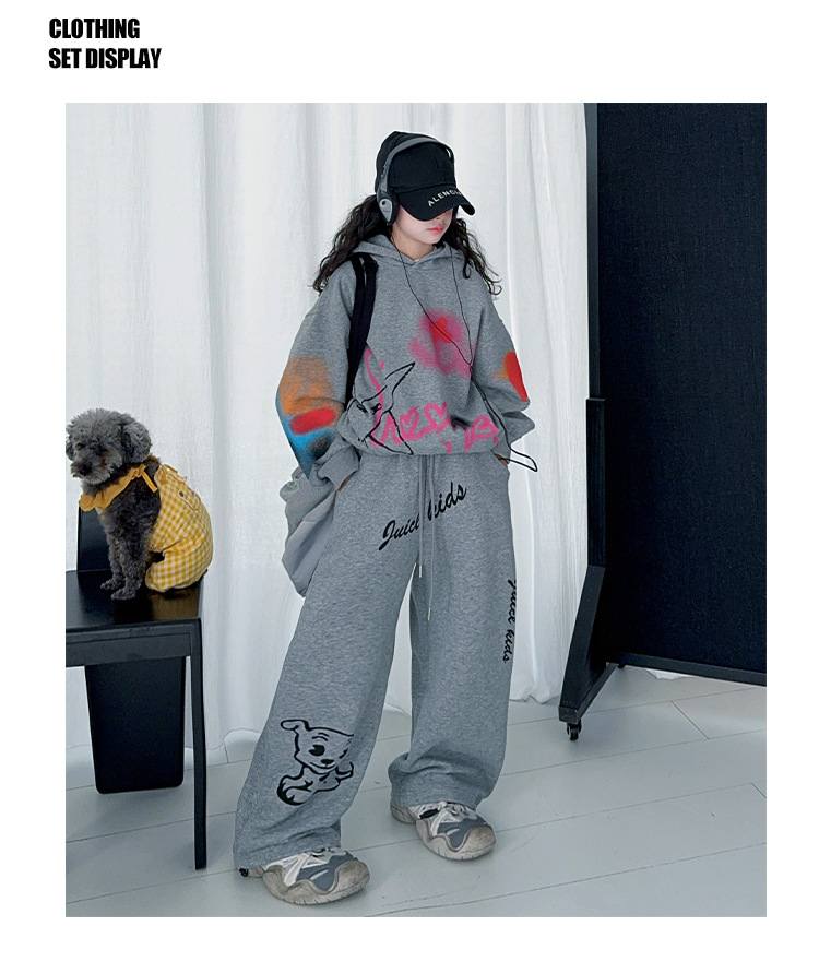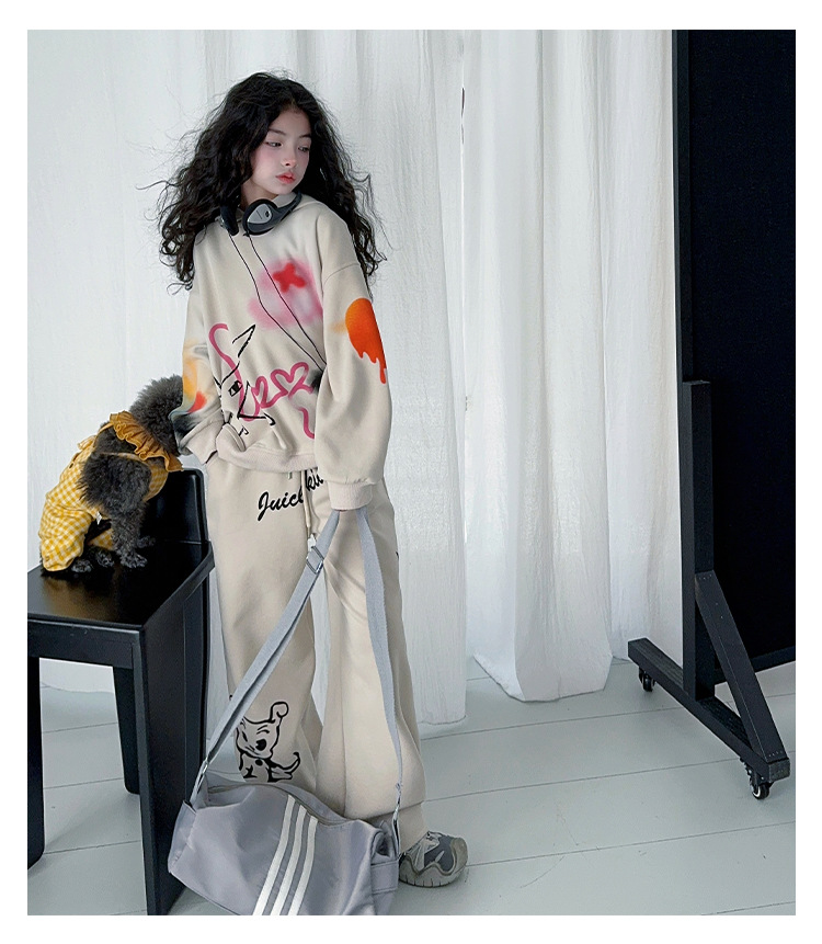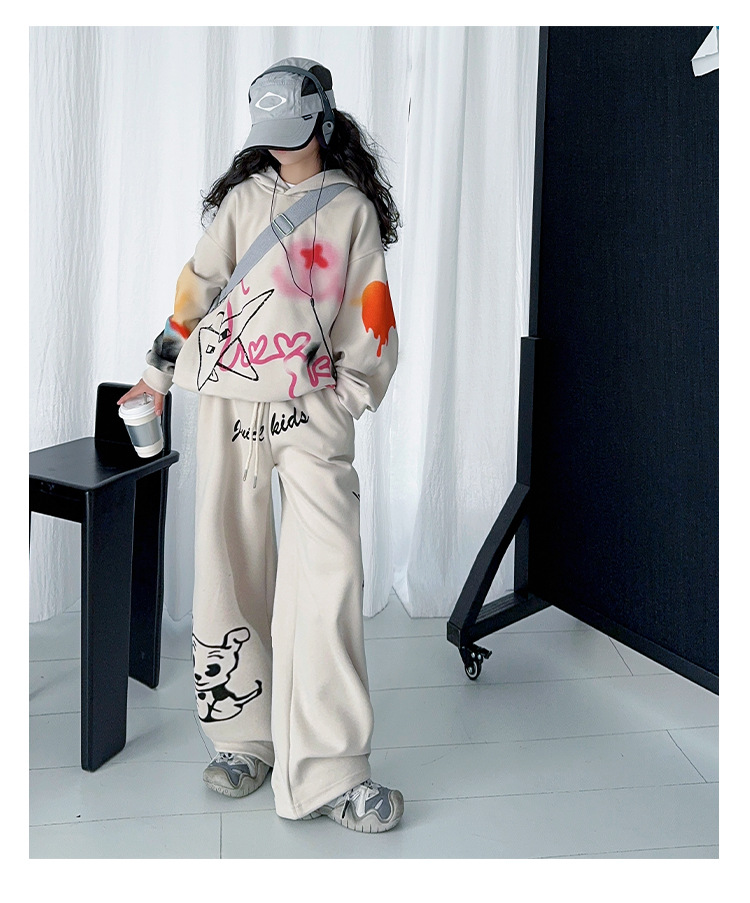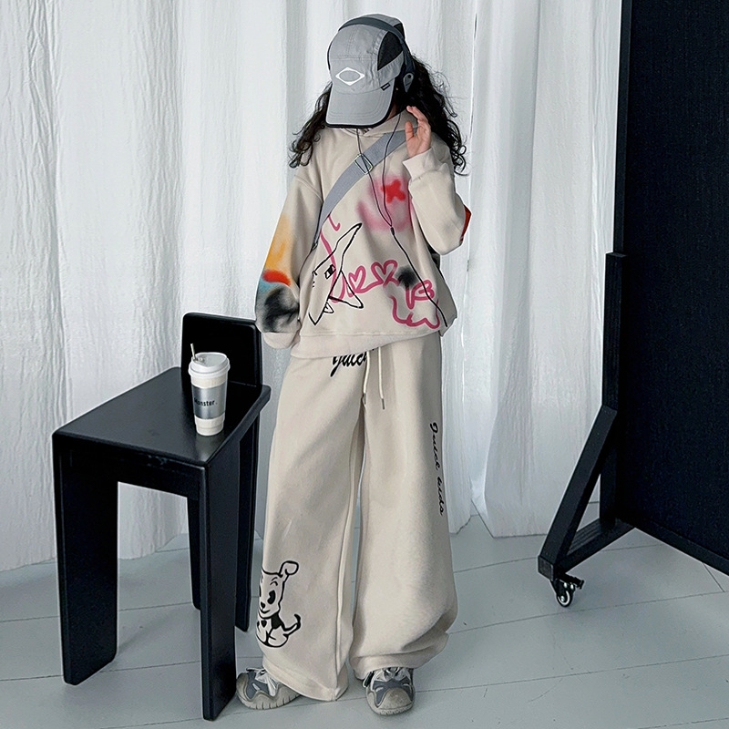 소녀의 봄 원피스 세트 2025 새로운 어린이 봄과 가을 미국 패션 쿨 그래피티 후드 스웨트 셔츠 바지 투피스 세트스토어 가기