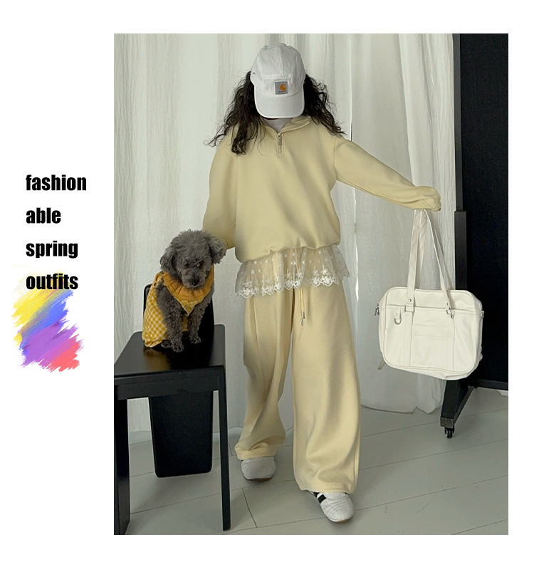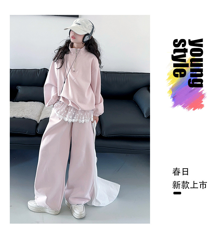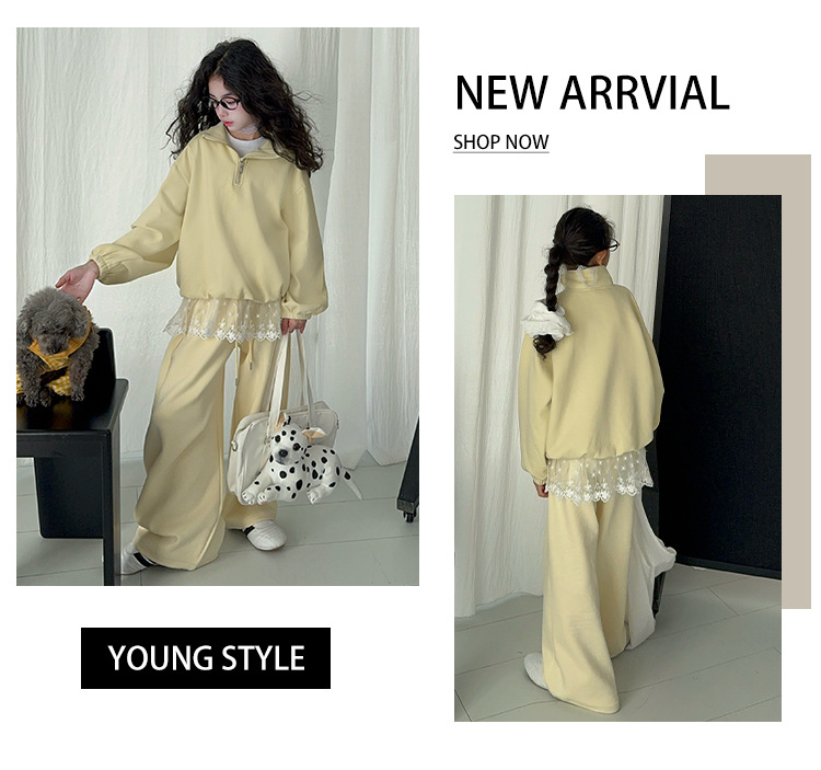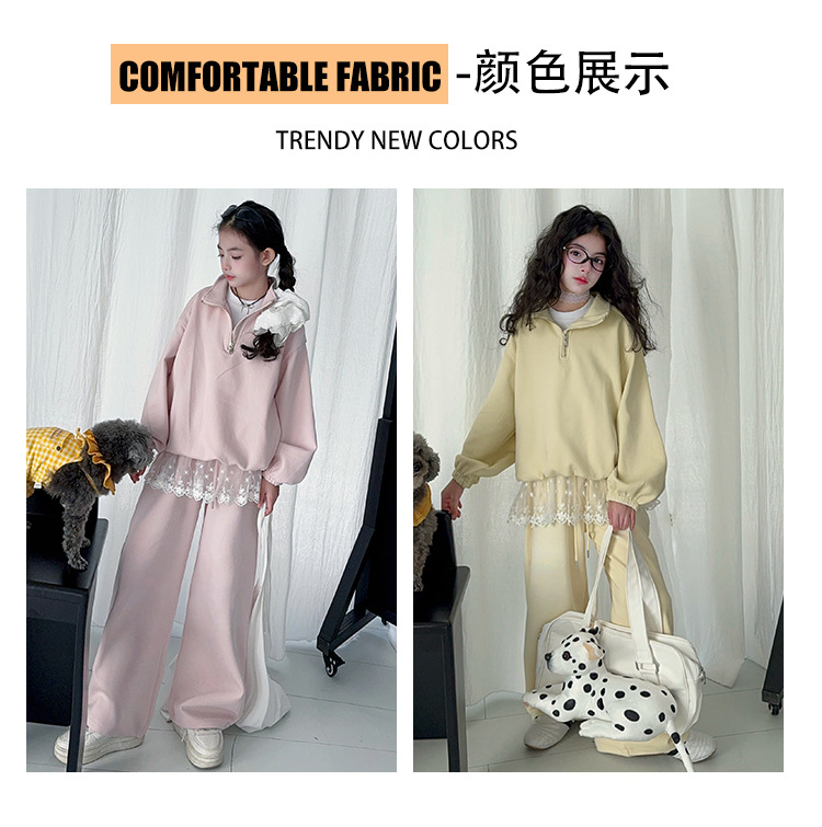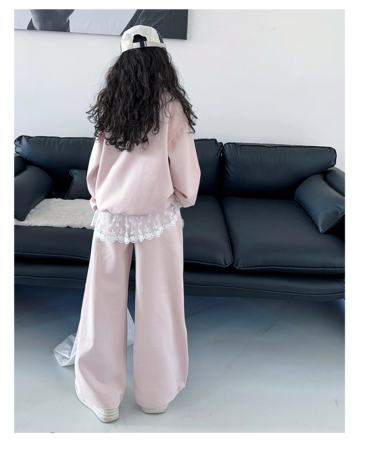 소녀의 봄 원피스 세트 2025 새로운 한국 달콤한 레이스 레이스 수직 칼라 땀 바지 투피스 세트스토어 가기