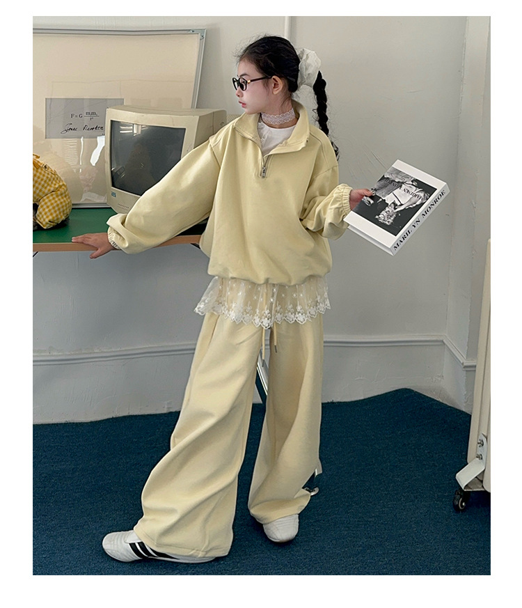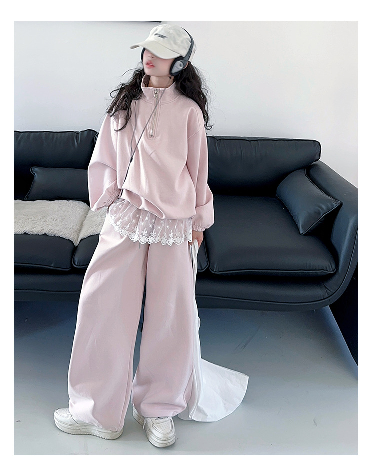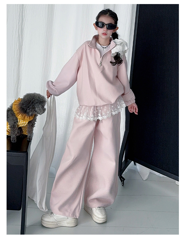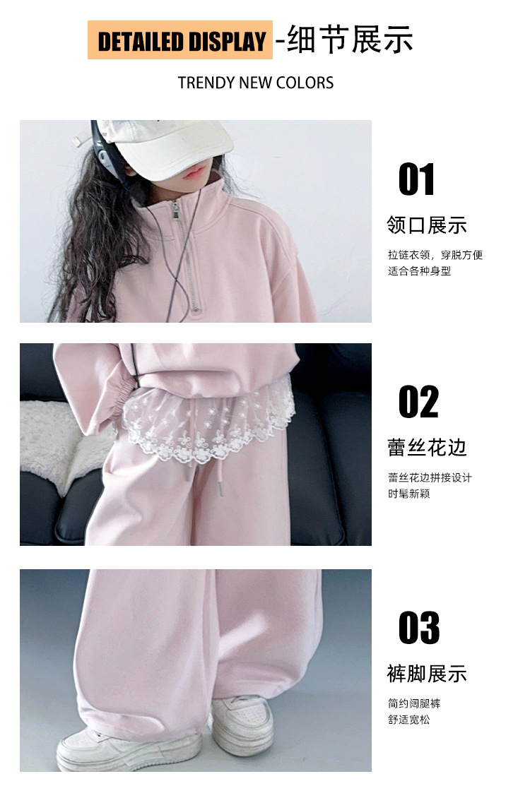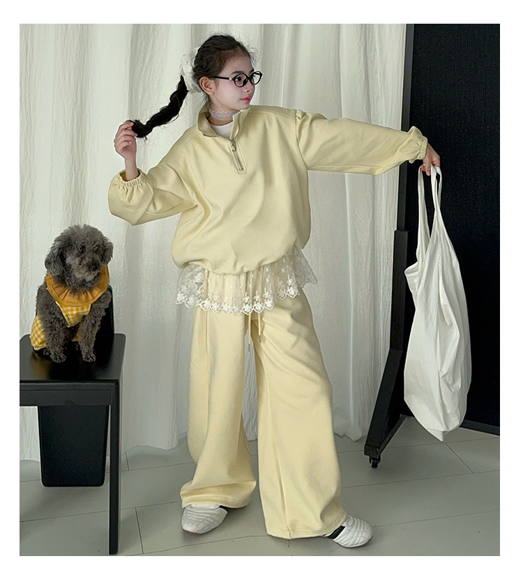 소녀의 봄 원피스 세트 2025 새로운 한국 달콤한 레이스 레이스 수직 칼라 땀 바지 투피스 세트스토어 가기