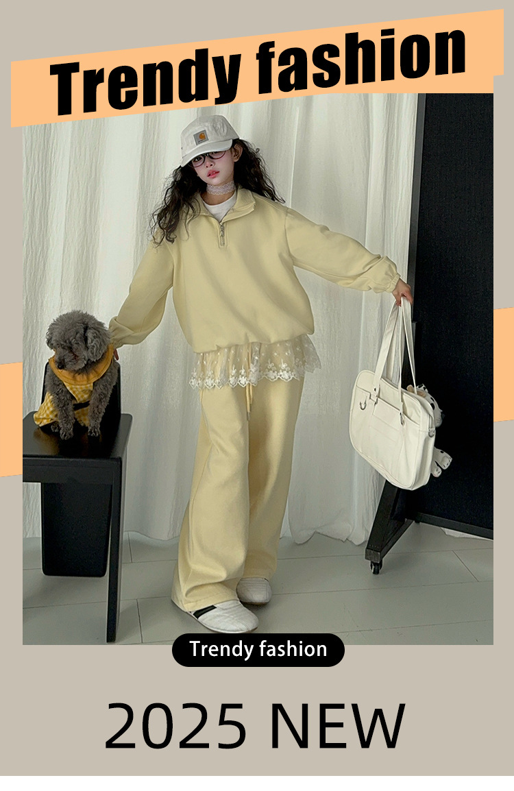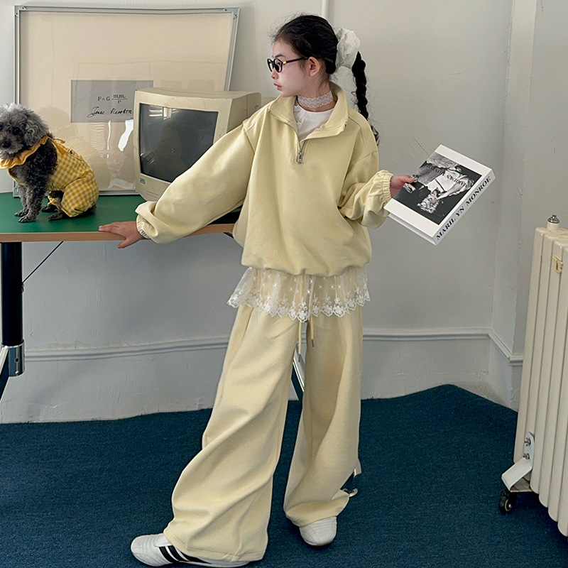 소녀의 봄 원피스 세트 2025 새로운 한국 달콤한 레이스 레이스 수직 칼라 땀 바지 투피스 세트