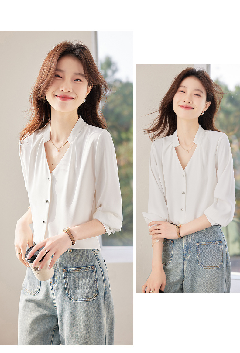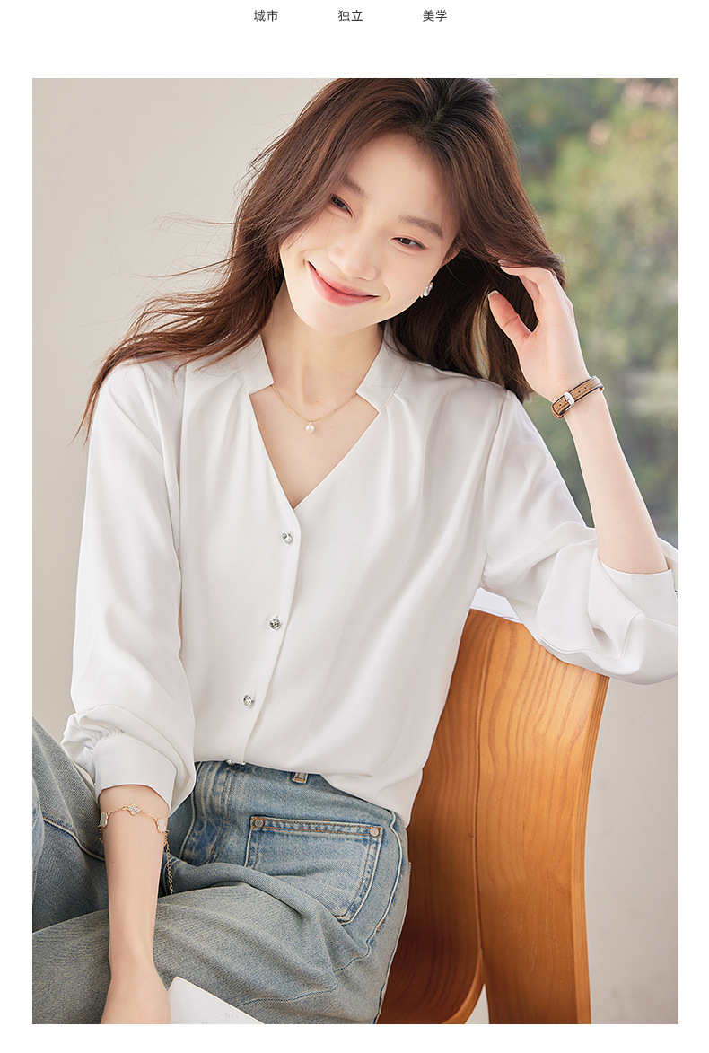화이트 V 넥 셔츠 여성 봄과 가을 2025 새로운 인터뷰 전문 공식 원피스 직장 여성 긴팔 셔츠