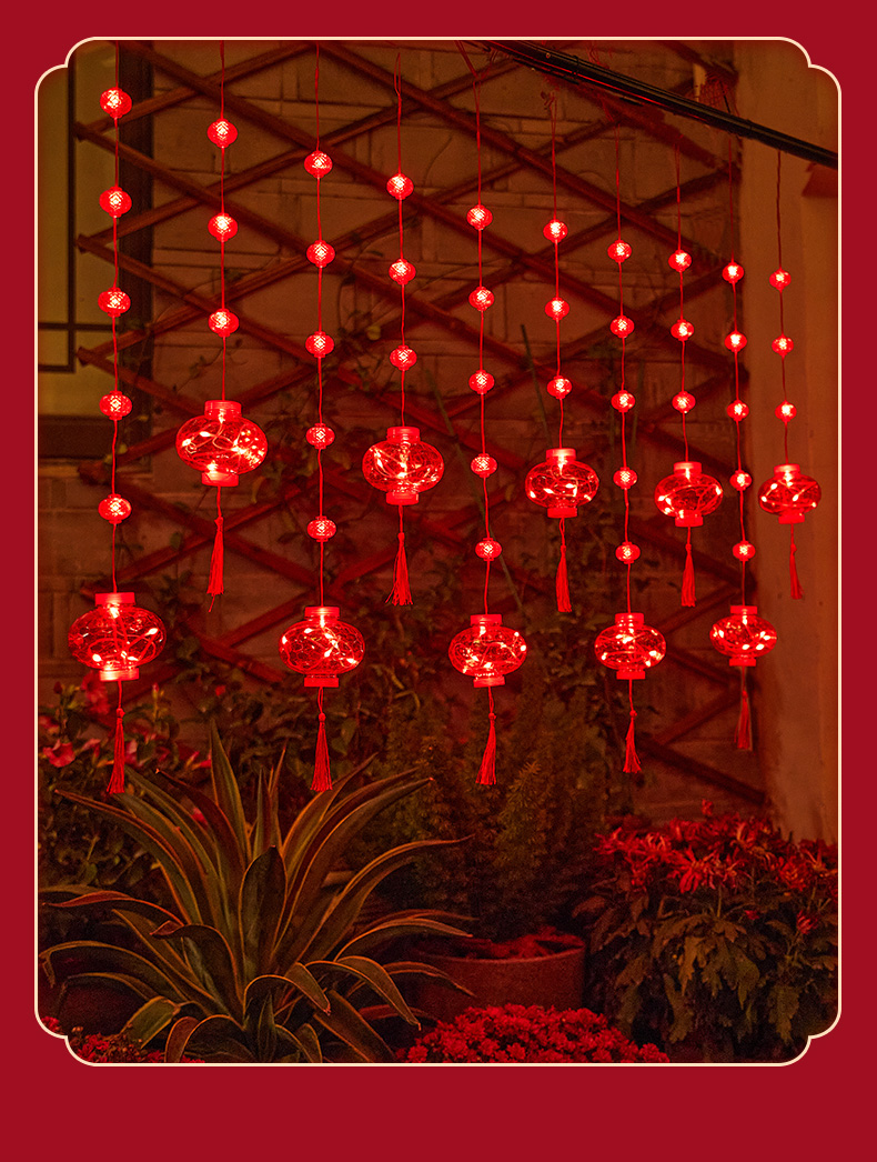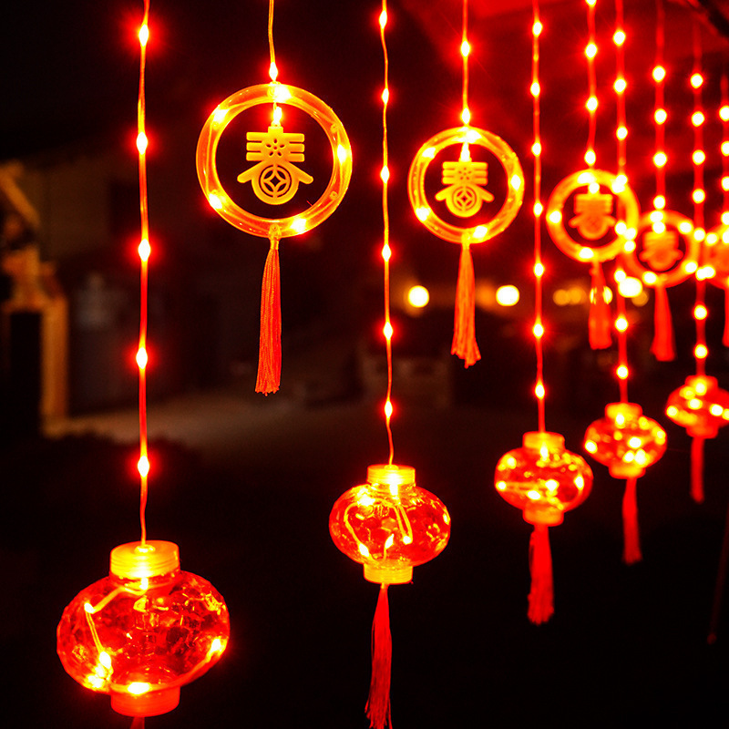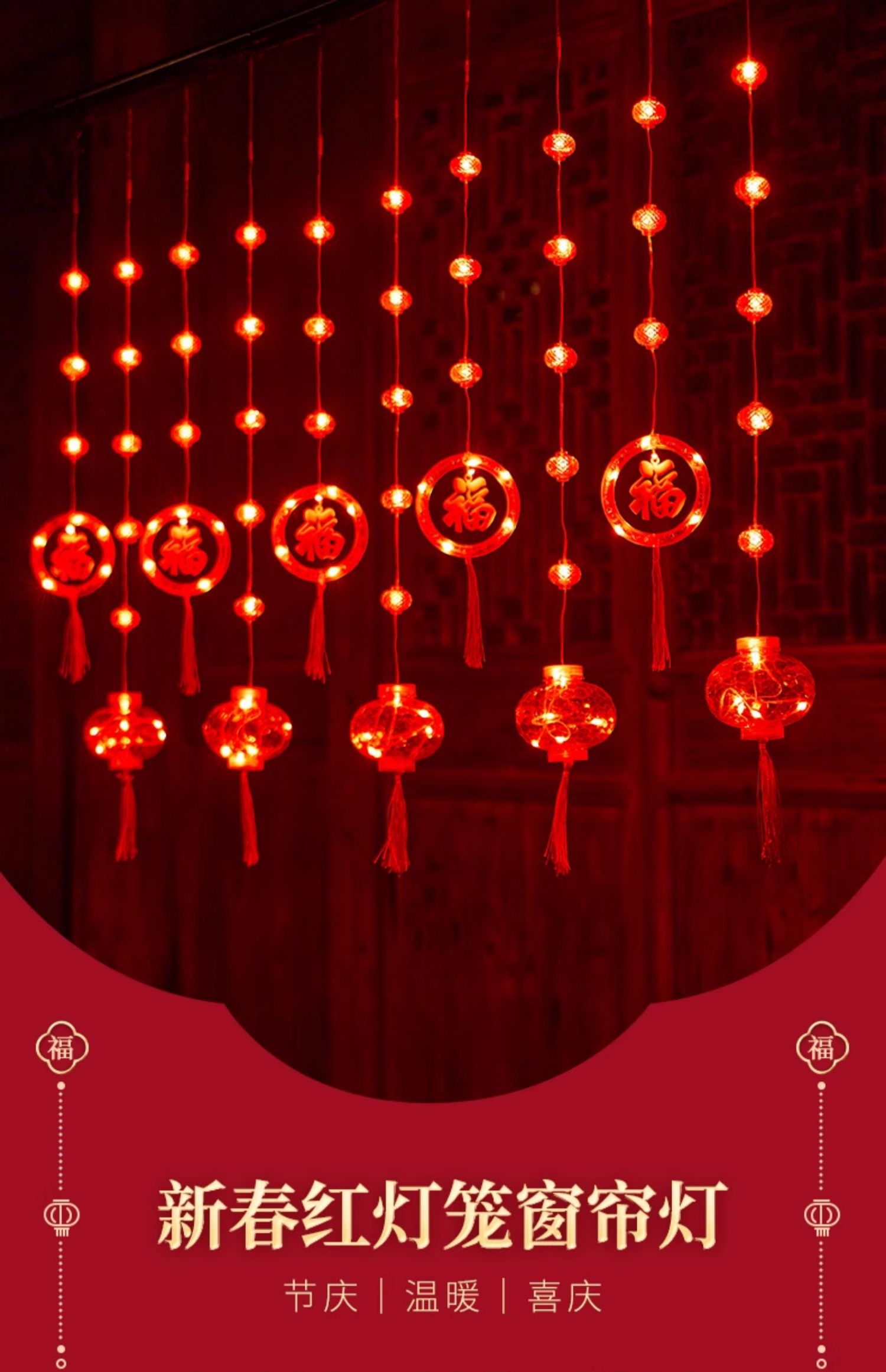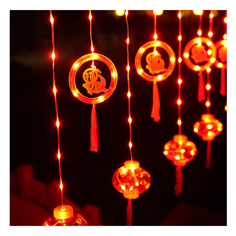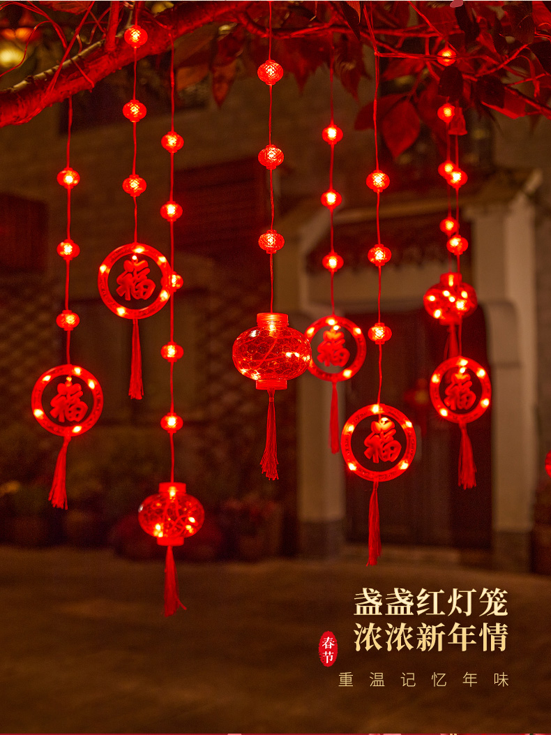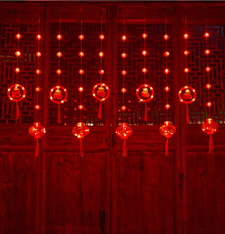 새해 봄 축제 발코니 붉은 등불 등불 등불 끈 장식 led 빛나는 푸 캐릭터 가죽 라인 가벼운 커튼 분위기 빛 끈