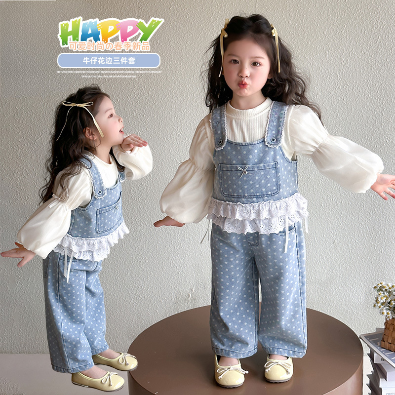 어린이 세트 소녀 한국어 봄 2025 새로운 아기 서양식 레이스 데님 조끼 바지 3 피스 세트 조수스토어 가기